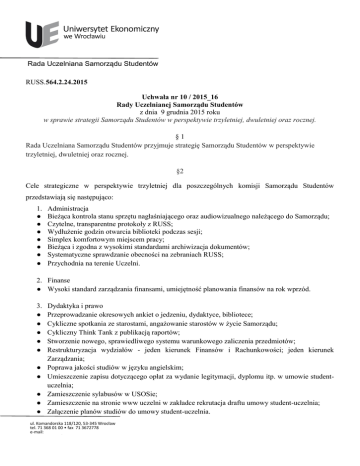 Rada Uczelniana Samorządu Studentów RUSS.564.2.24.2015 Uchwała nr 10 / 2015_16 Rady Uczelnianej Samorządu Studentów z dnia 9 grudnia 2015 roku w sprawie strategii Samorządu Studentów w perspektywie trzyletniej, dwuletniej oraz rocznej. §1 Rada Uczelniana Samorządu Studentów przyjmuje strategię Samorządu Studentów w perspektywie trzyletniej, dwuletniej oraz rocznej. §2 Cele strategiczne w perspektywie trzyletniej dla poszczególnych komisji Samorządu Studentów przedstawiają się następująco: 1. ● ● ● ● ● ● ● Administracja Bieżąca kontrola stanu sprzętu nagłaśniającego oraz audiowizualnego należącego do Samorządu; Czytelne, transparentne protokoły z RUSS; Wydłużenie godzin otwarcia biblioteki podczas sesji; Simplex komfortowym miejscem pracy; Bieżąca i zgodna z wysokimi standardami archiwizacja dokumentów; Systematyczne sprawdzanie obecności na zebraniach RUSS; Przychodnia na terenie Uczelni. 2. Finanse ● Wysoki standard zarządzania finansami, umiejętność planowania finansów na rok wprzód. 3. ● ● ● ● ● ● ● ● ● ● Dydaktyka i prawo Przeprowadzanie okresowych ankiet o jedzeniu, dydaktyce, bibliotece; Cykliczne spotkania ze starostami, angażowanie starostów w życie Samorządu; Cykliczny Think Tank z publikacją raportów; Stworzenie nowego, sprawiedliwego systemu warunkowego zaliczenia przedmiotów; Restrukturyzacja wydziałów - jeden kierunek Finansów i Rachunkowości; jeden kierunek Zarządzania; Poprawa jakości studiów w języku angielskim; Umieszczenie zapisu dotyczącego opłat za wydanie legitymacji, dyplomu itp. w umowie studentuczelnia; Zamieszczenie sylabusów w USOSie; Zamieszczenie na stronie www uczelni w zakładce rekrutacja draftu umowy student-uczelnia; Załączenie planów studiów do umowy student-uczelnia. ul. Komandorska 118/120, 53-345 Wrocław tel. 71 368 01 00 • fax 71 3672778 e-mail: www.ue.wroc.pl Rada Uczelniana Samorządu Studentów 4. ● ● ● ● Kontakty Zewnętrzne Stała współpraca z Członkami Zarządu ds. KZ w JOSSach; Pozyskanie wsparcia finansowego przez komisję w wysokości 35 000 zł; Obecność reprezentanta komisji na FUE oraz PSRP; Patronat firmy zewnętrznej dla jednego z kierunków. 5. HR i Projekty ● Stworzenie ścieżki rozwoju działacza Samorządu; ● Planowanie półroczne wszystkich projektów, zarówno Samorządowych, jak i ROSowych, nieodłączne z planowaniem budżetów na projekty; ● Utrzymanie stałego kontaktu z Członkami Zarządu ds. HR oraz Przewodniczącymi organizacji. 6. Wizerunek i Promocja ● Przeprowadzanie badań marketingowych co najmniej raz na pół roku; ● Rozpoznawalny i renomowany RPS. 7. Współpraca Krajowa i Międzynarodowa ● Pozyskanie środków z co najmniej jednego grantu; ● Zorganizowanie 5-dniowej konferencji z udziałem trzech Uczelni z krajów Unii Europejskiej. §3 Cele strategiczne dla Przewodniczącego Samorządu Studentów w perspektywie trzyletniej przedstawiają się następująco: ● JOSSy w pełni obecne w Samorządzie (spójna promocja, wspólni partnerzy, wspólne inicjatywy); ● Coroczne powiększanie budżetu Samorządu Studentów min. o 2%; ● Spotkanie z Rektorem oraz Kanclerzem co najmniej 1 raz w miesiącu. §4 Cele strategiczne dla Rad Mieszkańców w perspektywie trzyletniej przedstawiają się następująco: ● Cykliczne spotkania z władzami akademików. ul. Komandorska 118/120, 53-345 Wrocław tel. 71 368 01 00 • fax 71 3672778 e-mail: www.ue.wroc.pl Rada Uczelniana Samorządu Studentów §5 Cele strategiczne dla Członka Zarządu ds. Strategii w perspektywie trzyletniej przedstawiają się następująco: ● Monitorowanie strategii JOSSów i nadzór nad pracą JOSSów. §6 Cele strategiczne w perspektywie dwuletniej dla poszczególnych komisji Samorządu Studentów przedstawiają się następująco: 1. Administracja ● Wdrożenie nowego regulaminu ROS. 2. Kontakty Zewnętrzne ● Skupienie się na dedykowanych akcjach marketingowych we współpracy z partnerami finansowymi; ● Zwiększenie budżetu Ekonomaliów o 20%; ● Stworzenie trzech kierunków we współpracy z korporacjami; ● Finansowy partner strategiczny, wspierający Samorząd kwotą co najmniej 35000 PLN. 3. HR i Projekty ● Przekazywanie wiedzy pomiędzy pokoleniami - zarządzanie wiedzą; ● 6 nowych projektów merytorycznych. 4. Wizerunek i Promocja: ● Zwiększenie liczby polubień na fanpage'u RUSS do 7000; ● Skupienie na promocji regulaminów, ankiet, praw studenta i zwiększaniu świadomości studentów o w/w; ● Frekwencja wyborcza w wyborach do RUSS/RW/Senatu wynosząca co najmniej 35% ogółu studentów. §7 Cele strategiczne dla Rad Mieszkańców w perspektywie dwuletniej przedstawiają się następująco: ● Reforma Rad Mieszkańców, tworzenie planu następstw. §8 Cele strategiczne w perspektywie rocznej dla poszczególnych komisji Samorządu Studentów przedstawiają się następująco: ul. Komandorska 118/120, 53-345 Wrocław tel. 71 368 01 00 • fax 71 3672778 e-mail: www.ue.wroc.pl Rada Uczelniana Samorządu Studentów 1. Administracja ● Zapewnienie rękawiczek ochronnych na labolatoriach chemicznych dla każdego studenta wydziału IE; ● Zapewnienie nowego pomieszczenie do pracy dla Samorządu Studentów; ● Stworzenie nowego magazynu i nowej kuchni w biurze Samorządu; ● Usystematyzowanie i uporządkowanie dokumentacji archiwalnej i bieżącej; ● Oznaczenie punktu pierwszej pomocy na kampusie UE; ● Utrzymanie dobrej współpracy z firmą Scanmed; ● Zatrudnienie osoby odpowiedzialnej za sprzątanie biura Samorządu Studentów; ● Rzetelne stworzenie list mailingowych; ● Bieżąca współpraca z Członkami Zarządu ds. Administracji w JOSSach. 2. Finanse ● Poprawne rozliczenie kluczowych projektów (Ekonomalia, Mosty Ekonomiczne, Gala Studenta, Adapciak, Integrator, Dni Adaptacyjne) w terminie trzech miesięcy od daty zakończenia projektu; ● Poprawne rozliczenie pozostałych