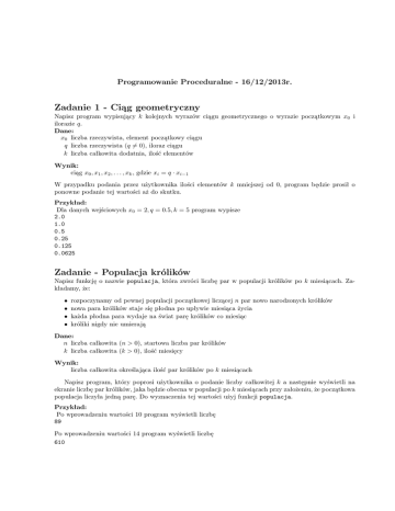 Programowanie Proceduralne - 16/12/2013r. Zadanie 1 - Ciąg geometryczny Napisz program wypisujący k kolejnych wyrazów ciągu geometrycznego o wyrazie początkowym x0 i ilorazie q. Dane: x0 liczba rzeczywista, element początkowy ciągu q liczba rzeczywista (q 6= 0), iloraz ciągu k liczba całkowita dodatnia, ilość elementów Wynik: ciąg x0 , x1 , x2 , . . . , xk , gdzie xi = q · xi−1 W przypadku podania przez użytkownika ilości elementów k mniejszej od 0, program będzie prosił o ponowne podanie tej wartości aż do skutku. Przykład: Dla danych wejściowych x0 = 2, q = 0.5, k = 5 program wypisze 2.0 1.0 0.5 0.25 0.125 0.0625 Zadanie - Populacja królików Napisz funkcję o nazwie populacja, która zwróci liczbę par w populacji królików po k miesiącach. Zakładamy, że: • • • • rozpoczynamy od pewnej populacji początkowej liczącej n par nowo narodzonych królików nowa para królików staje się płodna po upływie miesiąca życia każda płodna para wydaje na świat parę królików co miesiąc króliki nigdy nie umierają Dane: n liczba całkowita (n > 0), startowa liczba par królików k liczba całkowita (k > 0), ilość miesięcy Wynik: liczba całkowita określająca ilość par królików po k miesiącach Napisz program, który poprosi użytkownika o podanie liczby całkowitej k a następnie wyświetli na ekranie liczbę par królików, jaka będzie obecna w populacji po k miesiącach przy założeniu, że początkowa populacja liczyła jedną parę. Do wyznaczenia tej wartości użyj funkcji populacja. Przykład: Po wprowadzeniu wartości 10 program wyświetli liczbę 89 Po wprowadzeniu wartości 14 program wyświetli liczbę 610
