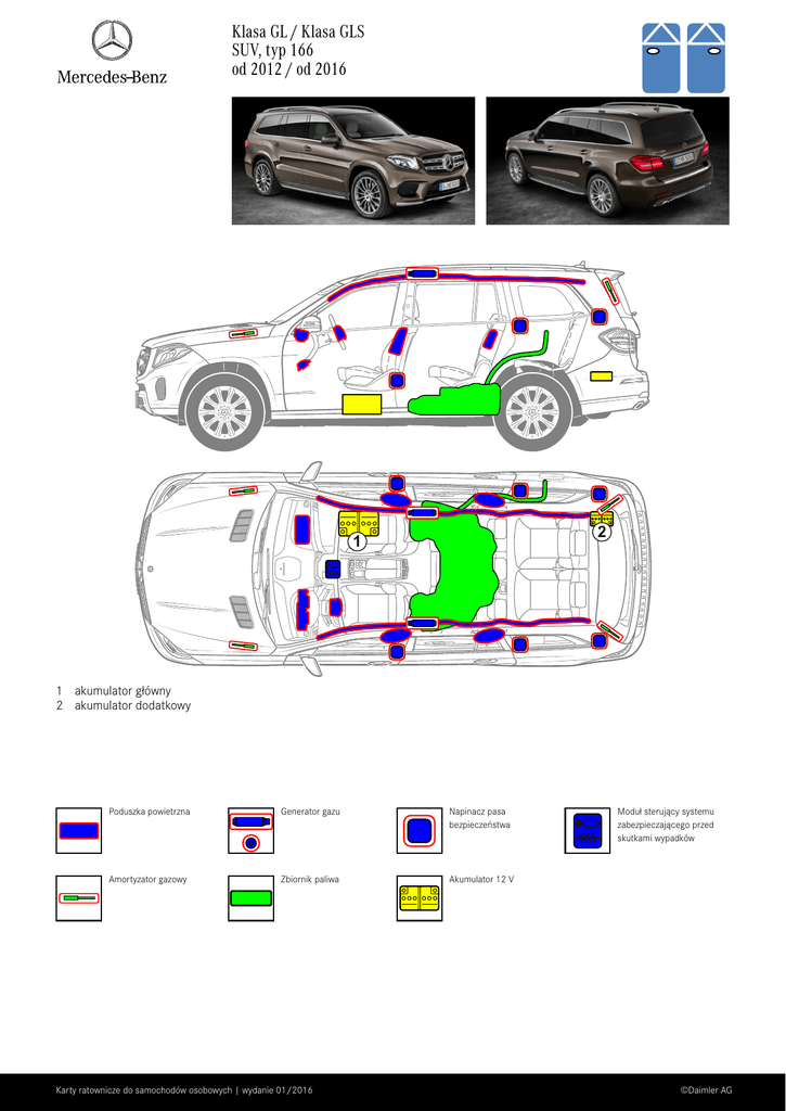 Klasa GL / Klasa GLS SUV, typ 166 od 2012 / od 2016 2 1 1 akumulator główny 2 akumulator dodatkowy Poduszka powietrzna Generator gazu Napinacz pasa bezpieczeństwa Amortyzator gazowy Zbiornik paliwa Akumulator 12 V Karty ratownicze do samochodów osobowych | wydanie 01/2016 Moduł sterujący systemu zabezpieczającego przed skutkami wypadków ©Daimler AG