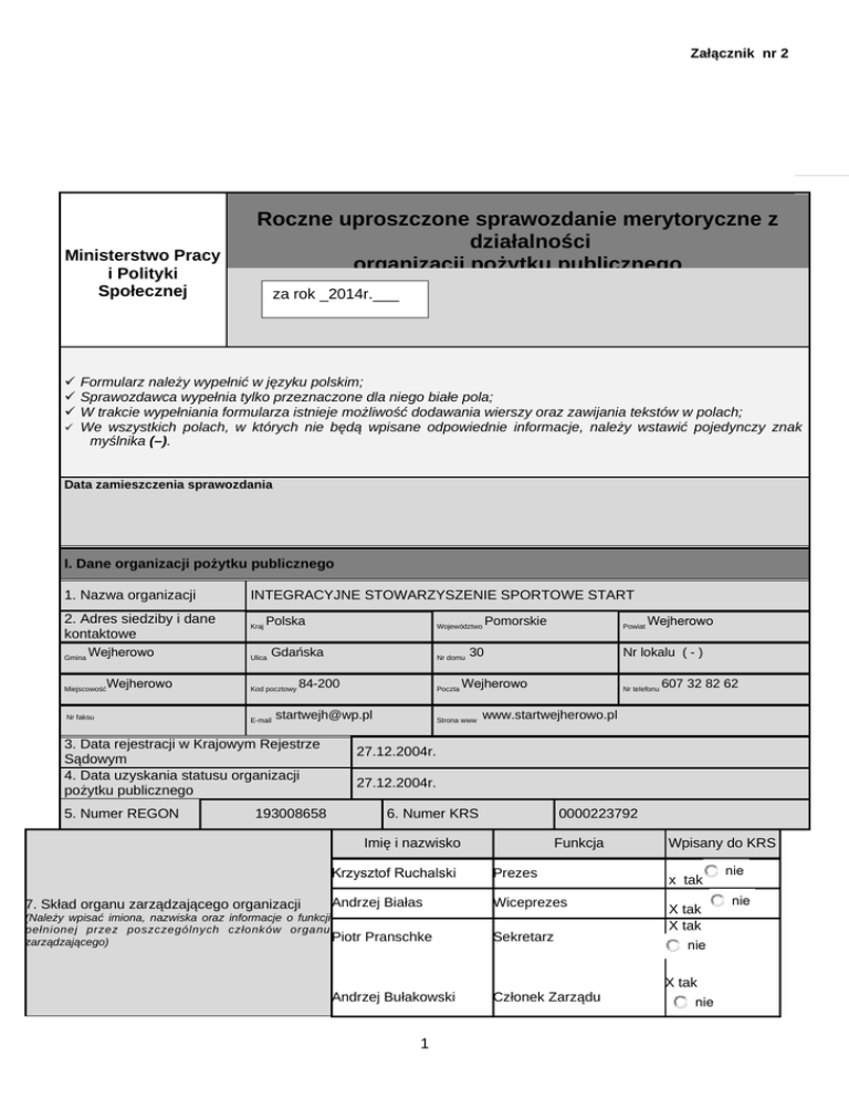 Załącznik nr 2 Ministerstwo Pracy i Polityki Społecznej Roczne uproszczone sprawozdanie merytoryczne z działalności organizacji pożytku publicznego za rok _2014r.___ Formularz należy wypełnić w języku polskim; Sprawozdawca wypełnia tylko przeznaczone dla niego białe pola; W trakcie wypełniania formularza istnieje możliwość dodawania wierszy oraz zawijania tekstów w polach; We wszystkich polach, w których nie będą wpisane odpowiednie informacje, należy wstawić pojedynczy znak myślnika (–). Data zamieszczenia sprawozdania I. Dane organizacji pożytku publicznego 1. Nazwa organizacji INTEGRACYJNE STOWARZYSZENIE SPORTOWE START 2. Adres siedziby i dane kontaktowe Kraj Gmina Wejherowo Miejscowość Wejherowo Nr faksu Polska Ulica Gdańska Kod pocztowy E-mail 5. Numer REGON Nr domu 84-200 Poczta [email protected] 3. Data rejestracji w Krajowym Rejestrze Sądowym 4. Data uzyskania statusu organizacji pożytku publicznego Pomorskie Województwo 30 Nr lokalu ( - ) Wejherowo Strona www Wejherowo Nr telefonu 607 32 82 62 www.startwejherowo.pl 27.12.2004r. 27.12.2004r. 193008658 6. Numer KRS 0000223792 Imię i nazwisko 7. Skład organu zarządzającego organizacji Powiat Funkcja Krzysztof Ruchalski Prezes Andrzej Białas Wiceprezes (Należy wpisać imiona, nazwiska oraz informacje o funkcji pełnionej przez poszczególnych członków organu Piotr zarządzającego) Pranschke Andrzej Bułakowski 1 Sekretarz Członek Zarządu Wpisany do KRS x tak X tak X tak nie X tak nie nie nie Załącznik nr 2 Imię i nazwisko 8. Skład organu kontroli lub nadzoru organizacji Mirosław Odyniecki (Należy wpisać imiona, nazwiska oraz informacje o funkcji pełnionej przez poszczególnych członków organu kontroli Jan lub nadzoru) Funkcja Przewodniczący Zębko Zastępca Henryk Ptach Sekretarz II. Charakterystyka działalności organizacji pożytku publicznego w okresie sprawozdawczym 1.Opis działalności pożytku publicznego 2 Wpisany do KRS X tak X tak X tak nie nie nie Załącznik nr 2 DZIAŁALNOŚĆ SPORTOWA:( więcej czytaj na naszej stronie: www.startwejherowo.pl) W naszym Stowarzyszeniu działają 3 sekcje: - tenisa stołowego - szachowa - boccia A. Zajęcia popołudniowe – treningi Systematyczne zajęcia sportowo-rekreacyjne były prowadzone: 1. Tenis stołowy: 10 godzin w tygodniu i tak: - sport powszechny : wtorki i czwartki w godz. 17.00 – 21.00 oraz w niedziele w godz. 09.00-11.00. Zajęcia na 6 stołach prowadziła Kadra szkoleniowo-instruktorska ( zatrudnieni i wolontariusze): Zbigniew Bautembach, Tomasz Miks ,Krzysztof Ruchalski, Waldemar Moska i Jarosław Greszta 2) 1.1. Opis głównych działań podjętych przez organizację Szachy zajęcia treningowe odbywają się we wtorki w godz.17.00-19.00 oraz w miarę potrzeb w czwartki w godz. 17.00-19.00 w siedzibie Stowarzyszenia , a prowadził je kwalifikowany instruktor – Zygmunt Wielecki. 3)Boccia – 4 godz. w tygodniu i tak: instruktor Genowefa Lenda, która przy współpracy wolontariusza Leszka Lendy prowadziła systematyczne zajęcia – soboty w godz. 10.00-12.00 oraz niedziele w godz.11.00-13.00. B) Imprezy sportowe I .Imprezy własne (ogółem 10 – osobo startów 239 ) I .Imprezy udziałowe (ogółem 12 – osobo startów 60 )-najważniejsze starty to: Tenis stołowy Indywidualne Mistrzostwa Polski Niepełnosprawnych ( Pleszew.) III miejsce (brązowy medal) Gabriela Andrzejewska Boccia Międzynarodowe Zawody –Konopiska k/Częstochowy -1m . drużynowo Ogólnopolskie Turnieje w Mauszu i Grudziądzu – 1m. drużynowo SZACHY Mistrzostwa Polski Niepełnosprawnych (Gorzów Wlk.20-22.09.) Szachy szybkie: I miejsce indywidualnie( złoty medal) Zygmunt Wielecki, 2 m. miejsce drużynowo.(Zygmunt Wielecki, Krzysztof Jurkiewicz i Tadeusz Panek ) Szachy błyskawiczne: 3m.indywidualnie Krzysztof Jurkiewicz i 2m. drużynowo 3 Załącznik nr 2 najbliższe sąsiedztwo (osiedle, dzielnica, sołectwo, wieś, przysiółek) 1.2. Zasięg terytorialny faktycznie prowadzonej przez organizację działalności pożytku publicznego gmina województwo kilka gmin kilka województw (Należy wskazać jedną lub więcej pozycji) powiat ✘ kilka powiatów cały kraj poza granicami kraju 2. Informacja dotycząca liczby odbiorców działań organizacji pożytku publicznego w okresie sprawozdawczym 2.1. Liczba odbiorców działań organizacji (Należy oszacować liczbę odbiorców działań organizacji w okresie sprawozdawczym, w podziale na osoby fizyczne i osoby prawne) Osoby fizyczne 58 Osoby prawne (-) 2.2. Informacje na temat innych (niż wymienionych w pkt 2.1) odbiorców, na rzecz których organizacja działała (-) (Np. zwierzęta, zabytki) 3. Informacja dotycząca przedmiotu działalności nieodpłatnej pożytku publicznego organizacji w okresie sprawozdawczym X tak 3.1. Organizacja prowadziła działalność nieodpłatną pożytku publicznego nie Sfera działalności pożytku Przedmiot działalności publicznego 3.2. Należy wskazać nie więcej niż trzy najważniejsze, SPORT, REHABILITACJA, pod względem wielkości wydatkowanych środków, sfery ZAJĘCIA POPOŁUDNIOWE, REKREACJA OSÓB działalności pożytku publicznego, o których mowa w art. 4 TRENINGI W SEKCJACH NIEPEŁNOSPRAWNYCH ust.1 ustawy z dnia 24 kwietnia 2003 r. o działalności SPORT, REHABILITACJA, pożytku publicznego i o wolontariacie (Dz. U. z 2010 r. Nr ORGANIZACJA IMPREZ 234, poz. 1536, z późn. zm.), zaczynając od REKREACJA OSÓB SPORTOWYCH najważniejszej wraz z odnoszącym się do nich NIEPEŁNOSPRAWNYCH przedmiotem działalności SPORT, REHABILITACJA, UDZIAŁ W ZAWODACH REKREACJA OSÓB SPORTOWYCH NIEPEŁNOSPRAWNYCH 4. Informacja dotycząca przedmiotu działalności odpłatnej pożytku publicznego organizacji w okresie sprawozdawczym 4.1. Organizacja prowadziła działalność odpłatną pożytku publicznego Sfera działalności pożytku publicznego 4 tak X nie Przedmiot działalności Załącznik nr 2 4.2. Należy wskazać nie więcej niż trzy najważniejsze,