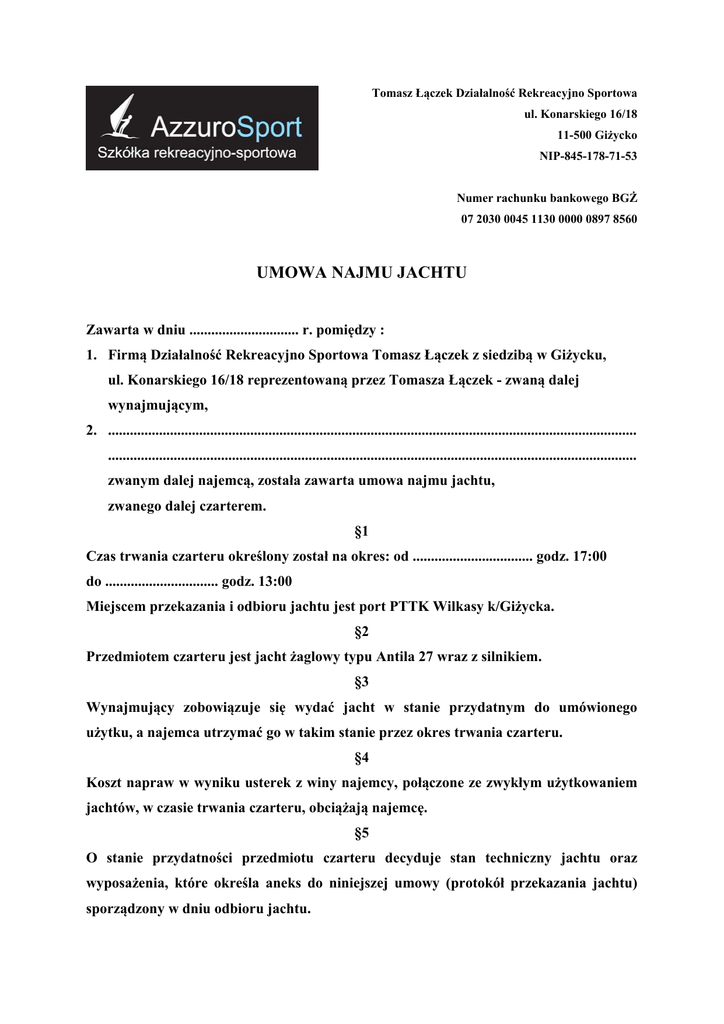 Tomasz Łączek Działalność Rekreacyjno Sportowa ul. Konarskiego 16/18 11-500 Giżycko NIP-845-178-71-53 Numer rachunku bankowego BGŻ 07 2030 0045 1130 0000 0897 8560 UMOWA NAJMU JACHTU Zawarta w dniu .............................. r. pomiędzy : 1. Firmą Działalność Rekreacyjno Sportowa Tomasz Łączek z siedzibą w Giżycku, ul. Konarskiego 16/18 reprezentowaną przez Tomasza Łączek - zwaną dalej wynajmującym, 2. ................................................................................................................................................. ................................................................................................................................................. zwanym dalej najemcą, została zawarta umowa najmu jachtu, zwanego dalej czarterem. §1 Czas trwania czarteru określony został na okres: od ................................. godz. 17:00 do ............................... godz. 13:00 Miejscem przekazania i odbioru jachtu jest port PTTK Wilkasy k/Giżycka. §2 Przedmiotem czarteru jest jacht żaglowy typu Antila 27 wraz z silnikiem. §3 Wynajmujący zobowiązuje się wydać jacht w stanie przydatnym do umówionego użytku, a najemca utrzymać go w takim stanie przez okres trwania czarteru. §4 Koszt napraw w wyniku usterek z winy najemcy, połączone ze zwykłym użytkowaniem jachtów, w czasie trwania czarteru, obciążają najemcę. §5 O stanie przydatności przedmiotu czarteru decyduje stan techniczny jachtu oraz wyposażenia, które określa aneks do niniejszej umowy (protokół przekazania jachtu) sporządzony w dniu odbioru jachtu. §6 Najemca oświadcza, iż posiada stosowne uprawnienia do prowadzenia jachtu, lub osoba posiadająca takie uprawnienia będzie znajdowała się w załodze jachtu. §7 W przypadku nie dotrzymania warunków punktu §6, najemca ponosi pełną odpowiedzialność administracyjną, karną i materialną za powstałe wypadki i straty. §8 Najemca odpowiedzialny jest względem wynajmującego za szkodę powstałą w czasie trwania czarteru do wysokości nie pokrytej odszkodowaniem wypłaconym przez ubezpieczyciela o ile szkoda ta powstała w wyniku błędu popełnionego przez najemcę. Szkody powstałe w wyniku działalności zdarzeń losowych oraz osób trzecich pokrywa ubezpieczenie w zakresie określonym polisą ubezpieczeniową. W pozostałych przypadkach szkody na rzecz najemcy jak również wynajmującego pokrywają osoby trzecie. §9 Wynajmujący otrzyma czynsz za czarter jachtu w wysokości ................. zł. najpóźniej w dniu odbioru jachtu przez najemcę. §10 Najemca zobowiązany jest uiścić zadatek na poczet czarteru w wysokości ............... zł. W przypadku rezygnacji z czarteru jachtu przez najemcę w terminie krótszym niż 30 dni, od daty rozpoczęcia czarteru zadatek nie podlega zwrotowi. §12 Najemca w momencie odbioru jachtu uiszcza kaucję w wysokości 800 zł. §13 Kaucja stanowi zabezpieczenie drobnych uszkodzeń stanu technicznego, jak również strat w wyposażeniu i ulega zwrotowi w przypadku bezszkodowego rozliczenia jachtu. §14 Najemca zobowiązany jest do oddania jachtu sprawnego technicznie i czystego (koszt usługi sprzątania jachtu przez wynajmującego wynosi od 150 zł). §15 W przypadku powstałego z winy najemcy poważnego uszkodzenia jachtu, uniemożliwiającego dalszą bezpieczną żeglugę, najemca zrzeka się prawa zwrotu kaucji, otrzymania jachtu zastępczego lub rekompensaty finansowej. Nie otrzyma również zwrotu opłaty za niewykorzystany okres czarteru. Zobowiązuje się także pokryć ewentualne straty finansowe wynajmującego oraz roszczenia osób trzecich do wysokości nie pokrytej odszkodowaniem wypłaconym przez ubezpieczyciela. §16 Jeżeli w dniu przekazania jachtu wynajmujący nie jest w stanie zapewnić sprawnego jachtu zobowiązuje się on do zwrotu wszelkich wpłat na poczet czarteru oraz jeśli wystąpiły kosztów podróży. Ewentualnie za zgodą najemcy, o ile będzie taka możliwość wynajmujący dołoży wszelkich starań by zapewnić inny jacht o zbliżonym lub lepszym standardzie w podobnej cenie oraz zbliżonym terminie czarteru. §17 W przypadku zwrotu jachtu w terminie późniejszym niż określa §1 niniejszej umowy kaucja ulega przepadkowi a najemca za każdą nowo rozpoczętą dobę czarteru uiszcza opłatę w wysokości 500 zł. §18 Jacht nie może być podnajmowany. §19 Wynajmujący oświadcza, że jacht określony w punkcie §2 niniejszej umowy posiada aktualne ubezpieczenie Jacht CASCO, OC użytkownika, NNW członków załogi; silnik posiada ubezpieczenie od kradzieży. §20 Ewentualne spory wynikające z powyższej umowy będą rozstrzygane przez właściwy sąd w Giżycku. §21 W sprawach nieuregulowanych niniejszą umową zastosowanie mają przepisy Kodeksu Cywilnego i Kodeksu Morskiego. § 22 Zmiany umowy wymagają formy pisemnej - aneksu i zgody stron. Umowę sporządzono w dwóch egzemplarzach, po jednym dla każdej ze stron. §23 Umowa o czarter nabierze mocy po podpisaniu przez najemcę i wpłaceniu zadatku w terminie 5 dni od daty otrzymania umowy. ...................................... Wynajmujący ……………………………….. Najemca