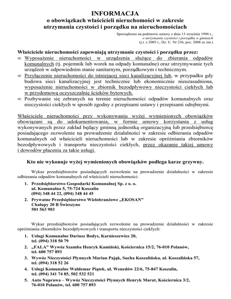 INFORMACJA o obowiązkach właścicieli nieruchomości w zakresie utrzymania czystości i porządku na nieruchomościach Sporządzono na podstawie ustawy z dnia 13 września 1996 r., o utrzymaniu czystości i porządku w gminach (j.t. z 2005 r., Dz. U. Nr 236, poz. 2008 ze zm.) Właściciele nieruchomości zapewniają utrzymanie czystości i porządku przez: • Wyposażenie nieruchomości w urządzenia służące do zbierania odpadów komunalnych (tj. pojemnik lub worek na odpady komunalne) oraz utrzymywanie tych urządzeń w odpowiednim stanie sanitarnym, porządkowym i technicznym. • Przyłączenie nieruchomości do istniejącej sieci kanalizacyjnej lub, w przypadku gdy budowa sieci kanalizacyjnej jest technicznie lub ekonomicznie nieuzasadniona, wyposażenie nieruchomości w zbiornik bezodpływowy nieczystości ciekłych lub w przydomową oczyszczalnię ścieków bytowych. • Pozbywanie się zebranych na terenie nieruchomości odpadów komunalnych oraz nieczystości ciekłych w sposób zgodny z przepisami ustawy i przepisami odrębnymi. Właściciele nieruchomości przy wykonywaniu wyżej wymienionych obowiązków obowiązani są do udokumentowania, w formie umowy korzystania z usług wykonywanych przez zakład będący gminną jednostką organizacyjną lub przedsiębiorcę posiadającego zezwolenie na prowadzenie działalności w zakresie odbierania odpadów komunalnych od właścicieli nieruchomości lub w zakresie opróżniania zbiorników bezodpływowych i transportu nieczystości ciekłych, przez okazanie takiej umowy i dowodów płacenia za takie usługi. Kto nie wykonuje wyżej wymienionych obowiązków podlega karze grzywny. Wykaz przedsiębiorców posiadających zezwolenie na prowadzenie działalności w zakresie odbierania odpadów komunalnych od właścicieli nieruchomości: 1. Przedsiębiorstwo Gospodarki Komunalnej Sp. z o. o. ul. Komunalna 5, 75-724 Koszalin (094) 348 44 22, (094) 348 44 45 2. Prywatne Przedsiębiorstwo Wielobranżowe „EKOSAN” Chałupy 20 B Świeszyno 501 563 903 Wykaz przedsiębiorców posiadających zezwolenie na prowadzenie działalności w zakresie opróżniania zbiorników bezodpływowych i transportu nieczystości ciekłych: 1. Usługi Komunalne Dariusz Bodys, Karnieszewice 20, tel. (094) 318 50 79 2. „FALA” Wywóz Szamba Henryk Kamiński, Kościernica 15/2, 76-010 Polanów, tel. 600 757 893 3. Wywóz Nieczystości Płynnych Marian Pająk, Sucha Koszalińska, ul. Koszalińska 57, tel. (094) 318 52 26 4. Usługi Komunalne Waldemar Piątek, ul. Wenedów 22/6, 75-847 Koszalin, tel. (094) 341 74 85, 502 532 521 5. Auto Naprawa – Wywóz Nieczystości Płynnych Henryk Marut, Kościernica 3/2, 76-010 Polanów, tel. 600 757 893