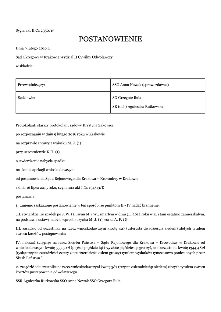 Sygn. akt II Ca 2350/15 POSTANOWIENIE Dnia 9 lutego 2016 r. Sąd Okręgowy w Krakowie Wydział II Cywilny Odwoławczy w składzie: Przewodniczący: SSO Anna Nowak (sprawozdawca) Sędziowie: SO Grzegorz Buła SR (del.) Agnieszka Rutkowska Protokolant: starszy protokolant sądowy Krystyna Zakowicz po rozpoznaniu w dniu 9 lutego 2016 roku w Krakowie na rozprawie sprawy z wniosku M. J. (1) przy uczestnictwie K. T. (1) o stwierdzenie nabycia spadku na skutek apelacji wnioskodawczyni od postanowienia Sądu Rejonowego dla Krakowa – Krowodrzy w Krakowie z dnia 16 lipca 2015 roku, sygnatura akt I Ns 134/13/K postanawia: 1. zmienić zaskarżone postanowienie w ten sposób, że punktom II - IV nadać brzmienie: „II. stwierdzić, że spadek po J. W. (1), synu M. i W., zmarłym w dniu (...)2012 roku w K. i tam ostatnio zamieszkałym, na podstawie ustawy nabyła wprost kuzynka M. J. (1), córka A. F. i G.; III. zasądzić od uczestnika na rzecz wnioskodawczyni kwotę 427 (czterysta dwadzieścia siedem) złotych tytułem zwrotu kosztów postępowania; IV. nakazać ściągnąć na rzecz Skarbu Państwa – Sądu Rejonowego dla Krakowa – Krowodrzy w Krakowie od wnioskodawczyni kwotę 553,50 zł (pięćset pięćdziesiąt trzy złote pięćdziesiąt groszy), a od uczestnika kwotę 1344,48 zł (tysiąc trzysta czterdzieści cztery złote czterdzieści osiem groszy) tytułem wydatków tymczasowo poniesionych przez Skarb Państwa.” 2. zasądzić od uczestnika na rzecz wnioskodawczyni kwotę 387 (trzysta osiemdziesiąt siedem) złotych tytułem zwrotu kosztów postępowania odwoławczego. SSR Agnieszka Rutkowska SSO Anna Nowak SSO Grzegorz Buła UZASADNIENIE postanowienia z dnia 9 lutego 2016r. Zaskarżonym postanowieniem Sąd Rejonowy stwierdził, że spadek po W. W. (2), córce P. i Z., ostatnio zamieszkałej w K., zmarłej w K. dnia (...) 2011 r. nabył z mocy ustawy wprost syn J. W. (1), syn M. i W. w całości, spadek po J. W. (1), synu M. i W., ostatnio zamieszkałym w K., zmarłym w K. dnia (...) 2012 r. na podstawie testamentu ustnego z dnia (...) 2012 r. nabył K. T. (1) w całości. W punktach III i IV rozstrzygnął o kosztach postępowania i zasądził od wnioskodawczyni M. J. (1) na rzecz uczestnika K. T. (1) kwotę 377,00 zł tytułem zwrotu kosztów postępowania oraz nakazał pobrać od wnioskodawczyni M. J. (1) na rzecz Skarbu Państwa - Sądu Rejonowego dla Krakowa – Krowodrzy w Krakowie kwotę 1 897,98 zł tytułem niepokrytych kosztów opinii biegłych, ogłoszenia w prasie oraz uzyskania dokumentacji medycznej. Sąd ustalił następujący stan faktyczny: Spadkodawczyni W. W. (2), zmarła w dniu (...)2009 roku. Jej ostatnim miejscem zamieszkania był K.. Nie pozostawiła po sobie testamentu. W chwili śmierci była rozwiedziona, miała jednego syna w osobie J. W. (1). Spadkodawczyni nie posiadała żadnych innych dzieci, w tym pozamałżeńskich ani przysposobionych. Niniejsze postępowanie jest pierwszym postępowaniem spadkowym po spadkodawczyni. M. J. (1) nie składała oświadczenia o przyjęciu bądź odrzuceniu spadku, nie zrzekała się dziedziczenia, nie została uznana za niegodną dziedziczenia, nie zgłaszała się do notariusza celem uzyskania aktu poświadczenia dziedziczenia. Spadkodawca J. W. (1) zmarł w dniu (...) 2012 r., ostatnio zamieszkiwał w K.. W chwili śmierci był rozwiedziony, nie miał dzieci ani rodzeństwa. Otwarcia spadku J. W. (1) nie dożyli jego rodzice: W. W. (2) ani M. K. (1). Spadkodawcy ze strony M. K. (1) nie zostali ustaleni w drodze ogłoszenia. Niniejsze postępowanie jest pierwszym postępowaniem spadkowym po spadkodawcy J. W. (1). Dziadkowie spadkodawcy J. W. (1) ze strony matki W. W. (2) nie dożyli otwarcia spadku po nim. Spadek po zmarłym w dniu (...) 1961 roku P. W., na podstawie – postanowienia Sądu Rejonowego dla Krakowa -Krowodrzy w Krakowie z dnia 23 października 1991 roku, sygn. akt I Ns 2239/91/K nabyła żona spadkodawcy Z. W. w 2/8 częściach, córka W. W. (2) w 3/8 częściach oraz syn A. W. w 3/8 częściach. Jedynymi dziećmi zmarłych P. W. i Z. W. byli W. W. (2) oraz A. W.. W dniu (...)1991 roku zmarła Z. W.. Spadek po niej na podstawie postanowienia Sądu Rejonowego dla Krakowa -Krowodrzy w Krakowie z dnia 27 stycznia 1993 roku, sygn. akt I Ns 13/93/K nabyły na podstawie ustawy jej dzieci: córka W. W. (2) oraz A. W., oboje po 1/2 części. A. W., zmarł w dniu (...) 2008r. w O., zaś spadek po nim na podstawie postanowienia Sądu Rejonowego w Oświęcimiu z dnia 03 listopada 2008r., sygn. akt I Ns 870/08, nabyły wprost na podstawie ustawy jego żona G. W. (1) oraz jedyna córka M. J. (1) po 1/2 części. Spadkodawca J. W. (1) od lat skarżył się na różne dolegliwości i problemy ze zdrowiem, w tym ból kolan. Spadkodawca miał nadwagę, zaś w młodości miał problemy z alkoholem. Po śmierci matki W. W. (2) spadkodawca J. W. (1) zaczął czuć się znacznie gorzej. Uczęszczał do lekarza M. S. (1), specjalisty chorób wewnętrznych, który w sierpniu 2011 r. zdiagnozował u J. W. (1) kardiomiopatię rozstrzeniową. Podczas hospitalizacji w Klinicznym Oddziale (...) (...) Szpitala (...) z polikliniką (...) w K. w sierpniu 2011 r. potwierdzono u spadkodawcy kardiomiopatię rozstrzeniową oraz umiarkowaną niedomykalność zastawki mitralnej. K. rozstrzeniowa jest ciężkim schorzeniem przewlekłym serca, polegającym na zaniku komórek mięśniowych odpowiedzialnych za generowanie siły skurczowej mięśnia sercowego. Nadto u spadkodawcy zdiagnozowano chorobę niedokrwienną serca, złożone zaburzenia rytmu serca pod postacią nieutrwalonego częstoskurczu komorowego i nadkomorowego, nadciśnienie tętnicze, uszkodzenie wątroby, zaburzenie gospodarki libidowej, chorobę zwyrodnieniową kręgosłupa, nikotynizm oraz stan po przebytym złamaniu żebra. Spadkodawca J. W. (1) po wykryciu kardiomiopatii rozstrzeniowej był diagnozowany i leczony w specjalistycznych, akademickich ośrodkach kardiologicznyc