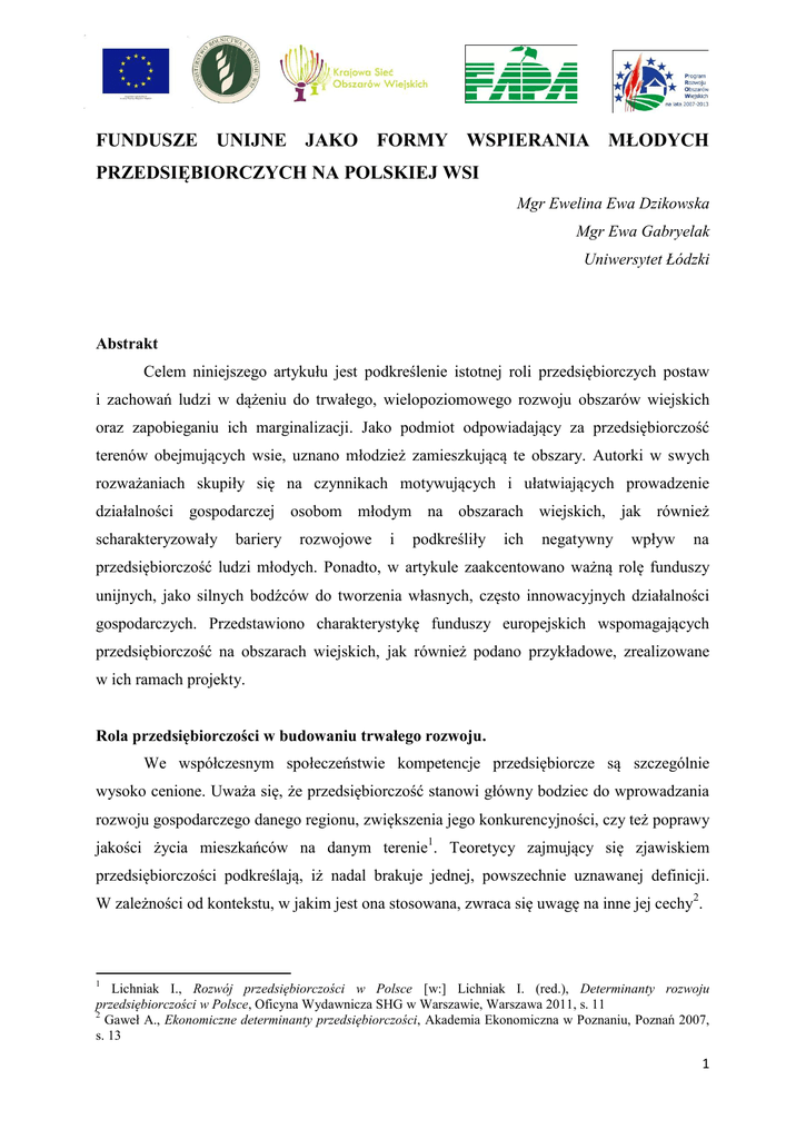 FUNDUSZE UNIJNE JAKO FORMY WSPIERANIA MŁODYCH PRZEDSIĘBIORCZYCH NA POLSKIEJ WSI Mgr Ewelina Ewa Dzikowska Mgr Ewa Gabryelak Uniwersytet Łódzki Abstrakt Celem niniejszego artykułu jest podkreślenie istotnej roli przedsiębiorczych postaw i zachowań ludzi w dążeniu do trwałego, wielopoziomowego rozwoju obszarów wiejskich oraz zapobieganiu ich marginalizacji. Jako podmiot odpowiadający za przedsiębiorczość terenów obejmujących wsie, uznano młodzież zamieszkującą te obszary. Autorki w swych rozważaniach skupiły się na czynnikach motywujących i ułatwiających prowadzenie działalności gospodarczej osobom młodym na obszarach wiejskich, jak również scharakteryzowały bariery rozwojowe i podkreśliły ich negatywny wpływ na przedsiębiorczość ludzi młodych. Ponadto, w artykule zaakcentowano ważną rolę funduszy unijnych, jako silnych bodźców do tworzenia własnych, często innowacyjnych działalności gospodarczych. Przedstawiono charakterystykę funduszy europejskich wspomagających przedsiębiorczość na obszarach wiejskich, jak również podano przykładowe, zrealizowane w ich ramach projekty. Rola przedsiębiorczości w budowaniu trwałego rozwoju. We współczesnym społeczeństwie kompetencje przedsiębiorcze są szczególnie wysoko cenione. Uważa się, że przedsiębiorczość stanowi główny bodziec do wprowadzania rozwoju gospodarczego danego regionu, zwiększenia jego konkurencyjności, czy też poprawy jakości życia mieszkańców na danym terenie1. Teoretycy zajmujący się zjawiskiem przedsiębiorczości podkreślają, iż nadal brakuje jednej, powszechnie uznawanej definicji. W zależności od kontekstu, w jakim jest ona stosowana, zwraca się uwagę na inne jej cechy2. 1 Lichniak I., Rozwój przedsiębiorczości w Polsce [w:] Lichniak I. (red.), Determinanty rozwoju przedsiębiorczości w Polsce, Oficyna Wydawnicza SHG w Warszawie, Warszawa 2011, s. 11 2 Gaweł A., Ekonomiczne determinanty przedsiębiorczości, Akademia Ekonomiczna w Poznaniu, Poznań 2007, s. 13 1 Zdaniem wielu badaczy, przedsiębiorczość należy odnosić do jednostek ludzkich. Według nich jest to system myślenia, działania, rodzaj zachowania, który pozwala w optymalny sposób prowadzić działalność gospodarczą3. „Definiując przedsiębiorczość można traktować ją jako postawę człowieka lub jako proces zmian zachodzących pod wpływem tej postawy. Przedsiębiorcza postawa człowieka wyraża się w jego aktywnym i twórczym zachowaniu wobec rzeczywistości, dążeniu do jej ulepszania, podejmowaniu nowych działań”4. Według A. Gibba, do cech przedsiębiorców zalicza się m. in. wykazywanie inicjatywy, elastyczność, kreatywność, umiejętności przywódcze, jak również sprawność w rozwiązywaniu problemów5. Przedsiębiorczość jest umiejętnością „w zakresie kreowania nowych wartości i chęci wykorzystania tej zdolności do konkretnych działań”6. Stanowi siłę napędową bardzo wielu zjawisk społeczno – ekonomicznych, a zwłaszcza, zdaniem A. Szumpetera, pozwala na osiągnięcie wspominanego rozwoju gospodarczego państwa7. Generalnie jednak zjawisku przedsiębiorczości nadaje się trzy znaczenia. Może ono odnosić się cech grupy aktorów społecznych – jak zaznaczono powyżej; aktywności tychże osób; bądź też w skali makro – dotyczyć zjawiska społeczno – gospodarczego8. Postawy przedsiębiorcze osób młodych. Jak zostało zaznaczone w artykule, osoby młode, kończące proces edukacji winny przyjąć postawę przedsiębiorczą i wziąć odpowiedzialność za rozwój gospodarczy i społeczny naszego państwa. „Szczególnym obszarem zainteresowania jest przedsiębiorczość młodych ludzi, rozumiana tutaj jako inicjatywa osobista w gromadzeniu zasobów niezbędnych do zwieńczenia sukcesem pierwszego i najważniejszego przejścia z edukacji do pracy zawodowej, będącej jednocześnie tranzycją rozwojową do dorosłości”9. Aktualnie zauważa się, że polska młodzież częściej niż dotychczas w planowaniu swojej przyszłości bierze pod 3 Lichniak I., Rozwój przedsiębiorczości w Polsce [w:] Lichniak I. (red.), Determinanty rozwoju przedsiębiorczości w Polsce, Oficyna Wydawnicza SHG w Warszawie, Warszawa 2011, s. 11 4 Gaweł A., Ekonomiczne determinanty przedsiębiorczości, Akademia Ekonomiczna w Poznaniu, Poznań 2007, s. 23 5 Plawgo B. (red.) Lokalne uwarunkowania rozwoju przedsiębiorczości na przykładzie powiatu łomżyńskiego, Wydawnictwo Państwowej Wyższej Szkoły Informatyki i Przedsiębiorczości w Łomży, Łomża 2005, s. 14 6 Grzegorzewska-Mischka E., Współczesne uwarunkowania rozwoju przedsiębiorczości w Polsce, Oficyna Wydawnicza SGH w Warszawie, Warszawa 2010, s. 29 7 Campion M., Rola samorządu we wspieraniu lokalnej i regionalnej przedsiębiorczości, Wydawnictwo naukowe Uniwersytetu Pedagogicznego, Kraków 2012, s. 12 8 Ibidem, s. 15 9 Bańka A., Przedsiębiorczość w okresie adolescencji i wczesnej dorosłości. O formowaniu się tożsamości nowego typu [w:] Ratajczak Z. (red.), Przedsiębiorczość. Źródła i uwarunkowania psychologiczne, Wydawnictwo Difin, Warszawa 2012, s. 27 2 uwagę możliwość założenia własnego przedsiębiorstwa i samo zatrudnienia10. Jednakże badania pokazują, że osoby młode są najmniej liczną grupą spośród pracodawców – zaledwie 6,5%. Nie jest to efektem braku zainteresowania młodzieży takimi inicjatywami, lecz barierami na które trafiają11. Podstawowa przeszkodą w przypadku zakładania działalności gospodarczej jest brak wystarczających środków finansowych na założenie i funkcjonowanie firmy w pierwszym roku działalności12. Zdaniem autorów raportu „Młodzi 2011” osoby młode do 30 r. ż. nie są grupą bierną, ale wręcz przeciwnie, bardzo często interesują się założeniem własnego biznesu. Na drodze jednak do własnej działalności stoją skomplikowane procedury i brak kapitału startowego13. Z analiz