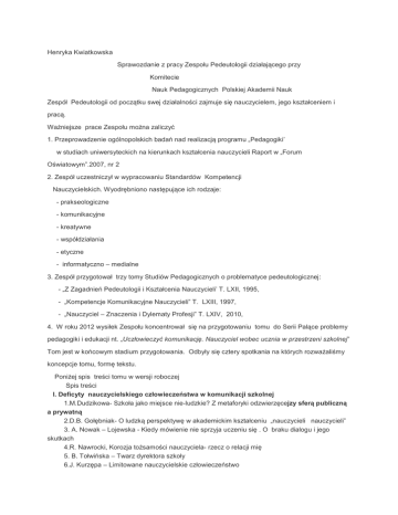Henryka Kwiatkowska Sprawozdanie z pracy Zespołu Pedeutologii działającego przy Komitecie Nauk Pedagogicznych Polskiej Akademii Nauk Zespół Pedeutologii od początku swej działalności zajmuje się nauczycielem, jego kształceniem i pracą. Ważniejsze prace Zespołu można zaliczyć 1. Przeprowadzenie ogólnopolskich badań nad realizacją programu „Pedagogiki’ w studiach uniwersyteckich na kierunkach kształcenia nauczycieli Raport w „Forum Oświatowym”.2007, nr 2 2. Zespół uczestniczył w wypracowaniu Standardów Kompetencji Nauczycielskich. Wyodrębniono następujące ich rodzaje: - prakseologiczne - komunikacyjne - kreatywne - współdziałania - etyczne - informatyczno – medialne 3. Zespół przygotował trzy tomy Studiów Pedagogicznych o problematyce pedeutologicznej: - „Z Zagadnień Pedeutologii i Kształcenia Nauczycieli’ T. LXII, 1995, - „Kompetencje Komunikacyjne Nauczycieli” T. LXIII, 1997, - „Nauczyciel – Znaczenia i Dylematy Profesji” T. LXIV, 2010, 4. W roku 2012 wysiłek Zespołu koncentrował się na przygotowaniu tomu do Serii Palące problemy pedagogiki i edukacji nt. „Uczłowieczyć komunikację. Nauczyciel wobec ucznia w przestrzeni szkolnej” Tom jest w końcowym stadium przygotowania. Odbyły się cztery spotkania na których rozważaliśmy koncepcje tomu, formę tekstu. Poniżej spis treści tomu w wersji roboczej Spis treści I. Deficyty nauczycielskiego człowieczeństwa w komunikacji szkolnej 1.M.Dudzikowa- Szkoła jako miejsce nie-ludzkie? Z metaforyki odzwierzęcejzy sferą publiczną a prywatną 2.D.B. Gołębniak- O ludzką perspektywę w akademickim kształceniu „nauczycieli nauczycieli” 3. A. Nowak – Lojewska - Kiedy mówienie nie sprzyja uczeniu się . O braku dialogu i jego skutkach 4.R. Nawrocki, Korozja tożsamości nauczyciela- rzecz o relacji mię 5. B. Tołwińska – Twarz dyrektora szkoły 6.J. Kurzępa – Limitowane nauczycielskie człowieczeństwo 7 W.Komar – Dramat zawodności nauczycielstwa 8. A. Matusz Rżewska,- Nauczyciel – uczeń. O paradoksach wzajemnej komunikacji II. Szkoła zaklęta w mówienie 9. E. Bochno,F. Bochno – Nadal mówienie nie rozmowa? 10. M. Mądry –Kupiec – Nauczyciel uwikłany w mówienie – spojrzenie z perspektywy teorii.Schulza – von Thuna 11. E. Marciniak- „Mowa milczenia” w szkole – o czym mówi? 12. M. Groenwald – Dlaczego komunikaty zamiast rozmów? O porozumiewaniu się nauczycieli i uczniów w tranzytowej przestrzeni w szkoły III. Nauczyciel w pamięci retrospektywnej 13. W. Dróżka – Jak udźwignąć siłą własną? 14.. J. Chmielewska Tyszkiewicz – Nauczyciel – obecny z oddali czasu IV. Szkoła, która (nie) zawodzi? 15. B. Śliwerski, (De) montaż, czy „szwedzki stół” demokratyzacji szkolnej z udziałem nauczycieli, rodziców i uczniów 16. S. Jaskulska – Do tablicy!Ocenianie szkolne jako komunikacja nauczyciela z uczniem 17. E. Muszyńska- Kiedy rodzic zawodzi – czyli dzieci z „czarną dziurą” 18. M. Zalewska – Bujak – Pierwotne doświadczenie komunikacyjne ucznia 19. M. Michalicka – Czy szkoła jakiej potrzebujemy? 20. I. Kaźmierczyk – W więzieniu nudy szkolnej V. Nauczyciel wobec zróżnicowania kontekstu kulturowego 21. M. Grygierek - „Inny” w edukacji- bogactwo czy niechciany bagaż współczesności? (Nauczyciel wobec obcości kulturowej) 22. A. Bargielska - Za kulisami indywidualizacji – Retoryka Ja – My w klasie szkolnej