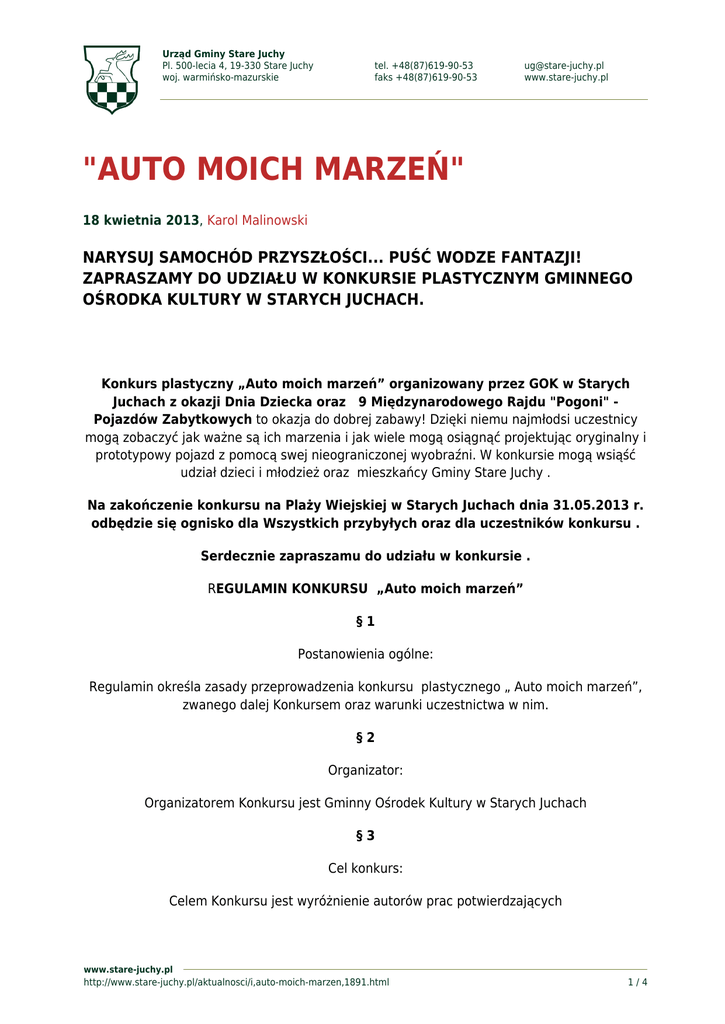 Urząd Gminy Stare Juchy Pl. 500-lecia 4, 19-330 Stare Juchy woj. warmińsko-mazurskie tel. +48(87)619-90-53 faks +48(87)619-90-53 [email protected] www.stare-juchy.pl "AUTO MOICH MARZEŃ" 18 kwietnia 2013, Karol Malinowski NARYSUJ SAMOCHÓD PRZYSZŁOŚCI... PUŚĆ WODZE FANTAZJI! ZAPRASZAMY DO UDZIAŁU W KONKURSIE PLASTYCZNYM GMINNEGO OŚRODKA KULTURY W STARYCH JUCHACH. Konkurs plastyczny „Auto moich marzeń” organizowany przez GOK w Starych Juchach z okazji Dnia Dziecka oraz 9 Międzynarodowego Rajdu "Pogoni" Pojazdów Zabytkowych to okazja do dobrej zabawy! Dzięki niemu najmłodsi uczestnicy mogą zobaczyć jak ważne są ich marzenia i jak wiele mogą osiągnąć projektując oryginalny i prototypowy pojazd z pomocą swej nieograniczonej wyobraźni. W konkursie mogą wsiąść udział dzieci i młodzież oraz mieszkańcy Gminy Stare Juchy . Na zakończenie konkursu na Plaży Wiejskiej w Starych Juchach dnia 31.05.2013 r. odbędzie się ognisko dla Wszystkich przybyłych oraz dla uczestników konkursu . Serdecznie zapraszamu do udziału w konkursie . REGULAMIN KONKURSU „Auto moich marzeń” §1 Postanowienia ogólne: Regulamin określa zasady przeprowadzenia konkursu plastycznego „ Auto moich marzeń”, zwanego dalej Konkursem oraz warunki uczestnictwa w nim. §2 Organizator: Organizatorem Konkursu jest Gminny Ośrodek Kultury w Starych Juchach §3 Cel konkurs: Celem Konkursu jest wyróżnienie autorów prac potwierdzających www.stare-juchy.pl http://www.stare-juchy.pl/aktualnosci/i,auto-moich-marzen,1891.html 1/4 Urząd Gminy Stare Juchy Pl. 500-lecia 4, 19-330 Stare Juchy woj. warmińsko-mazurskie tel. +48(87)619-90-53 faks +48(87)619-90-53 [email protected] www.stare-juchy.pl ich pomysłowość, kreatywność i umiejętności twórcze. §4 Uczestnictwo w Konkursie jest bezpłatne. §5 Zasady konkursu: 1. Konkurs jest adresowany do dzieci i młodzieży oraz mieszkańców Gminy Stare Juchy. 2. Prace zostaną podzielone na kategorie wiekowe po upływie terminu zgłaszania prac konkursowych przez uczestników. 3. Prace muszą być wykonane samodzielnie przez uczestników Konkursu, muszą być pracami autorskimi, wcześniej nie nagradzanymi w innych konkursach. 4. Zgłoszone projekty nie mogą być pracą zbiorową. 5. Każdy uczestnik może zgłosić na Konkurs maksymalnie 1 prace. 6 Prace konkursowe powinny zostać wykonane na papierze o wymiarach 270-300 mm na 420-450 mm, w pionie lub poziomie. Wymiary te odpowiadają rozmiarowi kartki A3 lub wymiarom gazety .Prace konkursowe powinny być wykonane odręcznie, prace stworzone cyfrowo lub z użyciem technik graficznych nie będą przyjmowane. Ilustracje powinny być kolorowe; wymagane jest zakomponowanie całej kartki, włącznie z tłem, a nie jedynie sylwetki pojazdu .Uczestnik może wykorzystać dowolny rodzaj papieru i posłużyć się dowolną techniką wykonania nie przestrzennej pracy (kredki, pastele, farby, w tym akwarele, mazaki itp.). 7. Warunkiem uczestnictwa w konkursie jest wypełnienie “Karty zgłoszenia do konkursu” oraz w przypadku osób niepełnoletnich zgody rodziców/ prawnych opiekunów . Formularz karty oraz zgody rodziców / opiekunów są dostępne w siedzibie Gminnego Ośrodka Kultury w Starych Juchach. Uwaga!!!! Prace bez dołączonej i wypełnionej i podpisanej Karty Zgłoszenia Konkursowego, a w przypadku osoby niepełnoletniej bez podpisu rodzica/opiekuna prawnego nie będą brały udziału w Konkursie!!! 8. Prace można dostarczyć: www.stare-juchy.pl http://www.stare-juchy.pl/aktualnosci/i,auto-moich-marzen,1891.html 2/4 Urząd Gminy Stare Juchy Pl. 500-lecia 4, 19-330 Stare Juchy woj. warmińsko-mazurskie tel. +48(87)619-90-53 faks +48(87)619-90-53 [email protected] www.stare-juchy.pl - bezpośrednio do Gminnego Ośrodka Kultury w Starych Juchach lub pocztą na adres: Gminny Ośrodek Kultury w Starych Juchach Ul. Ełcka 8 19-330 Stare Juchy z dopiskiem: “Konkurs plastyczny pt. Auto moich marzeń”. 9. Termin dostarczenia prac upływa 20 maja 2013 r. do godz.15.00. Decyduje data wpływu. Prace nadesłane po tym terminie nie będą brane pod uwagę. 10. Koszty przesyłki ponoszą Autorzy prac. 11. Prace uszkodzone lub dostarczone po terminie nie będą brane pod uwagę. 12. Prace konkursowe nie podlegają zwrotowi. 13. W Konkursie mogą brać udział dzieci pracowników Organizatora. §6 Rozstrzygnięcie Konkursu 1. Oceny prac konkursowych dokona Jury powołane przez Organizatora. 2. Jury podejmie decyzję w dniu 31.05.2013 r. 3. W wyniku Konkursu wyłoniony zostanie tylko jeden zwycięzca w poszczególnej kategorii . 4. Nagrodą główną w konkursie, będzie przejazd laureata konkursu samochodem rajdowym (jako pasażer oraz nagrody dodatkowe) . 5. Wyniki Konkursu zostaną podane do wiadomości publicznej na stronie internetowej www.stare-juchy.pl . §7 Postanowienia końcowe 1.Organizator nabywają prawo do rozpowszechniania, używania, dostosowywania, edytowania www.stare-juchy.pl http://www.stare-juchy.pl/aktualnosci/i,auto-moich-marzen,1891.html 3/4 Urząd Gminy Stare Juchy Pl. 500-lecia 4, 19-330 Stare Juchy woj. warmińsko-mazurskie tel. +48(87)619-90-53 faks +48(87)619-90-53 [email protected] www.stare-juchy.pl i wielokrotnego publikowania Prac konkursowych w dowolny sposób . 2. Przekazane na Konkurs projekty nie podlegają zwróceniu i pozostają w siedzibie Organizatora. Dodatkowe informacje na temat konkursu udzielane są pod numerem telefonu: 87 619-90-58 w lub bezpośrednio w Gminnym Ośrodku Kultury w Starych Juchach. www.stare-juchy.pl http://www.stare-juchy.pl/aktualnosci/i,auto-moich-marzen,1891.html 4/4