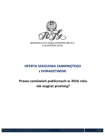 OFERTA SZKOLENIA ZAMKNIĘTEGO z DORADZTWEM: Prawo zamówień publicznych w 2016 roku Jak wygrać przetarg? Regionalna Izba Gospodarcza w Katowicach www.rig.katowi ce.pl Strona 1 DANE KONTAKTOWE ORGANIZATORA SZKOLENIA: Nazwa, adres Regionalna Izba Gospodarcza w Katowicach 40-084 Katowice ul. Opolska 15 www.rig.katowice.pl Kontakt szczegółowy Zespół ds. Edukacji, Doradztwa i Projektów [email protected] tel.: +48 32/ 781 48 53, 351 11 86 Klauzula poufności Prosimy o zachowanie poufności przy porównaniu naszej oferty z innymi, zgodnie z klauzulą "Informacje stanowiące tajemnicę przedsiębiorstwa w rozumieniu art. 11 ust. 4 ustawy o zwalczaniu nieuczciwej konkurencji (Dz. U. z 1993r. nr 47 póz. 211 z późn. zm.). Poniższa oferta obowiązuje do 5 lutego 2016 r. WARUNKI OFERTY: Ilość grup szkoleniowych: 1 Ilość osób w grupie: do 15 osób Szkolenie przeznaczone dla pracowników działów/zespołów sprzedażowych, handlowych, oraz wszystkich osób zajmujących się zamówieniami publicznymi w firmie. Czas trwania: 2 dni (pierwszy dzień: 7h szkolenia, drugi dzień: 3-4h doradztwa) Miejsce szkolenia: siedziba RIG w Katowicach, ul. Opolska 15 (Centrum Katowic) Termin szkolenia: do 16 lutego 2016r. Regionalna Izba Gospodarcza w Katowicach www.rig.katowi ce.pl Strona 2 Firma (Klient) zapewnia: - grupę uczestników do 15 osób; - catering (opcjonalnie - do decyzji Klienta) Organizator zapewnia: - przeprowadzenie szkolenia wraz z doradztwem przez wysoko wykwalifikowanego trenera wg programu zaproponowanego poniżej; - opiekę organizacyjną podczas szkolenia; - materiały szkoleniowe; - bufet kawowy (woda, kawa, herbata, kruche ciastka) - certyfikaty dla wszystkich uczestników szkolenia; - przeprowadzenie badania ankietowego oceniającego szkolenie; - opracowanie wyników badania ankietowego oceniającego szkolenie i przekazanie ich Klienta; PROGRAM SZKOLENIA Dzień 1. Część I. Prawo zamówień publicznych I. Obecna ustawa – istotne problemy: 1. 2. 3. 4. 5. 6. II. Opis warunków udziału w postępowaniu. Opis przedmiotu zamówienia. Jakich dokumentów może żądać zamawiający? Wzór umowy – kary umowne i inne niekorzystne postanowienia. Wyjaśnienia treści SIWZ. Tajemnica przedsiębiorstwa. Nowe Dyrektywy Parlamentu Europejskiego i Rady (24/2014/UE oraz 25/2014/UE): 1. Założenia dyrektyw. 2. Najważniejsze zmiany. 3. Problemy z implementacją. III. Nowy projekt ustawy: 1. Projekt Urzędu Zamówień Publicznych. 2. Założenia i losy projektu. 3. Co dalej z zamówieniami publicznymi w Polsce? Regionalna Izba Gospodarcza w Katowicach www.rig.katowi ce.pl Strona 3 Część II. Jak wygrać przetarg? IV. Oferta „własna” 1. 2. 3. 4. V. Gdzie szukać wskazówek co do ceny? Poświadczanie dokumentacji za zgodność z oryginałem oraz tłumaczenia. Braki do uzupełnienia i niemożliwe do uzupełnienia. Korespondencja z zamawiającym po otwarciu ofert – czego się wystrzegać? Oferty „cudze” 1. 2. 3. 4. 5. Jawność wniosków, ofert i załączników. Dostęp do protokołu postępowania i załączników. Jak przełamać tajemnicę przedsiębiorstwa? Czego szukać we wnioskach lub ofertach konkurencji? Przygotowanie do rozprawy przed Krajową Izbą Odwoławczą. Dzień 2. – DORADZTWO (do 4h). INFORMACJE NA TEMAT TRENERA: Radca prawny, ekspert prawa zamówień publicznych z wieloletnim doświadczeniem w obsłudze zamawiających (klasycznych i sektorowych) oraz wykonawców działających w różnych branżach. Doświadczony trener i wykładowca prawa zamówień publicznych. Zdobyte doświadczenie obejmuje w pierwszym rzędzie kompleksowe doradztwo oraz zastępstwo procesowe w licznych postępowaniach w przedmiocie udzielenia zamówienia publicznego po stronie wykonawców z branży górniczej (dostawa maszyn górniczych oraz wyrobów stosowanych w górnictwie, usługi pomocnicze dla górnictwa), architektonicznej (np. projekty dróg, projekt przebudowy lotniska), budowlanej (budowa urządzeń infrastruktury gazowej) i IT (dostawa oprogramowania). W ramach posiadanego doświadczenia realizował usługi między innymi na rzecz Instytutu Fizjologii i Patologii Słuchu – instytucji naukowej oraz podmiotu leczniczego o światowej renomie; Jastrzębskiej Spółki Węglowej S.A. – wiodącego producenta węgla kamiennego; bardzo dużej spółki działającej w branży produktów smarowych, bardzo dużej spółki działającej w branży budowlanej – infrastruktura gazowa; instalacje związane z odzyskiem i unieszkodliwianiem odpadów oraz dużej spółki prawa hiszpańskiego działającej w branży architektonicznoprojektowej. Regionalna Izba Gospodarcza w Katowicach www.rig.katowi ce.pl Strona 4 KORZYŚCI DLA KLIENTA: szkolenie „szyte na miarę” – możliwość modyfikacji programu i przeprowadzenia w oparciu o zaproponowane przez Państwa zagadnienia, podnoszące jakość wykonywanej pracy i utrzymanie profesjonalnego poziomu realizowanych działań, dające możliwość zdobycia praktycznych umiejętności, przy jednoczesnym zmniejszeniu liczby popełnianych błędów. indywidualne podejście trenera do uczestników – dopasowane do specyfiki grupy i potrzeb Państwa Firmy; zapewnienie doradztwa w drugim dniu szkolenia; organizacja szkolenia poza miejscem pracy zapewniająca komfort i efektywniejsze przyswajanie wiedzy. Wartość oferty – CENA PROMOCYJNA: 2700,00 zł + 23% VAT Cena obowiązuje tylko w przypadku organizacji szkolenia do 16 lutego 2016 r. Wartość oferty w przypadku organizacji szkolenia po 16 lutym 2016 r. : 4000,00 zł + 23% VAT Możliwość zapewnienia poczęstunku w formie kanapek lub lunchu dla uczestników szkolenia (płatne dodatkowo według osobnego cennika). Zapraszamy do współpracy! KONTAKT Zespół ds. Edukacji, Doradztwa i Projektów tel.: 32/ 351 11 86, 781 48 53 e-mail: [email protected] ul. Opolska 15 40-084 Katowice www.rig.katowice.pl Regionalna Izba Gospodarcza w Katowicach www.rig.katowi ce.pl Strona 5
