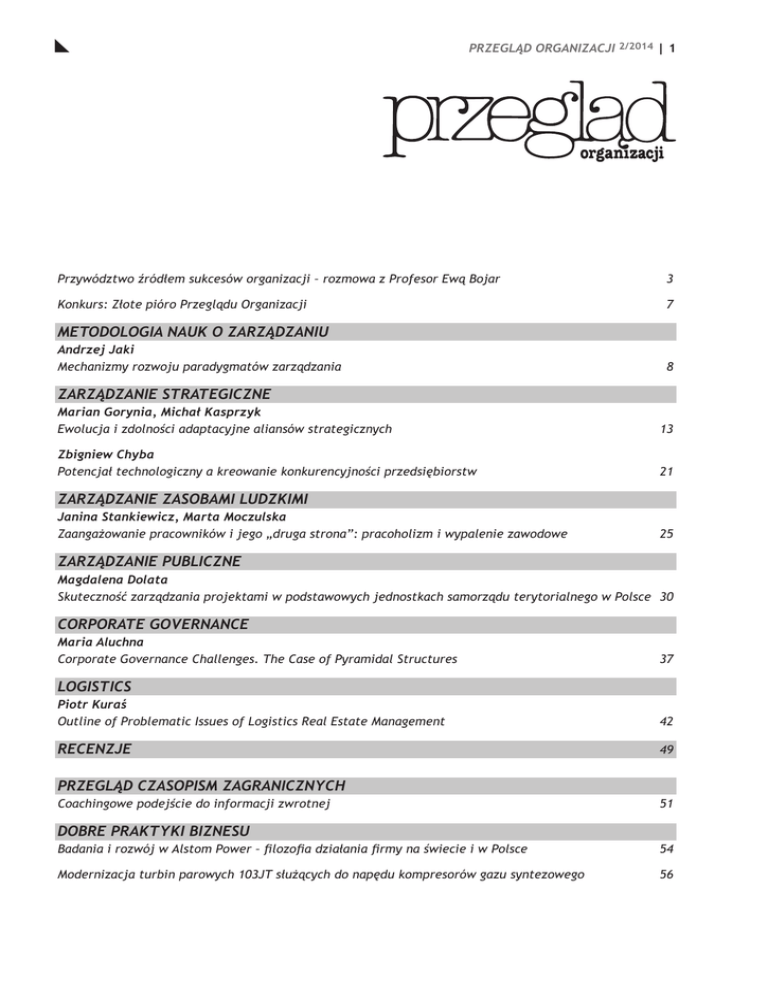 PRZEGLĄD ORGANIZACJI 2/2014 |1 Przywództwo źródłem sukcesów organizacji – rozmowa z Profesor Ewą Bojar 3 Konkurs: Złote pióro Przeglądu Organizacji 7 METODOLOGIA NAUK O ZARZĄDZANIU Andrzej Jaki Mechanizmy rozwoju paradygmatów zarządzania 8 ZARZĄDZANIE STRATEGICZNE Marian Gorynia, Michał Kasprzyk Ewolucja i zdolności adaptacyjne aliansów strategicznych 13 Zbigniew Chyba Potencjał technologiczny a kreowanie konkurencyjności przedsiębiorstw 21 ZARZĄDZANIE ZASOBAMI LUDZKIMI Janina Stankiewicz, Marta Moczulska Zaangażowanie pracowników i jego „druga strona”: pracoholizm i wypalenie zawodowe 25 ZARZĄDZANIE PUBLICZNE Magdalena Dolata Skuteczność zarządzania projektami w podstawowych jednostkach samorządu terytorialnego w Polsce 30 CORPORATE GOVERNANCE Maria Aluchna Corporate Governance Challenges. The Case of Pyramidal Structures 37 LOGISTICS Piotr Kuraś Outline of Problematic Issues of Logistics Real Estate Management 42 Recenzje 49 PRZEGLĄD CZASOPISM ZAGRANICZNYCH Coachingowe podejście do informacji zwrotnej 51 DOBRE PRAKTYKI BIZNESU Badania i rozwój w Alstom Power – filozofia działania firmy na świecie i w Polsce 54 Modernizacja turbin parowych 103JT służących do napędu kompresorów gazu syntezowego 56 PRZEGLĄD ORGANIZACJI NR 2/2014 - Summaries / Streszczenia Andrzej Jaki Uniwersytet Ekonomiczny w Krakowie MECHANISMS OF THE MANAGEMENT PARADIGM DEVELOPMENT The development of management sciences is inherently connected with the formation and evolution of paradigms which, by determining various orientations, concepts, as well as methods and techniques of management, constitute the methodological foundation of this scientific discipline. The development of the paradigms is significantly implied by changes in the economic practice, which arises directly from the pragmatic character of management sciences. Therefore, the primary goal of this article is to analyze and exemplify the evolution of the paradigms of management sciences, and to show their impact on the development of the management concept. Thus, on the one hand, the deliberations included in the article present the conditionings accompanying the creation and evolution of the basic management paradigms, whereas on the other hand they focus on analyzing the impact of the globalization processes and the experiences of the economic crisis on the evolutionary development of management paradigms based on the processes of parallelism, adaptation, co-evolution and coincidence. Keywords: paradigms of management, globalization, economic crisis MECHANIZMY ROZWOJU PARADYGMATÓW ZARZĄDZANIA Rozwój nauk o zarządzaniu jest nieodłącznie związany z powstawaniem i ewoluowaniem paradygmatów, które, wytyczając różne orientacje, koncepcje oraz metody i techniki zarządzania, stanowią metodologiczne podstawy tej dyscypliny naukowej. Rozwój paradygmatów jest w znaczący sposób implikowany zmianami w praktyce gospodarczej, co wynika bezpośrednio z pragmatycznego charakteru nauk o zarządzaniu. Stąd podstawowym celem artykułu jest analiza i egzemplifikacja ewolucji paradygmatów nauk o zarządzaniu wraz z ukazaniem ich wpływu na rozwój koncepcji zarządzania. Rozważania zawarte w artykule prezentują zatem z jednej strony uwarunkowania towarzyszące tworzeniu i ewoluowaniu podstawowych paradygmatów zarządzania, z drugiej zaś strony koncentrują się na analizie wpływu procesów globalizacji oraz doświadczeń kryzysu gospodarczego na ewolucyjny rozwój paradygmatów zarządzania w oparciu o procesy paralelizmu, adaptacji, koewolucji i koincydencji. Słowa kluczowe: paradygmaty zarządzania, globalizacja, kryzys gospodarczy 1 PRZEGLĄD ORGANIZACJI NR 2/2014 - Summaries / Streszczenia Marian Gorynia, Michał Kasprzyk Uniwersytet Ekonomiczny w Poznaniu EVOLUTION AND ADAPTATION CAPABILITY OF STRATEGIC ALLIANCES The alliances are considered an important element in creating and maintaining competitive advantage. In order to diversify access to partners resources entering into alliance portfolios by highly innovative companies is becoming increasingly frequent. The article attempts to explore the evolution of a concept and the motives specific to both types of cooperation. Using the exploration and exploitation approach the results are presented in an alliance portfolio model, which exemplifies a range of partnership forms depending on a stage of the value chain. Based on findings of the competitive gap studies, the strategy of single alliance is beneficial for newly emerging start-ups or academic centres willing to increase commercialisation of its research. On the other hand, the strategy of alliance portfolios enables to the established Polish companies for vacillation of the business decisions between investments into developing assets and exploitation of the existing assets. Keywords: strategic alliances, alliance portfolios, competitiveness EWOLUCJA I ZDOLNOŚCI ADAPTACYJNE ALIANSÓW STRATEGICZNYCH Alianse są uważane za jeden z ważnych instrumentów tworzenia i podtrzymywania przewagi konkurencyjnej. W celu dywersyfikacji dostępu do zasobów partnerów firmy wysoko-innowacyjne coraz częściej zawiązują portfele aliansów. W artykule zostaje podjęta próba zbadania ewolucji pojęcia i motywów charakterystycznych dla zawiązywania obu typów współpracy. Używając podejścia eksploracji i eksploatacji, wyniki zostają zaprezentowane w formie modelu portfela aliansów, który egzemplifikuje szereg form partnerstwa zależnych od etapu łańcucha wartości. Bazując na wynikach badań dotyczących luki konkurencyjnej, strategia pojedynczego aliansu jest korzysta dla nowopowstających działalności typu start-up, czy też dla zwiększenia komercjalizacji badań naukowych prowadzonych przez ośrodki akademickie. Z kolei strategia portfela aliansów umożliwia dużym polskim przedsiębiorstwom możliwość równoważenia decyzji biznesowych pomiędzy inwestycje w aktywa w trakcie rozwoju