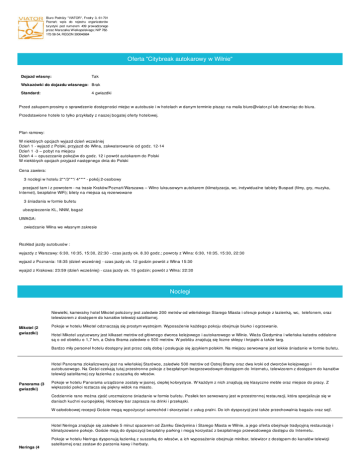 Biuro Podróży "VIATOR", Fredry 3, 61-701 Poznań; wpis do rejestru organizatorów turystyki pod numerem 439 prowadzonego przez Marszałka Wielkopolskiego; NIP 782172-58-54, REGON 300046984 Oferta "Citybreak autokarowy w Wilnie" Dojazd własny: Tak Wskazówki do dojazdu własnego: Brak Standard: 4 gwiazdki Przed zakupem prosimy o sprawdzenie dostępności miejsc w autobusie i w hotelach w danym terminie pisząc na maila [email protected] lub dzwoniąc do biura. Przedstawione hotele to tylko przykłady z naszej bogatej oferty hotelowej. Plan ramowy: W niektórych opcjach wyjazd dzień wcześniej Dzień 1 - wyjazd z Polski, przyjazd do Wilna, zakwaterowanie od godz. 12-14 Dzień 1 -3 – pobyt na miejscu Dzień 4 – opuszczanie pokojów do godz. 12 i powrót autokarem do Polski W niektórych opcjach przyjazd następnego dnia do Polski Cena zawiera: 3 noclegi w hotelu 2**/3***/ 4**** - pokój 2-osobowy przejazd tam i z powrotem - na trasie Kraków/Poznań/Warszawa – Wilno luksusowym autokarem (klimatyzacja, wc, indywidualne tablety Buspad (filmy, gry, muzyka, Internet), bezpłatne WiFi); bilety na miejsca są rezerwowane 3 śniadania w formie bufetu ubezpieczenie KL, NNW, bagaż UWAGA: zwiedzanie Wilna we własnym zakresie Rozkład jazdy autobusów : wyjazdy z Warszawy: 6:30, 10:35, 15:30, 22:30 - czas jazdy ok. 8.30 godz.; powroty z Wilna: 6:30, 10:35, 15:30, 22:30 wyjazd z Poznania: 18:35 (dzień wcześniej) - czas jazdy ok. 12 godzin powrót z Wilna 15:30 wyajzd z Krakowa: 23:59 (dzień wcześniej) - czas jazdy ok. 15 godzin; powrót z Wilna: 22:30 Noclegi Niewielki, kameralny hotel Mikotel położony jest zaledwie 200 metrów od wileńskiego Starego Miasta i oferuje pokoje z łazienką, wc, telefonem, oraz telewizorem z dostępem do kanałów telewizji satelitarnej. Mikotel (2 gwiazdki) Pokoje w hotelu Mikotel odznaczają się prostym wystrojem. Wyposażenie każdego pokoju obejmuje biurko i ogrzewanie. Hotel Mikotel usytuowany jest kilkaset metrów od głównego dworca kolejowego i autokarowego w Wilnie. Wieża Giedymina i wileńska katedra oddalone są o od obiektu o 1,7 km, a Ostra Brama zaledwie o 500 metrów. W pobliżu znajdują się liczne sklepy i knjapki a także targ. Bardzo miły personel hotelu dostępny jest przez całą dobę i posługuje się językiem polskim. Na miejscu serwowane jest lekkie śniadanie w formie bufetu. Hotel Panorama zlokalizowany jest na wileńskiej Starówce, zaledwie 500 metrów od Ostrej Bramy oraz dwa kroki od dworców kolejowego i autobusowego. Na Gości czekają tutaj przestronne pokoje z bezpłatnym bezprzewodowym dostępem do Internetu, telewizorem z dostępem do kanałów telewizji satelitarnej czy łazienka z suszarką do włosów. Panorama (3 gwiazdki) Pokoje w hotelu Panorama urządzone zostały w jasnej, ciepłej kolorystyce. W każdym z nich znajdują się klasyczne meble oraz miejsce do pracy. Z większości pokoi roztacza się piękny widok na miasto. Codziennie rano można zjeść urozmaicone śniadanie w formie bufetu. Posiłek ten serwowany jest w przestronnej restauracji, która specjalizuje się w daniach kuchni europejskiej. Hotelowy bar zaprasza na drinki i przekąski. W całodobowej recepcji Goście mogą wypożyczyć samochód i skorzystać z usług pralni. Do ich dyspozycji jest także przechowalnia bagażu oraz sejf. Hotel Neringa znajduje się zaledwie 5 minut spacerem od Zamku Giedymina i Starego Miasta w Wilnie, a jego oferta obejmuje tradycyjną restaurację i klimatyzowane pokoje. Goście mają do dyspozycji bezpłatny parking i mogą korzystać z bezpłatnego przewodowego dostępu do Internetu. Neringa (4 Pokoje w hotelu Neringa dysponują łazienką z suszarką do włosów, a ich wyposażenie obejmuje minibar, telewizor z dostępem do kanałów telewizji satelitarnej oraz zestaw do parzenia kawy i herbaty. Neringa (4 gwiazdki) Klasyczne dania kuchni litewskiej i międzynarodowej serwowane są w restauracji Neringa, w której można poczuć ducha dawnych czasów. Goście hotelu Neringa mają do dyspozycji saunę i niewielki basen, z których można korzystać za dodatkową opłatą. Hotel Neringa usytuowany jest jest bezpośrednio przy głównej ulicy Wilna zwaną Aleją Giedymina. Najważniejsze atrakcje oddalone są od obiektu o kilka minut spacerem. Miasta Wilno Kraje Litwa Terminy Terminy (w dół) Opcje (w prawo) od: 21-01-2017 do: 24-04-2017 od: 25-04-2017 do: 30-09-2017 hotel 3*** z BB hotel 2** z BB hotel 4**** z BB Liczba noclegów: 0 Liczba noclegów: 0 Liczba noclegów: 0 Wyżywienie: - Śniadanie (0,00 zł) Wyżywienie: - Śniadanie (0,00 zł) Wyżywienie: - Śniadanie (0,00 zł) Cena katalogowa (os. dorosła): 549,00 zł Cena katalogowa (os. dorosła): 499,00 zł Cena katalogowa (os. dorosła): 599,00 zł Cena katalogowa (dziecko): 0,00 zł Cena katalogowa (dziecko): 0,00 zł Cena katalogowa (dziecko): 0,00 zł Cena katalogowa (os. dorosła): 599,00 zł Cena katalogowa (os. dorosła): 549,00 zł Cena katalogowa (os. dorosła): 699,00 zł Cena katalogowa (dziecko): 0,00 zł Cena katalogowa (dziecko): 0,00 zł Cena katalogowa (dziecko): 0,00 zł Dodatki obowiązkowe opcjonalne - dojazd własny (-120,00 zł) Rozkład Nazwa przystanku Skąd Godzina wyjazdu Cena dworzec Centralny 04 Warszawa 06:35* 0,00 zł dworzec pks Poznań 18:35* 120,00 zł dworzec autobusowy Kraków 23:59* 80,00 zł * - w dzień poprzedzający termin rozpoczęcia wyjazdu