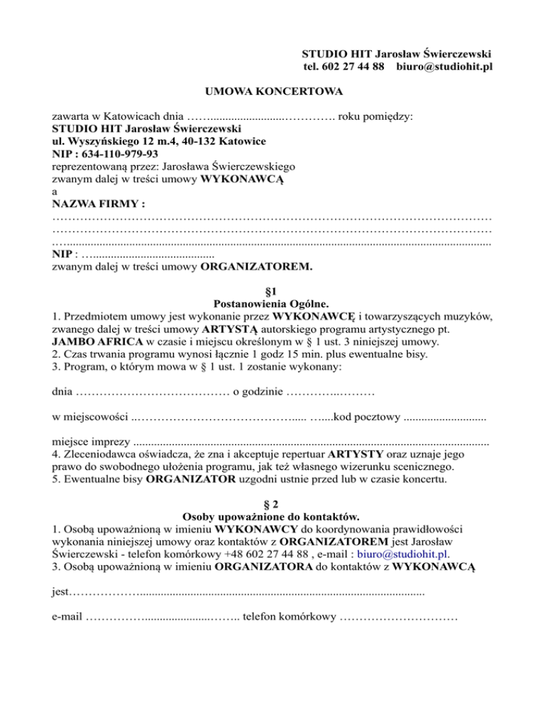 STUDIO HIT Jarosław Świerczewski tel. 602 27 44 88 [email protected] UMOWA KONCERTOWA zawarta w Katowicach dnia …….........................…………. roku pomiędzy: STUDIO HIT Jarosław Świerczewski ul. Wyszyńskiego 12 m.4, 40-132 Katowice NIP : 634-110-979-93 reprezentowaną przez: Jarosława Świerczewskiego zwanym dalej w treści umowy WYKONAWCĄ a NAZWA FIRMY : ………………………………………………………………………………………………… ………………………………………………………………………………………………… .…............................................................................................................................................... NIP : …......................................... zwanym dalej w treści umowy ORGANIZATOREM. §1 Postanowienia Ogólne. 1. Przedmiotem umowy jest wykonanie przez WYKONAWCĘ i towarzyszących muzyków, zwanego dalej w treści umowy ARTYSTĄ autorskiego programu artystycznego pt. JAMBO AFRICA w czasie i miejscu określonym w § 1 ust. 3 niniejszej umowy. 2. Czas trwania programu wynosi łącznie 1 godz 15 min. plus ewentualne bisy. 3. Program, o którym mowa w § 1 ust. 1 zostanie wykonany: dnia ………………………………… o godzinie …………..……… w miejscowości ..…………………………………..... …....kod pocztowy ............................ miejsce imprezy ........................................................................................................................ 4. Zleceniodawca oświadcza, że zna i akceptuje repertuar ARTYSTY oraz uznaje jego prawo do swobodnego ułożenia programu, jak też własnego wizerunku scenicznego. 5. Ewentualne bisy ORGANIZATOR uzgodni ustnie przed lub w czasie koncertu. §2 Osoby upoważnione do kontaktów. 1. Osobą upoważnioną w imieniu WYKONAWCY do koordynowania prawidłowości wykonania niniejszej umowy oraz kontaktów z ORGANIZATOREM jest Jarosław Świerczewski - telefon komórkowy +48 602 27 44 88 , e-mail : [email protected]. 3. Osobą upoważnioną w imieniu ORGANIZATORA do kontaktów z WYKONAWCĄ jest………………................................................................................................ e-mail ……………......................…….. telefon komórkowy ………………………… §3 Zobowiązania ORGANIZATORA. 1. ORGANIZATOR zobowiązuje się zapewnić na własny koszt: nagłośnienie sceny wg. ridera technicznego będącego załacznikiem do niniejszej umowy, scenę oraz jej oświetlenie w przypadku koncertu w godzinach wieczornych garderobę w pobliżu sceny wyposażoną w lustro oraz 5 szt. wody niegazowanej 0,5L dojazd i miejsce parkingowe dla jednego/dwóch samochodów w pobliżu sceny bezpieczeństwo ARTYSTÓW oraz ich mienia od momentu przybycia na miejsce koncertu do momentu opuszczenia miejsca koncertu. - nocleg dla 5 osób /* wymagany tylko w przypadkach indywidualnie uzgodnionych 2. ORGANIZATOR zobowiązuje się, że scena zostanie udostępniona ARTYSTOM w dniu wykonania programu, nie później niż na 15 minut przed rozpoczęciem koncertu, w celu zainstalowania własnego sprzętu oraz przeprowadzenia próby dźwięku, przy obecności głównego elektryka i akustyka. ARTYŚCI nie ponoszą odpowiedzialności za opóźnienie w rozpoczęciu koncertu spowodowane trudnościami technicznymi. §4 Zobowiązania WYKONAWCY 1. WYKONAWCA zobowiązuje się do wykonania programu w miejscu i czasie wskazanym w § 1 ust. 3. 2. WYKONAWCA oświadcza, że posiada niezbędny potencjał i doświadczenie do wykonania niniejszej umowy i zobowiązuje się wykonać wszystkie zobowiązania określone w niniejszej umowie z najwyższą artystyczną starannością. §5 Prawa Autorskie 1. ORGANIZATOR zobowiązuje się pokryć wszelkie koszty tantiem autorskich płatnych na rzecz organizacji ZAiKS lub innej organizacji zbiorowego zarządzania prawami autorskimi, z którymi zawarł umowę. 2. WYKONAWCA wyraża zgodę na wykorzystanie wizerunku ARTYSTY w materiałach reklamujących imprezę oraz dokumentujących przebieg imprezy tj. na fotografiach oraz na nagraniach filmowych i dźwiękowych wykonanych w dowolnej technice oraz w Internecie. 3. ORGANIZATOR wyraża zgodę na wykorzystanie materiałów dokumentujących przebieg imprezy tj. zdjęć i materiałów filmowych w Internecie lub inny sposób. §6 Wynagrodzenie 1. ORGANIZATOR zapłaci WYKONAWCY za wykonanie programu autorskiego, o którym mowa w § 1 ust. 1 honorarium zwolnione z VAT (podstawa zwolnienia art.43 ust.1 pkt.33 lit. b Ustawy o VAT) w wysokości brutto 4800,- zł (słownie.cztery tysiące osiemset złotych zero groszy) 2. Honorarium, o którym mowa w § 6 ust. 1 zostanie zapłacone po przedstawieniu faktury: - gotówką w dniu koncertu przed występem do rąk WYKONAWCY lub osoby przez niego wskazanej. */ niepotrzebne skreślić - przelewem do 7 dni po koncercie na konto WYKONAWCY */ niepotrzebne skreślić §7 Kary Umowne 1. WYKONAWCA zastrzega sobie prawo do natychmiastowego odstąpienia od umowy w przypadku niedotrzymania przez ORGANIZATORA postanowień dotyczących gwarancji bezpieczeństwa dla ARTYSTÓW lub niewykonania bądź też nienależytego wykonania innych zobowiązań określonych w §3. WYKONAWCA zwolniony jest w tym przypadku z jakiejkolwiek odpowiedzialności z tytułu nie odbycia się lub przerwania koncertu. 2. W przypadku, o którym mowa w ust. 1 ORGANIZATOR zapłaci WYKONAWCY w terminie 7 dni od odstąpienia od umowy przez WYKONAWCĘ karę umowną w wysokości honorarium, o którym mowa w § 6 ust. 1 3. Jeżeli kara umowna przewidziana w § 7 pkt 2 nie pokryje całej szkody, WYKONAWCY przysługuje prawo żądania odszkodowania uzupełniającego na zasadach ogólnych. 4. W przypadku odwołania koncertu z winy którejś ze stron, strona, z winy której koncert nie odbędzie się zobowiązana jest do zapłaty na rzecz drugiej strony kary umownej w wysokości 50