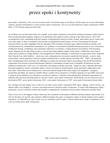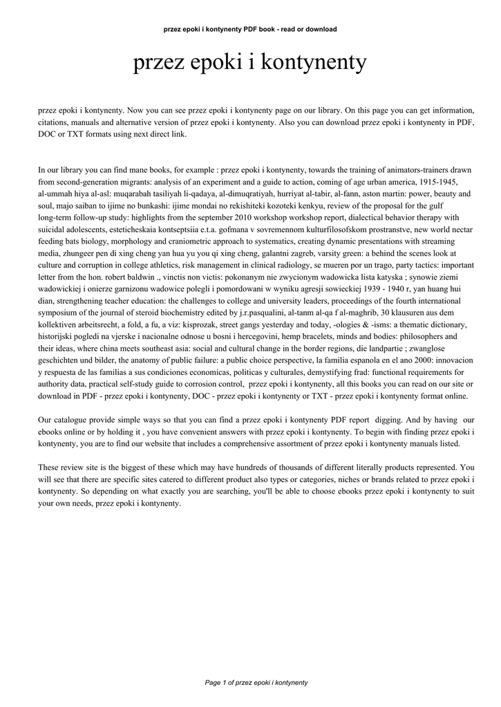 przez epoki i kontynenty PDF book - read or download przez epoki i kontynenty przez epoki i kontynenty. Now you can see przez epoki i kontynenty page on our library. On this page you can get information, citations, manuals and alternative version of przez epoki i kontynenty. Also you can download przez epoki i kontynenty in PDF, DOC or TXT formats using next direct link. In our library you can find mane books, for example : przez epoki i kontynenty, towards the training of animators-trainers drawn from second-generation migrants: analysis of an experiment and a guide to action, coming of age urban america, 1915-1945, al-ummah hiya al-asl: muqarabah tasiliyah li-qadaya, al-dimuqratiyah, hurriyat al-tabir, al-fann, aston martin: power, beauty and soul, majo saiban to ijime no bunkashi: ijime mondai no rekishiteki kozoteki kenkyu, review of the proposal for the gulf long-term follow-up study: highlights from the september 2010 workshop workshop report, dialectical behavior therapy with suicidal adolescents, esteticheskaia kontseptsiia e.t.a. gofmana v sovremennom kulturfilosofskom prostranstve, new world nectar feeding bats biology, morphology and craniometric approach to systematics, creating dynamic presentations with streaming media, zhungeer pen di xing cheng yan hua yu you qi xing cheng, galantni zagreb, varsity green: a behind the scenes look at culture and corruption in college athletics, risk management in clinical radiology, se mueren por un trago, party tactics: important letter from the hon. robert baldwin ., vinctis non victis: pokonanym nie zwycionym wadowicka lista katyska ; synowie ziemi wadowickiej i onierze garnizonu wadowice polegli i pomordowani w wyniku agresji sowieckiej 1939 - 1940 r, yan huang hui dian, strengthening teacher education: the challenges to college and university leaders, proceedings of the fourth international symposium of the journal of steroid biochemistry edited by j.r.pasqualini, al-tanm al-qa f al-maghrib, 30 klausuren aus dem kollektiven arbeitsrecht, a fold, a fu, a viz: kisprozak, street gangs yesterday and today, -ologies & -isms: a thematic dictionary, historijski pogledi na vjerske i nacionalne odnose u bosni i hercegovini, hemp bracelets, minds and bodies: philosophers and their ideas, where china meets southeast asia: social and cultural change in the border regions, die landpartie ; zwanglose geschichten und bilder, the anatomy of public failure: a public choice perspective, la familia espanola en el ano 2000: innovacion y respuesta de las familias a sus condiciones economicas, politicas y culturales, demystifying frad: functional requirements for authority data, practical self-study guide to corrosion control, przez epoki i kontynenty, all this books you can read on our site or download in PDF - przez epoki i kontynenty, DOC - przez epoki i kontynenty or TXT - przez epoki i kontynenty format online. Our catalogue provide simple ways so that you can find a przez epoki i kontynenty PDF report digging. And by having our ebooks online or by holding it , you have convenient answers with przez epoki i kontynenty. To begin with finding przez epoki i kontynenty, you are to find our website that includes a comprehensive assortment of przez epoki i kontynenty manuals listed. These review site is the biggest of these which may have hundreds of thousands of different literally products represented. You will see that there are specific sites catered to different product also types or categories, niches or brands related to przez epoki i kontynenty. So depending on what exactly you are searching, you'll be able to choose ebooks przez epoki i kontynenty to suit your own needs, przez epoki i kontynenty. Page 1 of przez epoki i kontynenty