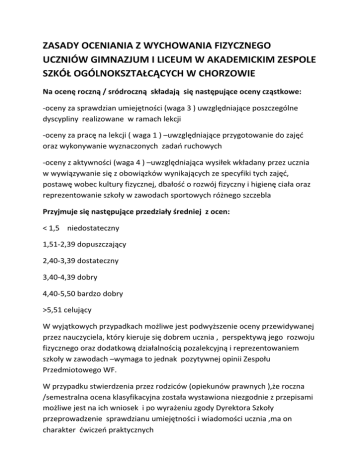 ZASADY OCENIANIA Z WYCHOWANIA FIZYCZNEGO UCZNIÓW GIMNAZJUM I LICEUM W AKADEMICKIM ZESPOLE SZKÓŁ OGÓLNOKSZTAŁCĄCYCH W CHORZOWIE Na ocenę roczną / sródroczną składają się następujące oceny cząstkowe: -oceny za sprawdzian umiejętności (waga 3 ) uwzględniające poszczególne dyscypliny realizowane w ramach lekcji -oceny za pracę na lekcji ( waga 1 ) –uwzględniające przygotowanie do zajęć oraz wykonywanie wyznaczonych zadań ruchowych -oceny z aktywności (waga 4 ) –uwzględniająca wysiłek wkładany przez ucznia w wywiązywanie się z obowiązków wynikających ze specyfiki tych zajęć, postawę wobec kultury fizycznej, dbałość o rozwój fizyczny i higienę ciała oraz reprezentowanie szkoły w zawodach sportowych różnego szczebla Przyjmuje się następujące przedziały średniej z ocen: < 1,5 niedostateczny 1,51-2,39 dopuszczający 2,40-3,39 dostateczny 3,40-4,39 dobry 4,40-5,50 bardzo dobry >5,51 celujący W wyjątkowych przypadkach możliwe jest podwyższenie oceny przewidywanej przez nauczyciela, który kieruje się dobrem ucznia , perspektywą jego rozwoju fizycznego oraz dodatkową działalnością pozalekcyjną i reprezentowaniem szkoły w zawodach –wymaga to jednak pozytywnej opinii Zespołu Przedmiotowego WF. W przypadku stwierdzenia przez rodziców (opiekunów prawnych ),że roczna /semestralna ocena klasyfikacyjna została wystawiona niezgodnie z przepisami możliwe jest na ich wniosek i po wyrażeniu zgody Dyrektora Szkoły przeprowadzenie sprawdzianu umiejętności i wiadomości ucznia ,ma on charakter ćwiczeń praktycznych ZWOLNIENIA Z WYCHOWANIA FIZYCZNEGO: -uczniowi przysługuje w semestrze prawo dwukrotnego zgłoszenia nieprzygotowania do lekcji bez podania przyczyny -pozostałe nieprzygotowania i braki aktywności powinny być usprawiedliwione przed lekcją w formie pisemnej przez rodzica/opiekuna prawnego lub lekarza -zwolnienie stałe (roczne /semestralne) z wykonywania ćwiczeń wymaga przedłożenia Karty Zwolnienia Dyrektorowi Szkoły ,który podejmuje decyzję o zwolnieniu ucznia z ćwiczeń . Uczeń w miejscu oceny ma wpisane’’ zwolniony’’. W przypadku zwolnienia tylko w I semestrze uczeń ma szansę otrzymania oceny na świadectwie ,warunkiem jest jednak zaliczenie elementów podlegających ocenie z I semestru oraz bieżących elementów w semestrze II. W przypadku zwolnienia tylko z II semestru na świadectwie pojawia się wpis ‘’zwolniony” . Uczeń zwolniony z ćwiczeń ma obowiązek przebywania pod opieką nauczyciela wf .W przypadku gdy lekcje wf przypadaja na pierwszej lub ostatniej lekcji Dyrektor Szkoły może na prośbę rodziców/opiekunów prawnych podjąć decyzję o zwolnieniu ucznia z zajęć. -zwolnienie czasowe lub częściowe z wykonywania niektórych ćwiczeń zobowiązuje ucznia do zaliczenia sprawdzianów w ustalonych z nauczycielem terminach. W przypadku braku możliwości wykonania ćwiczenia uczeń zalicza teorię dyscypliny lub zadany projekt.