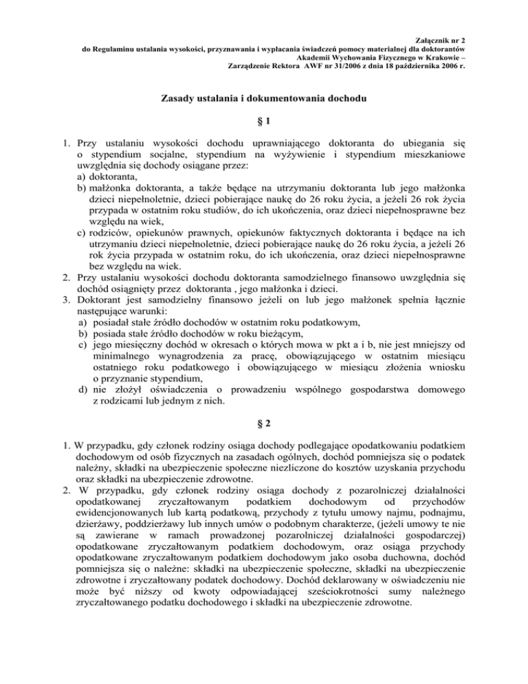 Załącznik nr 2 do Regulaminu ustalania wysokości, przyznawania i wypłacania świadczeń pomocy materialnej dla doktorantów Akademii Wychowania Fizycznego w Krakowie – Zarządzenie Rektora AWF nr 31/2006 z dnia 18 października 2006 r. Zasady ustalania i dokumentowania dochodu §1 1. Przy ustalaniu wysokości dochodu uprawniającego doktoranta do ubiegania się o stypendium socjalne, stypendium na wyżywienie i stypendium mieszkaniowe uwzględnia się dochody osiągane przez: a) doktoranta, b) małżonka doktoranta, a także będące na utrzymaniu doktoranta lub jego małżonka dzieci niepełnoletnie, dzieci pobierające naukę do 26 roku życia, a jeżeli 26 rok życia przypada w ostatnim roku studiów, do ich ukończenia, oraz dzieci niepełnosprawne bez względu na wiek, c) rodziców, opiekunów prawnych, opiekunów faktycznych doktoranta i będące na ich utrzymaniu dzieci niepełnoletnie, dzieci pobierające naukę do 26 roku życia, a jeżeli 26 rok życia przypada w ostatnim roku, do ich ukończenia, oraz dzieci niepełnosprawne bez względu na wiek. 2. Przy ustalaniu wysokości dochodu doktoranta samodzielnego finansowo uwzględnia się dochód osiągnięty przez doktoranta , jego małżonka i dzieci. 3. Doktorant jest samodzielny finansowo jeżeli on lub jego małżonek spełnia łącznie następujące warunki: a) posiadał stałe źródło dochodów w ostatnim roku podatkowym, b) posiada stałe źródło dochodów w roku bieżącym, c) jego miesięczny dochód w okresach o których mowa w pkt a i b, nie jest mniejszy od minimalnego wynagrodzenia za pracę, obowiązującego w ostatnim miesiącu ostatniego roku podatkowego i obowiązującego w miesiącu złożenia wniosku o przyznanie stypendium, d) nie złożył oświadczenia o prowadzeniu wspólnego gospodarstwa domowego z rodzicami lub jednym z nich. §2 1. W przypadku, gdy członek rodziny osiąga dochody podlegające opodatkowaniu podatkiem dochodowym od osób fizycznych na zasadach ogólnych, dochód pomniejsza się o podatek należny, składki na ubezpieczenie społeczne niezliczone do kosztów uzyskania przychodu oraz składki na ubezpieczenie zdrowotne. 2. W przypadku, gdy członek rodziny osiąga dochody z pozarolniczej działalności opodatkowanej zryczałtowanym podatkiem dochodowym od przychodów ewidencjonowanych lub kartą podatkową, przychody z tytułu umowy najmu, podnajmu, dzierżawy, poddzierżawy lub innych umów o podobnym charakterze, (jeżeli umowy te nie są zawierane w ramach prowadzonej pozarolniczej działalności gospodarczej) opodatkowane zryczałtowanym podatkiem dochodowym, oraz osiąga przychody opodatkowane zryczałtowanym podatkiem dochodowym jako osoba duchowna, dochód pomniejsza się o należne: składki na ubezpieczenie społeczne, składki na ubezpieczenie zdrowotne i zryczałtowany podatek dochodowy. Dochód deklarowany w oświadczeniu nie może być niższy od kwoty odpowiadającej sześciokrotności sumy należnego zryczałtowanego podatku dochodowego i składki na ubezpieczenie zdrowotne. 3. Wysokość składki na ubezpieczenie zdrowotne, o której mowa w ust. 1 i 2, oblicza się według następującego wzoru: Sp·P S = --------Pp gdzie: S – składka na ubezpieczenie zdrowotne wyrażona w złotych, Sp – składka na ubezpieczenie zdrowotne odliczona od podatku wyrażona w złotych (wykazana w zaświadczeniu z urzędu skarbowego), P – składka na ubezpieczenie zdrowotne wyrażona w procentach obowiązująca w roku kalendarzowym poprzedzającym okres zasiłkowy (1), Pp – składka na ubezpieczenie zdrowotne odliczona od podatku wyrażona w procentach (2). (1) P wynosi: 8% przy liczeniu dochodu za 2003 rok, 8,25% za 2004 rok, 8,5% za 2005 rok (2) Pp wynosi 7,75% §3 Wymienione poniżej dokumenty powinny zostać przedstawione w oryginale (odpisie). Jednakże w uzasadnionych przypadkach dokumenty mogą być przedstawione w uwierzytelnionych kopiach. Uwierzytelnienia może dokonać pracownik Działu Nauczania, członek komisji stypendialnej, notariusz lub instytucja, która dokument wydała. §4 Do wniosku należy dołączyć właściwe dokumenty, dotyczące członków rodziny, tj.: 1) zaświadczenia lub oświadczenia stwierdzające wysokość dochodu rodziny, w tym odpowiednio: a) dla wszystkich pełnoletnich członków rodziny - zaświadczenia z urzędu skarbowego o wysokości dochodów uzyskanych przez członków rodziny w ubiegłym roku kalendarzowym, jeżeli dochody te podlegają opodatkowaniu podatkiem dochodowym od osób fizycznych na zasadach ogólnych - zawierające informacje o wysokości dochodu, wysokości składek na ubezpieczenie społeczne odliczonych od dochodu, wysokości składek na ubezpieczenie zdrowotne odliczonych od podatku i wysokości należnego podatku - lub zaświadczenie o niefigurowaniu w rejestrze podatników podatku dochodowego; b) w przypadku, członków rodziny, którzy rozliczają się na podstawie przepisów o zryczałtowanym podatku dochodowym od niektórych przychodów osiąganych przez osoby fizyczne: - zaświadczenia z urzędu skarbowego o wysokości należnego zryczałtowanego podatku dochodowego za dany rok albo decyzję lub decyzje ustalające wysokość podatku dochodowego w formie karty podatkowej oraz - oświadczenia członków rodziny o wysokości uzyskanego dochodu w ubiegłym roku kalendarzowym; wzór oświadczenia określa Załącznik nr 7, c) dla wszystkich pełnoletnich członków rodziny - oświadczenia członków rodziny o wysokości uzyskanego w ubiegłym roku kalendarzowym innego dochodu niepodlegającego opodatkowaniu; wzór oświadczenia określa Załącznik nr 8, d) zaświadczenie właściwego organu gminy o wielkości gospodarstwa rolnego wyrażonej w hektarach przeliczeniowych ogólnej powierzchni użytków rolnych w roku kalendarzowym poprzedzającym okres zasiłkowy albo nakaz płatniczy za ten rok, e) umową dzierżawy, w przypadku oddania części lub całości znajdującego się w posiadaniu rodziny gospodarstwa roln