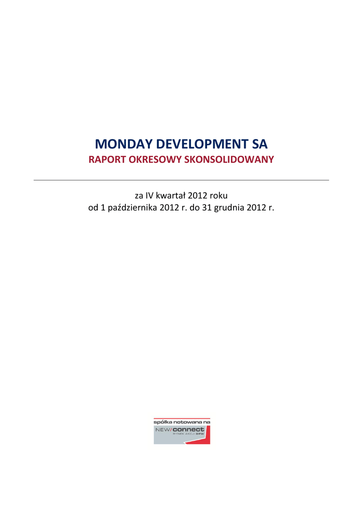 MONDAY DEVELOPMENT SA RAPORT OKRESOWY SKONSOLIDOWANY za IV kwartał 2012 roku od 1 października 2012 r. do 31 grudnia 2012 r. MONDAY DEVELOPMENT SA RAPORT OKRESOWY EMITENTA ZA OKRES 01.10.2012 – 31.12.2012 [SKONSOLIDOWANY] 1. WPROWADZENIE Działalność Emitenta polega na zarządzaniu grupą kapitałową, w ramach której realizowane są inwestycje deweloperskie. Działalność deweloperska Spółki obejmuje następujące obszary: - inwestycje mieszkaniowe, inwestycje biurowe, inwestycje gruntowe. Emitent prowadzi działalność poprzez spółki celowe. Bezpośrednim właścicielem udziałów Emitenta w spółkach celowych jest Fundusz Inwestycyjny Zamknięty Monday (FIZ), działający na podstawie ustawy o Funduszach Inwestycyjnych. Ze względu na strukturę Grupy Monday Development, Zarząd Emitenta uznał, że w części raportu, poświęconego czynnikom i zdarzeniom wpływającym na wynik finansowy (pkt. 6 poniżej) oraz działaniom w obszarze rozwoju prowadzonej działalności (pkt. 7 poniżej), konieczne jest także przedstawienie okoliczności i zdarzeń dotyczących projektów prowadzonych przez poszczególne spółki celowe, pomimo iż nie są one formalnie spółkami zależnymi Emitenta i nie podlegają konsolidacji. 2. PODSTAWOWE INFORMACJE O EMITENCIE 2.1. Monday Development SA jest wpisana do Rejestru Przedsiębiorców pod numerem KRS 0000323647. Wpisu dokonał Sąd Rejonowy Poznań Nowe Miasto i Wilda w Poznaniu VIII Wydział Gospodarczy Krajowego Rejestru Sądowego. Siedziba Spółki mieści się w Poznaniu, ul. Piątkowska 116. 2.2. Spółka otrzymała następujące numery identyfikacyjne: REGON NIP 301054767 7811832838 2.3. Dane teleadresowe MONDAY DEVELOPMENT SA ul. Piątkowska 116 60-649 Poznań tel. (+48) 61 670-50-00 fax. (+48) 61 670-50-01 www.mondaydevelopment.pl [email protected] 2.4. Zarząd Kurt Montgomery - Prezes Zarządu Monika Owerko - Członek Zarządu Piotr Łopatka - Członek Zarządu 2 MONDAY DEVELOPMENT SA RAPORT OKRESOWY EMITENTA ZA OKRES 01.10.2012 – 31.12.2012 [SKONSOLIDOWANY] 3. SPÓŁKI ZALEŻNE EMITENTA NAZWA SPÓŁKI PROFIL SPÓŁKI UDZIAŁ EMITENTA MONDAY SP. Z O.O. komplementariusz w spółkach deweloperskich 100,0 % MONDAY MANAGEMENT SP. Z O.O. komplementariusz w spółce zarządzającej 100,0 % INTERNAL FINANCE SP. Z O.O. komplementariusz w spółce finansującej 100,0 % LUNEDI SP. Z O.O. komplementariusz w spółce realizacyjnej 100,0 % Emitent jest jedynym właścicielem certyfikatów inwestycyjnych Funduszu Inwestycyjnego Zamkniętego MONDAY, który ze względu na to, że nie spełnia definicji jednostki zależnej, nie podlega konsolidacji. 4. AKCJONARIAT EMITENTA 3 MONDAY DEVELOPMENT SA RAPORT OKRESOWY EMITENTA ZA OKRES 01.10.2012 – 31.12.2012 [SKONSOLIDOWANY] 5. WYBRANE JEDNOSTKOWE DANE FINANSOWE 4Q 2012 4Q 2011 4Q2012 4Q2011 01.10.2012 31.12.2012 01.10.2011 31.12.2011 01.01.2012 31.12.2012 01.01.2011 31.12.2011 NALEŻNOŚCI DŁUGOTERMINOWE - - - - INWESTYCJE DŁUGOTERMINOWE 23 795 24 594 23 795 24 594 NALEŻNOŚCI KRÓTKOTERMINOWE 1 413 73 1 413 73 INWESTYCJE KRÓTKOTERMINOWE 2 543 7 968 2 543 7 968 11 5 11 5 17 276 23 018 17 276 23 018 - 478 - 478 8 578 5 769 8 578 5 769 - - - - PRZYCHODY NETTO ZE SPRZEDAŻY 1 827 360 2 249 1 481 ZYSK/STRATA NA SPRZEDAŻY 1 034 21 106 123 ZYSK/STRATA NA DZIAŁALNOŚCI OPERACYJNEJ 1 034 21 103 121 ZYSK/STRATA BRUTTO 1 027 21 97 125 919 130 70 240 WYSZCZEGÓLNIENIE ŚRODKI PIENIĘŻNE I INNE AKTYWA PIENIĘŻNE KAPITAŁ WŁASNY ZOBOWIĄZANIA DŁUGOTERMINOWE ZOBOWIĄZANIA KRÓTKOTERMINOWE AMORTYZACJA w tys. PLN ZYSK/STRATA NETTO 4 MONDAY DEVELOPMENT SA RAPORT OKRESOWY EMITENTA ZA OKRES 01.10.2012 – 31.12.2012 [SKONSOLIDOWANY] 6. WYBRANE SKONSOLIDOWANE DANE FINANSOWE 4Q 2012 4Q 2011 4Q 2012 4Q 2011 WYSZCZEGÓLNIENIE 01.10.2012 31.12.2012 01.10.2011 31.12.2011 01.01.2012 31.12.2012 01.01.2011 31.12.2011 NALEŻNOŚCI DŁUGOTERMINOWE - - - - INWESTYCJE DŁUGOTERMINOWE 23 423 28 182 23 423 28 182 NALEŻNOŚCI KRÓTKOTERMINOWE 1 489 161 1 489 161 INWESTYCJE KRÓTKOTERMINOWE 2 617 13 842 2 617 13 842 84 696 84 696 17 086 26 092 17 086 26 092 33 7 097 33 7 097 8 586 5 056 8 586 5 056 - - - - PRZYCHODY NETTO ZE SPRZEDAŻY 1 873 360 2 400 1 800 ZYSK/STRATA NA SPRZEDAŻY 1 067 14 216 371 ZYSK/STRATA NA DZIAŁALNOŚCI OPERACYJNEJ 1 066 14 213 369 ZYSK/STRATA BRUTTO 1 067 14 164 373 947 152 117 500 ŚRODKI PIENIĘŻNE I INNE AKTYWA PIENIĘŻNE KAPITAŁ WŁASNY ZOBOWIĄZANIA DŁUGOTERMINOWE ZOBOWIĄZANIA KRÓTKOTERMINOWE AMORTYZACJA w tys. PLN ZYSK/STRATA NETTO w tys. PLN 5 MONDAY DEVELOPMENT SA RAPORT OKRESOWY EMITENTA ZA OKRES 01.10.2012 – 31.12.2012 [SKONSOLIDOWANY] 7. CZYNNIKI I ZDARZENIA, KTÓRE MIAŁY WPŁYW NA OSIĄGNIĘTE WYNIKI FINANSOWE 7.1. Emitent zaktualizował wycenę spółek portfelowych należących do Monday FIZ, w wyniku której zwiększyła się wycena tych spółek na łączną wartość 3.562 tys. zł. Po raz pierwszy uwzględniono w wycenie projekt Małe Garbary, którego zdyskontowana wartość projektu dla Emitenta wynosi 765 tys. zł. Pozostała kwota zwiększająca wartość certyfikatów FIZ jest pochodną aktualizacji założeń projektów i zmianą wartości rezydualnej. 7.2. Emitent sprzedał swój udział w projekcie Botaniczna na rzecz spółki z grupy kapitałowej NICKEL. Udział w projekcie Botaniczna na koniec trzeciego kwartału, uwzględniając gwarancje z umowy inwestycyjnej, wyceniany był na 8.974 tys. zł. Emitent uzyskał przychód z transakcji w wysokości 7.146 tys. zł, Umowa sprzedaży przewiduje złożoną formę płatności ceny, która dokonana zostanie w formie gotówki, nieruchomości oraz wierzytelności. Pozyskane środki finansowe zostaną skierowane do innych projektów spółki. 7.3. W czwartym kwartale Spółka pokryła straty za poprzednie trzy kwartały przychodami z wykupu certyfikatów przez Monday FIZ. Monday FIZ umorzył 615.000 sztuk certyfikatów za kwotę 1.728 tys. zł co pozwoliło osiągnąć zysk z umorzenia na poziomie 1.349 tys. zł. 7.4