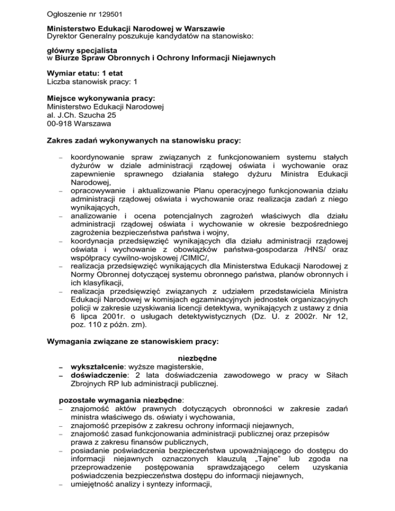 Ogłoszenie nr 129501 Ministerstwo Edukacji Narodowej w Warszawie Dyrektor Generalny poszukuje kandydatów na stanowisko: główny specjalista w Biurze Spraw Obronnych i Ochrony Informacji Niejawnych Wymiar etatu: 1 etat Liczba stanowisk pracy: 1 Miejsce wykonywania pracy: Ministerstwo Edukacji Narodowej al. J.Ch. Szucha 25 00-918 Warszawa Zakres zadań wykonywanych na stanowisku pracy: − − − − − − koordynowanie spraw związanych z funkcjonowaniem systemu stałych dyŜurów w dziale administracji rządowej oświata i wychowanie oraz zapewnienie sprawnego działania stałego dyŜuru Ministra Edukacji Narodowej, opracowywanie i aktualizowanie Planu operacyjnego funkcjonowania działu administracji rządowej oświata i wychowanie oraz realizacja zadań z niego wynikających, analizowanie i ocena potencjalnych zagroŜeń właściwych dla działu administracji rządowej oświata i wychowanie w okresie bezpośredniego zagroŜenia bezpieczeństwa państwa i wojny, koordynacja przedsięwzięć wynikających dla działu administracji rządowej oświata i wychowanie z obowiązków państwa-gospodarza /HNS/ oraz współpracy cywilno-wojskowej /CIMIC/, realizacja przedsięwzięć wynikających dla Ministerstwa Edukacji Narodowej z Normy Obronnej dotyczącej systemu obronnego państwa, planów obronnych i ich klasyfikacji, realizacja przedsięwzięć związanych z udziałem przedstawiciela Ministra Edukacji Narodowej w komisjach egzaminacyjnych jednostek organizacyjnych policji w zakresie uzyskiwania licencji detektywa, wynikających z ustawy z dnia 6 lipca 2001r. o usługach detektywistycznych (Dz. U. z 2002r. Nr 12, poz. 110 z późn. zm). Wymagania związane ze stanowiskiem pracy: − − niezbędne wykształcenie: wyŜsze magisterskie, doświadczenie: 2 lata doświadczenia zawodowego w pracy w Siłach Zbrojnych RP lub administracji publicznej. pozostałe wymagania niezbędne: − znajomość aktów prawnych dotyczących obronności w zakresie zadań ministra właściwego ds. oświaty i wychowania, − znajomość przepisów z zakresu ochrony informacji niejawnych, − znajomość zasad funkcjonowania administracji publicznej oraz przepisów prawa z zakresu finansów publicznych, − posiadanie poświadczenia bezpieczeństwa upowaŜniającego do dostępu do informacji niejawnych oznaczonych klauzulą „Tajne” lub zgoda na przeprowadzenie postępowania sprawdzającego celem uzyskania poświadczenia bezpieczeństwa dostępu do informacji niejawnych, − umiejętność analizy i syntezy informacji, − − − − − − − dokładność i precyzja w działaniu, bardzo dobra organizacja pracy własnej, kreatywność, komunikatywność, umiejętność samodzielnego rozwiązywania problemów, umiejętność pracy w sytuacjach stresowych, gotowość do wyjazdów słuŜbowych. wymagania dodatkowe − − − − doświadczenie na stanowiskach związanych z bezpieczeństwem narodowym, doświadczenie na stanowiskach związanych z kierowaniem/koordynowaniem pracy zespołu, doświadczenie w pracy na samodzielnym stanowisku w Siłach Zbrojnych RP lub organach administracji publicznej w obszarze bezpieczeństwa narodowego, doświadczenie w opracowywaniu planów operacyjnych, Wymagane dokumenty i oświadczenia: − − − − − − − − Ŝyciorys i list motywacyjny, oświadczenie kandydata o wyraŜeniu zgody na przetwarzanie danych osobowych do celów rekrutacji, kopie dokumentów potwierdzających wykształcenie, kopia dokumentu potwierdzającego posiadanie polskiego obywatelstwa lub oświadczenie o posiadaniu obywatelstwa polskiego, oświadczenie kandydata o nieskazaniu prawomocnym wyrokiem za umyślne przestępstwo lub umyślne przestępstwo skarbowe, oświadczenie kandydata o korzystaniu z pełni praw publicznych, kopie posiadanego poświadczenia bezpieczeństwa dostępu do informacji niejawnych oznaczonych klauzulą „Tajne” lub oświadczenie o zgodzie na przeprowadzenie postępowania sprawdzającego celem uzyskania poświadczenia bezpieczeństwa do dostępu do informacji niejawnych, kopie dokumentów potwierdzających wymagane doświadczenie zawodowe. PoŜądane są kopie dokumentów potwierdzających posiadane kwalifikacje, uprawnienia oraz szkolenia. Dokumenty naleŜy przesłać lub składać do: 6 grudnia 2010 r. pod adresem: Ministerstwo Edukacji Narodowej Biuro Kadr i Szkolenia, pok. 55 al. J. Ch. Szucha 25 00-918 Warszawa (z dopiskiem „Oferta pracy główny specjalista BON-1) Inne informacje: Do składania dokumentów zachęcamy równieŜ osoby niepełnosprawne. Kandydaci spełniający wymagania formalne, którzy - po analizie ofert - zostaną zakwalifikowani do kolejnego etapu naboru, będą powiadomieni o terminie jego przeprowadzenia. Zastrzegamy sobie moŜliwość kontaktowania się z wybranymi kandydatami. Oświadczenia, list motywacyjny oraz cv muszą być podpisane własnoręcznie. Oferty nadesłane (poza ofertą wyłonionego kandydata) zostaną komisyjnie zniszczone po zakończeniu naboru. Dodatkowe informacje moŜna uzyskać pod nr tel. 34-74-738, 22 34-74-852, 34-74-170