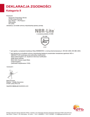 DEKLARACJA ZGODNOŚCI Kategoria II Producent Advanced Technology Gloves ATG® Lanka (Pvt) Ltd. Spur Road 7 – IPZ Phase 2 Katunayake Sri Lanka oświadcza, że środek ochrony indywidualnej opisany poniżej o numerze produktu 34-985 EN 388 4121 jest zgodny z przepisami dyrektywy Rady 89/686/EWG i z normą zharmonizowaną nr. EN 420: 2003, EN 388: 2003; jest identyczny ze środkiem ochrony indywidualnej będącym przedmiotem świadectwa zgodności WE nr. GB05/64772,00 wydanego przez jednostkę notyfikowaną SGS United Kingdom Ltd. Systems & Services Certification 202B Worle Parkway BS22 6WA Weston-super-Mare United Kingdom (Jednostka notyfikowana: 0120). 10.05.2011 Sisira Kumara Director - Quality Assurance ATG® Lanka (Pvt) Ltd. [email protected] Niniejszy dokument stanowi własność ATG®, a zawarte w nim informacje stanowią zastrzeżone informacje ATG® Lanka (Pvt) Ltd. Spur Road 7, Phase 2 - IPZ, Katunayake - Sri Lanka - T +94-11-48389000 - F +94-11-2253887 - E [email protected]