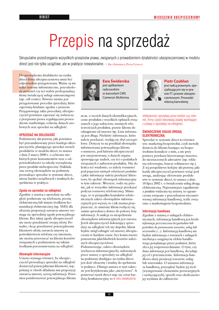 DIRECT MIESIĘCZNIK UBEZPIECZENIOWY Przepis na sprzedaż Skrupulatne przestrzeganie wszystkich przepisów prawa, związanych z prowadzeniem działalności ubezpieczeniowej w modelu direct jest nie tylko uciążliwe, ale w praktyce niewykonalne. – EWA ŚWIDERSKA, PIOTR CZUBLUN D Do prowadzenia działalności na rynku direct firma ubezpieczeniowa musi być odpowiednio przygotowana. Ważne są nie tylko systemy informatyczne, przeszkolony personel czy też wybór profesjonalnej firmy świadczącej usługi outsourcingowe (np. call centre). Równie istotne jest przygotowanie procedur sprzedaży, które zapewnią działanie zgodne z prawem. Przygotowując takie procedury, ubezpieczyciel powinien zapoznać się zwłaszcza z przepisami prawa regulującymi prowadzenie marketingu, ochronę danych osobowych oraz sprzedaż na odległość. SPRZEDAŻ NA ODLEGŁOŚĆ Podstawowy akt prawny, jaki powinien być przeanalizowany przez każdego ubezpieczyciela, planującego sprzedaż swoich produktów w modelu direct, to ustawa z dnia 2 marca 2000 r. o ochronie niektórych praw konsumentów oraz o odpowiedzialności za szkodę wyrządzoną przez produkt niebezpieczny. Nakłada ona szereg obowiązków na podmioty prowadzące sprzedaż w systemie direct, nieraz bardzo uciążliwych i trudnych do spełnienia w praktyce. Zgoda na sprzedaż na odległość Zgodnie z ustawą o sprzedaży na odległość posłużenie się telefonem, pocztą elektroniczną lub innym środkiem komunikacji elektronicznej (np. SMS) dla złożenia propozycji zawarcia umowy wymaga się uprzedniej zgody potencjalnego klienta. Bez takiej zgody ubezpieczyciel nie może przedstawić swojej oferty. Ponadto, chcąc przedstawić potencjalnemu klientowi ofertę zawarcia umowy za pośrednictwem telefonu czy internetu, nie można przerzucać na klienta kosztów związanych z posłużeniem się takimi środkami porozumiewania na odległość. Obowiązki informacyjne Ustawa wymaga również, by ubezpieczyciel prowadzący sprzedaż na odległość dostarczył potencjalnemu klientowi, najpóźniej w chwili składania mu propozycji zawarcia umowy, szereg informacji. Powinien poinformować potencjalnego klienta Ewa Świderska Piotr Czublun jest aplikantem radcowskim w kancelarii CMS Cameron McKenna. jest radcą prawnym, specjalizującym się w prawie IT i prawie ubezpieczeniowym. Prowadzi własną kancelarię. m.in. o swoich danych identyfikacyjnych, cenie produktu i wszelkich opłatach związanych z jego nabyciem, istotnych właściwościach produktu, prawie klienta do odstąpienia od umowy itp. Lista informacji jest długa. Niektóre informacje, które należy przekazać, wydają się zbyt szczegółowe. Dotyczy to na przykład obowiązku informowania potencjalnego klienta o numerze, pod którym ubezpieczyciel jest zarejestrowany, o danych organu sprawującego nadzór, czy też o podatkach związanych z nabyciem produktu. Nie do końca też wiadomo, co należy rozumieć pod pojęciem istotnych właściwości produktu i jakie informacje należy przekazać klientowi, by spełnić obowiązek informacyjny w tym zakresie. Wreszcie, rodzi się pytanie, jak te wszystkie informacje przekazać podczas rozmowy telefonicznej. Mimo tego, że w przypadku kontaktów telefonicznych zakres obowiązków informacyjnych jest węższy, to i tak można przypuszczać, że znużony klient rozłączy się, zanim sprzedawca dotrze do połowy listy informacji. A sankcja za niespełnienie obowiązków informacyjnych jest surowa. Jeżeli ubezpieczyciel dokonujący sprzedaży na odległość ich nie dopełni, klient będzie mógł odstąpić od umowy ubezpieczenia w każdym czasie, bez konieczności ponoszenia jakichkolwiek kosztów należnych ubezpieczycielowi. Podsumowując, zakres obowiązków (zwłaszcza informacyjnych), nałożonych przez ustawę o sprzedaży na odległość na podmioty działające na rynku direct jest dość obszerny i trudny do spełnienia w praktyce. Dlatego ustawa w tym zakresie jest krytykowana jako „nieżyciowa”. A ponieważ rynek direct staje się coraz bardziej konkurencyjny, to w celu zwiększenia 42 efektywności sprzedaży przez telefon czy internet, firmy często lekceważą zasady wynikające z ustawy o sprzedaży na odległość. ŚWIADCZENIE USŁUG DROGĄ ELEKTRONICZNĄ Sprzedaż w systemie direct to również tzw. marketing bezpośredni, czyli metody dotarcia do klienta bazujące na bezpośrednim kontakcie z nim, a nie przy pomocy przekazu kierowanego masowo, do nieznaczonych adresatów (np. reklama telewizyjna, banery reklamowe itp.). Z tej perspektywy kolejny akt prawny, jaki każdy ubezpieczyciel powinien wziąć pod uwagę, analizując oferowanie produktów w systemie direct, to ustawa z dnia 18 lipca 2002 r. o świadczeniu usług drogą elektroniczną. Najważniejsze zagadnienie z punktu widzenia tej ustawy, to ograniczenia związane z przesyłaniem niezamówionej informacji handlowej, ściśle związane z marketingiem bezpośrednim. Informacja handlowa Zgodnie z ustawą o usługach elektronicznych, informacją handlową jest każda informacja przeznaczona bezpośrednio lub pośrednio do promowania towarów, usług lub wizerunku (...). Informacją handlową nie będzie informacja o towarach i usługach niesłużąca osiągnięciu efektu handlowego pożądanego przez podmiot, który zleca jej rozpowszechnianie. O tym, czy dana informacja jest handlową, decyduje jej cel i przeznaczenie. Informacja handlowa służy promocji towarów, usług lub wizerunku. O uznaniu informacji za handlową, przesądzać będzie jej treść (występowanie elementów perswazyjnych i zachęcających), sposób oraz okoliczności jej wysłania do odbiorców. DIRECT LUTY 2010 Zgodnie z art. 10 ust. 1 tej ustawy zakazane jest przesyłanie niezamówionej informacji handlowej, skierowanej do oznaczonego odbiorcy za pomocą środków komunikacji elektronicznej, w szczególności poczty elektronicznej. Celem powyższego ograniczenia jest uniemożliwienie przes