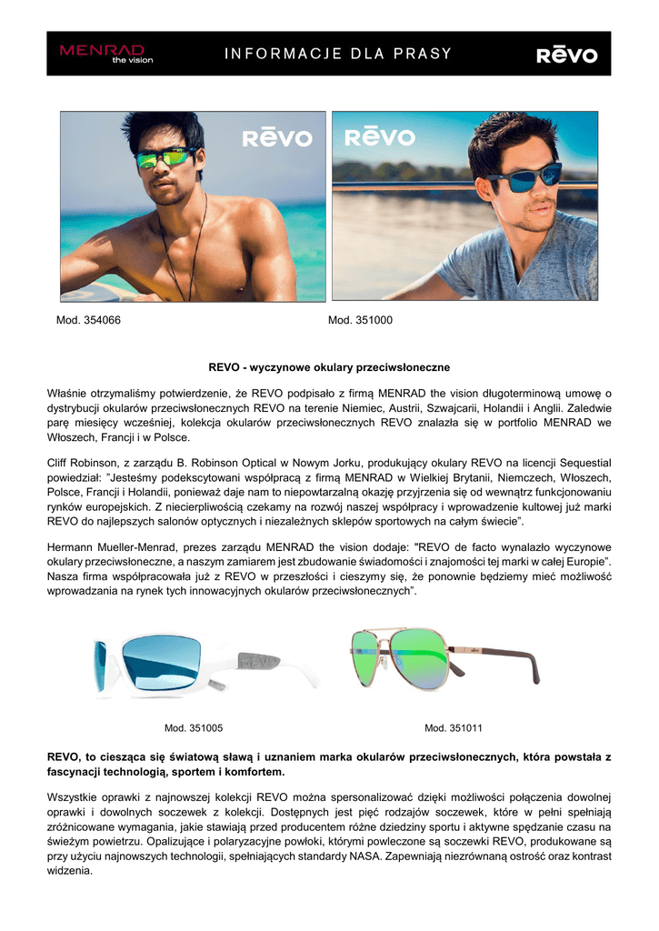 Mod. 354066 Mod. 351000 REVO - wyczynowe okulary przeciwsłoneczne Właśnie otrzymaliśmy potwierdzenie, że REVO podpisało z firmą MENRAD the vision długoterminową umowę o dystrybucji okularów przeciwsłonecznych REVO na terenie Niemiec, Austrii, Szwajcarii, Holandii i Anglii. Zaledwie parę miesięcy wcześniej, kolekcja okularów przeciwsłonecznych REVO znalazła się w portfolio MENRAD we Włoszech, Francji i w Polsce. Cliff Robinson, z zarządu B. Robinson Optical w Nowym Jorku, produkujący okulary REVO na licencji Sequestial powiedział: ”Jesteśmy podekscytowani współpracą z firmą MENRAD w Wielkiej Brytanii, Niemczech, Włoszech, Polsce, Francji i Holandii, ponieważ daje nam to niepowtarzalną okazję przyjrzenia się od wewnątrz funkcjonowaniu rynków europejskich. Z niecierpliwością czekamy na rozwój naszej współpracy i wprowadzenie kultowej już marki REVO do najlepszych salonów optycznych i niezależnych sklepów sportowych na całym świecie”. Hermann Mueller-Menrad, prezes zarządu MENRAD the vision dodaje: "REVO de facto wynalazło wyczynowe okulary przeciwsłoneczne, a naszym zamiarem jest zbudowanie świadomości i znajomości tej marki w całej Europie”. Nasza firma współpracowała już z REVO w przeszłości i cieszymy się, że ponownie będziemy mieć możliwość wprowadzania na rynek tych innowacyjnych okularów przeciwsłonecznych”. Mod. 351005 Mod. 351011 REVO, to ciesząca się światową sławą i uznaniem marka okularów przeciwsłonecznych, która powstała z fascynacji technologią, sportem i komfortem. Wszystkie oprawki z najnowszej kolekcji REVO można spersonalizować dzięki możliwości połączenia dowolnej oprawki i dowolnych soczewek z kolekcji. Dostępnych jest pięć rodzajów soczewek, które w pełni spełniają zróżnicowane wymagania, jakie stawiają przed producentem różne dziedziny sportu i aktywne spędzanie czasu na świeżym powietrzu. Opalizujące i polaryzacyjne powłoki, którymi powleczone są soczewki REVO, produkowane są przy użyciu najnowszych technologii, spełniających standardy NASA. Zapewniają niezrównaną ostrość oraz kontrast widzenia. LIGHT MANAGEMENT SYSTEM™ (LMS)- SYSTEM ZARZĄDZANIA ŚWIATŁEM Soczewki REVO pracują z całym spectrum światła - blokując światło szkodliwe, a przepuszczając dobre. Wszystkie soczewki Revo mają polaryzację. Soczewki REVO, zależnie od rodzaju, filtrują różne długości spectrum światła, ze szczególnym naciskiem na szkodliwe światło niebieskie/światło HEV. • Oryginalne powłoki lustrzane REVO: wszystkie powłoki, stworzone w oparciu o technologie NASA stosowane do ochrony soczewek w kamerach, teleskopach, satelitach i w trakcie kosmicznych spacerów, są produkowane w najnowocześniejszej technologii. Soczewki REVO mają od 8 do 12 powłok. Dodatkowo, wewnętrzna powłoka antyrefleksyjna redukuje odbicia światła od wewnętrznej powierzchni soczewki. • Oryginalna powłoka przeciwdziałająca osadzaniu się brudu: powłoka, która uniemożliwia osadzanie się na powierzchni soczewki: wody, oleju, potu, kurzu, brudu, atramentu, a nawet odcisków palców. • Ochrona przed mikro zadrapaniami: zadrapania na powierzchni soczewki, nawet niewielkie, mogą umożliwić przenikanie do oczu szkodliwego promieniowania UV. Nasze zaawansowane technologicznie, grube powłoki chronią oczy przed promieniowaniem UV i nie pozwalają, by zadrapania uszkadzały powłokę ochronną. • Materiały: Okulary REVO wyposażone są w soczewki Serilium™ - ekskluzywne, bardzo lekkie i odporne na stłuczenia soczewki z poliwęglanu lub w soczewki Crystal - najwyższej jakości szkło Crown Glass, odporne na zarysowania, szlifowane i polerowane według tych samych standardów, co soczewki w aparatach fotograficznych. SOCZEWKI NA KAŻDE WARUNKI Rewolucyjny program korekcyjny (RX ProgramTM ): System zarządzania światłem™ (LMS) i System wysokokontrastowej polaryzacji REVO™ - obie technologie są obecnie dostępne w programie korekcyjnym, zapewniając ten sam poziom ochrony oczu, co w okularach przeciwsłonecznych. Program korekcyjny REVO obejmuje wszystkie zalety technologii LMS, łącznie z powłokami lustrzanymi REVO. REVO & B. ROBINSON Założona w 1985 firma REVO szybko stała się rozpoznawalną na świecie marką wyczynowych okularów przeciwsłonecznych i liderem w technologii soczewek polaryzacyjnych. Pierwsze okulary przeciwsłoneczne REVO stworzono wykorzystując technologię stosowana przez NASA do produkcji soczewek chroniących satetity przed promieniowaniem słonecznym. Prawie trzy dekady później, REVO czerpiąc ze swojej tradycji i rozwijając najnowocześniejsze technologie, oferuje najbardziej zaawansowane technologicznie, wysokokontrastowe soczewki polaryzacyjne. B. Robinson Optical, powstała w 1926 i jest od ponad 85 lat liderem w produkcji okularów. B. Robinson, znana z najwyższej jakości i doskonałego designu posiada licencje na liczne kolekcje modowe. www.revo.com MENRAD the vision: Menrad the vision - firma rodzinna znajdująca się obecnie w rękach czwartego pokolenia rodziny, zajmuje się sprzedażą oprawek korekcyjnych i okularów przeciwsłonecznych od ponad 100 lat. Firma zarządzana obecnie przez braci Hermana and Eberharda Müller-Menrad, ma swoją siedzibę w Niemczech i zatrudnia ponad 1000 pracowników na całym świecie. Swoje oprawki korekcyjne i okulary przeciwsłoneczne sprzedaje w ponad 100 krajach świata. Główne marki w portfelu firmy Menrad to: MENRAD, DAVIDOFF, JOOP!, JAGUAR i MORGAN. Sieć dystrybucji firmy Menrad the vision obejmuje jedenaście filii firmy w: Niemczech, Austrii, Szwajcarii, Francji, Wielkiej Brytanii/Irlandii, Holandii, Polsce, we Włoszech, Turcji, Chinach i na Bliskim Wschodzie. Sprzedaż w innych krajach realizowana jest przez znajdujący się w Niemczech departament eksportu. Marki GANT, GUESS i HACKETT, REVO, SPINE i SUPERDRY dystrybuowane są w Wielu krajach w Europie. MENRAD th