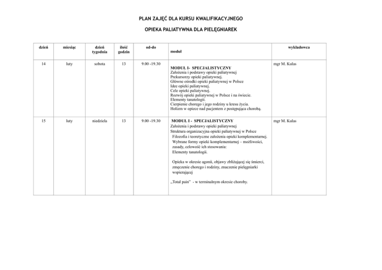 PLAN ZAJĘĆ DLA KURSU KWALIFIKACYJNEGO OPIEKA PALIATYWNA DLA PIELĘGNIAREK dzień miesiąc dzień tygodnia ilość godzin od-do 14 luty sobota 13 9.00 -19.30 15 luty niedziela 13 9.00 -19.30 moduł MODUŁ I- SPECJALISTYCZNY Założenia i podstawy opieki paliatywnej Prekursorzy opieki paliatywnej. Główne ośrodki opieki paliatywnej w Polsce Idee opieki paliatywnej. Cele opieki paliatywnej. Rozwój opieki paliatywnej w Polsce i na świecie. Elementy tanatologii. Cierpienie chorego i jego rodziny u kresu życia. Holizm w opiece nad pacjentem z postępująca chorobą. MODUŁ I - SPECJALISTYCZNY Założenia i podstawy opieki paliatywnej Struktura organizacyjna opieki paliatywnej w Polsce Filozofia i teoretyczne założenia opieki komplementarnej. Wybrane formy opieki komplementarnej – możliwości, zasady, celowość ich stosowania: Elementy tanatologii. Opieka w okresie agonii, objawy zbliżającej się śmierci, zmęczenie chorego i rodziny, znaczenie pielęgniarki wspierającej ! ,,Total pain” - w terminalnym okresie choroby. wykładowca mgr M. Kulas mgr M. Kulas PLAN ZAJĘĆ DLA KURSU KWALIFIKACYJNEGO OPIEKA PALIATYWNA DLA PIELĘGNIAREK 16 luty poniedziałek 8 15.00 -21.15 MODUŁ I - SPECJALISTYCZNY mgr M. Kulas Założenia i podstawy opieki paliatywnej • Filozofia i teoretyczne założenia opieki komplementarnej. Zespół interdyscyplinarny: skład i rola poszczególnych członków zespołu, przepływ informacji w zespole, udzielanie wsparcia, zapobieganie zespołowi wypalenia zawodowego. Filozofia i teoretyczne założenia opieki komplementarnej. Wybrane formy opieki komplementarnej – możliwości, zasady, celowość ich stosowania: − − − − − 21 luty sobota 13 9.00 -19.30 muzykoterapia, aromatoterapia, relaksacje, akupunktura i akupresura ! Moduł I - Ogólnozawodowy Elementy psychologii mgr A. Jankowska-Rachel Moduł IV - Ogólnozawodowy Promocja zdrowia i edukacja zdrowotna mgr T. Gwizdak ! 22 luty niedziela 13 9.00 -19.30 ! PLAN ZAJĘĆ DLA KURSU KWALIFIKACYJNEGO OPIEKA PALIATYWNA DLA PIELĘGNIAREK 5 marzec czwartek 8 15.00 -21.15 MODUŁII - SPECJALISTYCZNY Praktyka pielęgniarska w opiece paliatywnej - problemy duchowe pacjentów, opiekunów - opieka duchowa - religia a przyjmowanie wiadomości o niepomyślnym rokowaniu. Filozofia troski i empatycznego wsparcia w holistycznym modelu pielęgniarstwa. ks. Cz. Matuła Moduł IV - Ogólnozawodowy mgr T. Gwizdak !! ! 6 marzec piątek 13 9.00 -19.30 Promocja zdrowia i edukacja zdrowotna. ! Moduł VII - Ogólnozawodowy Problemy zawodowe pielęgniarek i położnych. 7 marzec sobota 13 9.00 -19.30 Moduł II - Ogólnozawodowy Elementy socjologii. mgr T. Kuziara Moduł II - Ogólnozawodowy Elementy socjologii. mgr T. Kuziara ! 8 marzec niedziela 13 9.00 -19.30 !! ! Moduł III - Ogólnozawodowy Elementy etyki i prawa. !! ! PLAN ZAJĘĆ DLA KURSU KWALIFIKACYJNEGO OPIEKA PALIATYWNA DLA PIELĘGNIAREK 13 marzec piątek 8 15.00 - 21.15 14 marzec sobota 7 !! ! 9.00 - 15.00 6 15 marzec niedziela !! !! 4 Moduł VI - Ogólnozawodowy Organizacja pracy pielęgniarskiej. mgr B. Ryznar !! ! Moduł VI - Ogólnozawodowy Organizacja pracy pielęgniarskiej. mgr B. Ryznar !! !! Moduł VII - Ogólnozawodowy Problemy zawodowe pielęgniarek i położnych. 15.15 – 19.45 9.00 - 12.15 9 12.30 - 19.45 27 marzec piatek 8 15.00 -21.15 28 marzec sobota 7 !! !! ! 9.00 -15.00 6 !! !! ! 15.00 – 19.45 ! Moduł I - Ogólnozawodowy Elementy psychologii. !! ! Moduł VIII - Ogólnozawodowy Postępowanie w stanach zagrożenia życia. Moduł V- Ogólnozawodowy Zakażenia w placówkach ochrony zdrowia. Moduł V- Ogólnozawodowy Zakażenia w placówkach ochrony zdrowia. !! ! MODUŁ V - SPECJALISTYCZNY Etyka w opiece paliatywnej. Priorytety w opiece paliatywnej. Dylematy etyczne w opiece paliatywnej. !! ! mgr A. Jankowska- Rachel !! !! mgr T. Gwizdak, lek. B. Polit mgr. B. Pieniążek !! !! ! mgr B. Pieniążek, mgr T. Kuziara PLAN ZAJĘĆ DLA KURSU KWALIFIKACYJNEGO OPIEKA PALIATYWNA DLA PIELĘGNIAREK 29 marzec niedziela 13 9.00 -19.30 Moduł III - Ogólnozawodowy Elementy etyki i prawa. mgr T. Kuziara !! MODUŁ V - SPECJALISTYCZNY Etyka w opiece paliatywnej Eutanazja Pielęgniarka wobec problemów etycznych. Priorytety w opiece paliatywnej. Koszty społeczne opieki paliatywnej. 11 kwecień sobota !! ! 6 9 12 kwecień niedziela !! !! !! 6 9 !! ! Moduł VIII - Ogólnozawodowy Postępowanie w stanach zagrożenia życia. !! !! !! Moduł IX - Ogólnozawodowy Leczenie krwią. mgr K. Tarkowska MODUŁ III - SPECJALISTYCZNY Aspekty psychologiczne i duchowe w opiece paliatywnej nad chorym i jego rodziną Przekazywanie niepomyślnych informacji: − przygotowanie chorego i rodziny do przyjęcia niepomyślnych informacji, − indywidualizowanie i dostosowanie informacji przekazywanej pacjentowi, − reakcja chorego na złe informacje mgr A.Jankowska-Rachel 9.00 -13.45 14.15 – 19.30 9.00 -13.45 14.15 – 19.30 ! !! Moduł IX - Ogólnozawodowy Leczenie krwią. !! !! ! lek. B. Polit, mgr K. Tarkowska !! !! PLAN ZAJĘĆ DLA KURSU KWALIFIKACYJNEGO OPIEKA PALIATYWNA DLA PIELĘGNIAREK 24 kwecień piątek 8 15.00 -21.15 MODUŁII - SPECJALISTYCZNY ks.Cz.Matuła Praktyka pielęgniarska w opiece paliatywnej − − − pielęgniarka jako łącznik z rodziną, kapłanem, psychologiem, pracownikiem socjalnym, pielęgniarka jako dawca wsparcia duchowego, emocjonalnego, społecznego, indywidualizowanie opieki ! MODUŁ III - SPECJALISTYCZNY Aspekty psychologiczne i duchowe w opiece paliatywnej nad chorym i jego rodziną. Opieka duchowa: − wyjaśnienie pojęcia: ból duchowy, egzystencjalny, opieka duchowa, − duchowe potrzeby jednostki, 25 kwecień sobota 8 9.00 -15.45 MODUŁ II - SPECJALISTYCZNY Praktyka pielęgniarska w opiece paliatywnej. Problem bólu w opiece paliatywnej. Definicja bólu ,mechanizmy, różnicowanie, techniki niefarmakologiczne Lek. K. Czerwonka PLAN ZAJĘĆ DLA KURSU KWALIFIKACYJNEGO OPIEKA PALIATYWNA DLA PIELĘGNIAREK !! ! 26 !! ! kwecień !! ! niedziela !! !