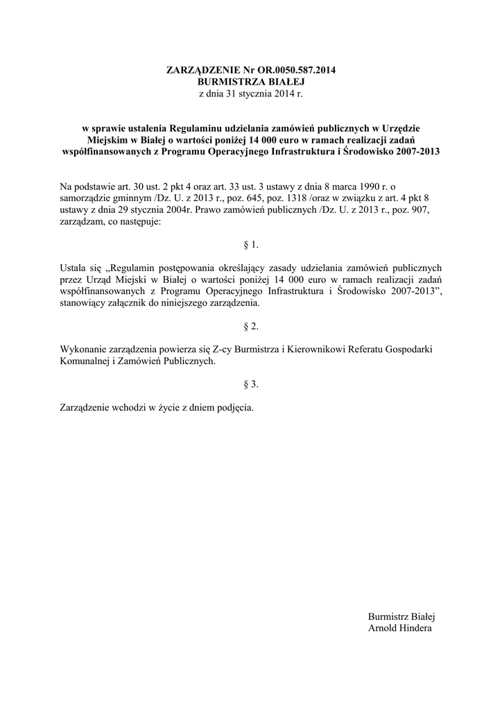 ZARZĄDZENIE Nr OR.0050.587.2014 BURMISTRZA BIAŁEJ z dnia 31 stycznia 2014 r. w sprawie ustalenia Regulaminu udzielania zamówień publicznych w Urzędzie Miejskim w Białej o wartości poniżej 14 000 euro w ramach realizacji zadań współfinansowanych z Programu Operacyjnego Infrastruktura i Środowisko 2007-2013 Na podstawie art. 30 ust. 2 pkt 4 oraz art. 33 ust. 3 ustawy z dnia 8 marca 1990 r. o samorządzie gminnym /Dz. U. z 2013 r., poz. 645, poz. 1318 /oraz w związku z art. 4 pkt 8 ustawy z dnia 29 stycznia 2004r. Prawo zamówień publicznych /Dz. U. z 2013 r., poz. 907, zarządzam, co następuje: § 1. Ustala się „Regulamin postępowania określający zasady udzielania zamówień publicznych przez Urząd Miejski w Białej o wartości poniżej 14 000 euro w ramach realizacji zadań współfinansowanych z Programu Operacyjnego Infrastruktura i Środowisko 2007-2013”, stanowiący załącznik do niniejszego zarządzenia. § 2. Wykonanie zarządzenia powierza się Z-cy Burmistrza i Kierownikowi Referatu Gospodarki Komunalnej i Zamówień Publicznych. § 3. Zarządzenie wchodzi w życie z dniem podjęcia. Burmistrz Białej Arnold Hindera Załącznik do Zarządzenia OR.0050.587.2014 Burmistrza Białej z dnia 31 stycznia 2014 r. Regulamin postępowania określający zasady udzielania zamówień publicznych przez Urząd Miejski w Białej o wartości poniżej 14 000 euro w ramach realizacji zadań współfinansowanych z Programu Operacyjnego Infrastruktura i Środowisko 2007-2013. §1 Postanowienia ogólne 1. Regulamin niniejszy określa procedury wyboru wykonawców i zawierania umów przez Gminę Biała w ramach realizacji zadań współfinansowanych z Programu Operacyjnego Infrastruktura Środowisko 2007-2013, dla których zgodnie z treścią art. 4 pkt. 8 ustawy z dnia 29 stycznia 2004 r. Prawo zamówień publicznych (Dz. U. z 2013 r., poz. 907 z późniejszymi zmianami) nie stosuje się Prawa zamówień publicznych, a których wartość szacunkowa nie przekracza 14.000,00 EURO. 2. Podstawą przeliczenia wartości zamówienia jest średni kursu złotego w stosunku do euro określany przez Prezesa Rady Ministrów w drodze rozporządzenia, o którym mowa w art.35 ust.3 ustawy z dnia 29.01.2004r. Prawo zamówień publicznych. 3. Do ustalania wartości przedmiotu zamówienia zastosowanie mają przepisy art. 32–35 ustawy z dnia 29.01.2004r. Prawo zamówień publicznych 4. Regulamin opracowano zgodnie z przepisami ustawy z dnia 29 stycznia 2004 r. Prawo zamówień publicznych (dalej zwaną ustawą pzp) oraz Wytycznymi w zakresie kwalifikowania wydatków w ramach Programu Operacyjnego Infrastruktura i Środowisko 2007-2013 (zwanych dalej Wytycznymi). 5. Każdorazowo stosowaną procedurę wyboru wykonawcy należy zweryfikować w oparciu o aktualną wersję Wytycznych. Wytyczne w aktualnej wersji stanowią informację uzupełniającą do niniejszego regulaminu. §2 Stosowany tryb wyboru wykonawców 1. Do wyboru wykonawców zadań współfinansowanych z PO IiŚ 2007-2013, które nie spełniają kryterium określone w art. 4 pkt. 8 ustawy Prawo zamówień publicznych, ma zastosowanie tryb uproszczony zgodnie z Wytycznymi. 2. W przypadku umów o wartości netto powyżej 2.000,00 PLN dokonuje się, o ile to możliwe, rozeznania rynku wskazującego, iż dana usługa zostanie wykonana po cenie nie wyższej od ceny rynkowej. 3. Jeżeli w danym przypadku rozeznanie rynku nie jest możliwe, należy wykazać okoliczności uzasadniające brak takiego rozeznania i udokumentować je w formie pisemnej. §3 Sposób prowadzenia rozeznania rynku 1. Rozeznanie rynku może być przeprowadzone w jeden z następujących sposobów: 1) zapytanie ofertowe skierowane do potencjalnych wykonawców lub zamieszczone na stronie internetowej Biuletynu Informacji Publicznej Urzędu Miejskiego w Białej, w zakładce przetargi: przetargi poniżej 14 000 euro, 2) porównanie ofert potencjalnych wykonawców zamieszczonych na stronach internetowych lub opublikowanych w inny sposób. 2. Dokumentami potwierdzającymi rozeznanie rynku mogą być w szczególności: 1) oferty lub informacje handlowe potencjalnych wykonawców, 2) pisma, wydruki listów elektronicznych lub stron internetowych zwierających oferty informacje handlowe lub cenniki (zwierające datę wydruku). 3. Notatki z rozmów telefonicznych z potencjalnymi wykonawcami nie mogą stanowić udokumentowania przeprowadzenia rozeznania rynku. 4. Do obowiązków kierownika komórki odpowiedzialnej za realizację zadania należy podjęcie działań zmierzających do wszczęcia i przeprowadzenia postępowania objętego niniejszym regulaminem. 5. Do obowiązków kierownika komórki w szczególności należy: 1) wskazanie przedmiotu rozeznania rynku, ze szczególnym określeniem zakresu i wymagań, jakim winien on odpowiadać oraz terminu realizacji, 2) wskazania pracownika merytorycznie odpowiedzialnego za prowadzenie rozeznania. 6. Do obowiązków pracownika w szczególności należy: 1) przygotowanie szczegółowego opisu przedmiotu zamówienia, 2) oszacowanie wartości zamówienia – w wypadku towarów i usług występujących powszechnie w obrocie – w oparciu o cenę oferowaną powszechnie przez uczestniczących w obrocie przedsiębiorców, w wypadku robót budowlanych oraz prac projektowych – w oparciu o kosztorys inwestorski lub wycenę planowanych kosztów prac projektowych, 3) merytoryczne prowadzenie postępowania – w tym w szczególności podejmowanie wszelkich czynności związanych z przygotowaniem i przeprowadzeniem postępowania zapewniających jawność, bezstronność i fachowość jego prowadzenia, 4) przedstawienie kierownikowi komórki propozycji wyboru najkorzystniejszej oferty. 5) sporządzenie notatki służbowej z przeprowadzonych w trakcie postępowania czynności. §4 Sposób prowadzenia zapytania ofertowego 1. Zapytanie ofertowe może być skierowane do potencjalnych wykonawców i/lub zamieszczone na stronie internetowej Urzędu Miejskieg