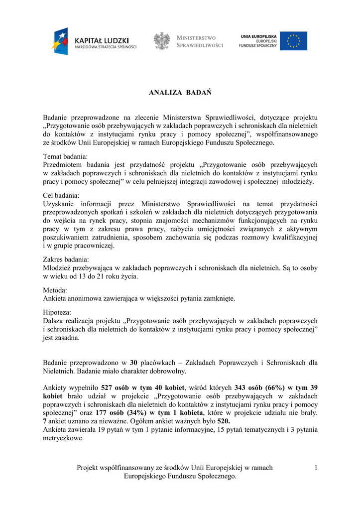 ANALIZA BADAŃ Badanie przeprowadzone na zlecenie Ministerstwa Sprawiedliwości, dotyczące projektu „Przygotowanie osób przebywających w zakładach poprawczych i schroniskach dla nieletnich do kontaktów z instytucjami rynku pracy i pomocy społecznej”, współfinansowanego ze środków Unii Europejskiej w ramach Europejskiego Funduszu Społecznego. Temat badania: Przedmiotem badania jest przydatność projektu „Przygotowanie osób przebywających w zakładach poprawczych i schroniskach dla nieletnich do kontaktów z instytucjami rynku pracy i pomocy społecznej” w celu pełniejszej integracji zawodowej i społecznej młodzieży. Cel badania: Uzyskanie informacji przez Ministerstwo Sprawiedliwości na temat przydatności przeprowadzonych spotkań i szkoleń w zakładach dla nieletnich dotyczących przygotowania do wejścia na rynek pracy, stopnia znajomości mechanizmów funkcjonujących na rynku pracy w tym z zakresu prawa pracy, nabycia umiejętności związanych z aktywnym poszukiwaniem zatrudnienia, sposobem zachowania się podczas rozmowy kwalifikacyjnej i w grupie pracowniczej. Zakres badania: Młodzież przebywająca w zakładach poprawczych i schroniskach dla nieletnich. Są to osoby w wieku od 13 do 21 roku życia. Metoda: Ankieta anonimowa zawierająca w większości pytania zamknięte. Hipoteza: Dalsza realizacja projektu „Przygotowanie osób przebywających w zakładach poprawczych i schroniskach dla nieletnich do kontaktów z instytucjami rynku pracy i pomocy społecznej” jest zasadna. Badanie przeprowadzono w 30 placówkach – Zakładach Poprawczych i Schroniskach dla Nieletnich. Badanie miało charakter dobrowolny. Ankiety wypełniło 527 osób w tym 40 kobiet, wśród których 343 osób (66%) w tym 39 kobiet brało udział w projekcie „Przygotowanie osób przebywających w zakładach poprawczych i schroniskach dla nieletnich do kontaktów z instytucjami rynku pracy i pomocy społecznej” oraz 177 osób (34%) w tym 1 kobieta, które w projekcie udziału nie brały. 7 ankiet uznano za nieważne. Ogółem ankiet ważnych było 520. Ankieta zawierała 19 pytań w tym 1 pytanie informacyjne, 15 pytań tematycznych i 3 pytania metryczkowe. Projekt współfinansowany ze środków Unii Europejskiej w ramach Europejskiego Funduszu Społecznego. 1 34% 66% brali udział nie brali udziału 1. Wykres dotyczący podziału osób na uczestniczących i nie uczestniczących w programie. Badanie było przeprowadzane głównie wśród osób uczestniczących w projekcie, jednak ze względu na upływ czasu od faktycznie przeprowadzonych spotkań-szkoleń, część nieletnich, zwłaszcza umieszczonych w schroniskach, była zwolniona z tych placówek. Dlatego podjęto decyzję o rozeznaniu potrzeby także w tej grupie nieletnich, którzy nie uczestniczyli w takich spotkaniach- szkoleniach. Osoby ankietowane to młodzież w wieku 13-21 lat, w następującym podziale: 13 lat- 1 osoba, 14 lat- 8 osób, 15 lat- 28 osób, 16 lat- 94 osoby, 17 lat- 133 osoby, 18 lat- 108 osób, 19 lat- 93 osoby, 20 lat- 49 osób, 21 lat- 6 osób. Wykształcenie ankietowanych: gimnazjalne i niższe- 446 osób, zasadnicze zawodowe- 66 osób, średnie ogólne- 2 osoby, średnie zawodowe- 6 osób. Poniżej przedstawiam analizę poszczególnych pytań, w dwóch grupach oraz wnioski wynikające z przeprowadzonych badań. Grupa I. Osoby biorące udział w programie. Analiza ankiet, w których na pytanie 1 brzmiące: „Czy byłeś/byłaś uczestnikiem spotkań-szkoleń w projekcie systemowym Ministerstwa Sprawiedliwości realizowanym w Priorytecie I POKL, współfinansowanym ze środków Unii Europejskiej w ramach Europejskiego Funduszu Społecznego „Przygotowanie osób przebywających w zakładach poprawczych i schroniskach dla nieletnich do kontaktów z instytucjami rynku pracy i pomocy społecznej”?, osoby udzieliły odpowiedzi – „tak”. Z ogólnej liczby 570 osób wypełniających ankiety, w pytaniu 1 odpowiedzi „tak”, czyli potwierdzających uczestnictwo w szkoleniu, udzieliło 343 osoby w tym 39 kobiet. Analiza odpowiedzi na pytanie 2: „Czy dowiedziałeś/dowiedziałaś się podczas spotkań-szkoleń w zakładzie/schronisku, jakie informacje powinna zawierać umowa o pracę?” Projekt współfinansowany ze środków Unii Europejskiej w ramach Europejskiego Funduszu Społecznego. 2 Możliwe odpowiedzi: tak, trochę, nie, chciałbym/chciałabym uzyskać więcej informacji na ten temat oraz dodaj swoje uwagi. Odpowiedzi tak trochę nie chciałbym/chciałabym uzyskać więcej informacji na ten temat dodaj swoje uwagi Ilość odpowiedzi udzielonych 264 66 4 35 W tym kobiet 16 - 31 7 3 W treści uwag przeważały informacje, że osoby dużo się dowiedziały ciekawych i przydatnych rzeczy, są zadowolone z tego typu zajęć oraz chciałyby więcej informacji i ćwiczeń. Treść części uwag zamieszczonych w odpowiedzi na pytanie sugeruje, że intencją niektórych ankietowanych były uwagi do całego programu. 72% tak trochę nie więcej 9% 1% 18% 1. Wykres dotyczący ilości odpowiedzi na pyt.2. Z analizy odpowiedzi udzielonych na pytanie 2 wynika, że 72% (264 k.31) osób biorących udział w spotkaniach-szkoleniach zdobyło wiedzę na temat informacji jakie powinna zawierać umowa o pracę, 18% (66 k.7) ankietowanych uważa, że trochę tej wiedzy posiada, zaś 9% (35 k.3) chciałoby uzyskać więcej informacji na ten temat. Analiza odpowiedzi na pytanie 3: „Czy dowiedziałeś/dowiedziałaś się podczas spotkań-szkoleń w zakładzie/schronisku, jak napisać swój życiorys zawodowy?” Możliwe odpowiedzi: tak, miałbym/miałabym pewne trudności w napisaniu życiorysu, nie, potrzebuję więcej informacji na ten temat oraz dodaj swoje uwagi. Odpowiedzi tak miałbym/miałabym pewne trudności w napisaniu życiorysu nie potrzebuję więcej informacji na ten temat dodaj swoje uwagi Ilość odpowiedzi udzielonych 262 65 W tym kobiet 15 17 7 1 - Projekt współfinansowany ze środków U