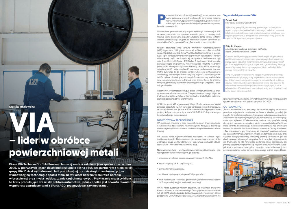 P roces obróbki wibrościernej (trowalizacji) to mechaniczne usuwanie zadziorów oraz ostrych krawędzi po procesie tłoczenia lub wykrawania. Części po obróbce są gładkie, pozbawione wymienionych wad i gotowe do kolejnych procesów – spawania, łączenia, zgrzewania itd. Odtłuszczanie przemysłowe przy użyciu technologii stosowanej w VIA zapewnia praktycznie bezodpadowe spawanie, przez co zlecający minimalizują koszty złomowania odpadów. „Oddaną partię towaru jesteśmy w stanie obrobić wciągu 24 godz., co jest bardzo ważnym czynnikiem dla naszych klientów” – zapewnia Cezary Brzozowski, prokurent spółki. Początki działalności firmy Verbund Innovativer Automobilzulieferer (VIA) sięgają roku 1996, gdy w Lennestadt w Niemczech (Nadrenia Północna-Westfalia) powstała firma VIA Oberflächtechnik GmbH, specjalizująca się w obróbce powierzchniowej: procesach odtłuszczania i obróbki wibrościernej części metalowych. Jej założycielami i udziałowcami były m.in. firmy: Kirchhoff, Gedia, HMT, Fischer & Kaufmann i Schürholz, dostarczające części dla przemysłu motoryzacyjnego. Ideą było stworzenie jednej spółki zdolnej obsłużyć wszystkie firmy założycielskie, zapewniając najwyższą jakość i dając możliwość znacznego zredukowania kosztów. Istotne było także to, że procesy obróbki wibro oraz odtłuszczania to ważne etapy, które bezpośrednio wpływają na jakość wykończonych detali. Początkowo do obsługi wymienionych firm wystarczały trzy linie bębnów rotowibracyjnych oraz jedna linia myjki przemysłowej. To znacznie mniej niż gdyby każdy z zakładów produkcyjnych kupił urządzenia i technologię dla siebie. Obecnie VIA w Niemczech obsługuje blisko 150 różnych klientów z branży automotive. Grupa zatrudnia ok. 250 pracowników, z czego 20 jest zatrudnionych w spółce w Polsce w Komornikach k. Środy Śląskiej na terenie Legnickiej Specjalnej Strefy Ekonomicznej. VIA Monika Bralewska – lider w obróbce powierzchniowej metali Firma VIA Technika Obróbki Powierzchniowej została założona jako spółka z o.o. w roku 2006. W pierwszych latach działalności skupiała się na obsłudze partnerów z niemieckiej grupy VIA. Dzięki wybudowaniu hali produkcyjnej oraz strategicznym inwestycjom w innowacyjną technologię spółka stała się w Polsce liderem w zakresie obróbki wibrościernej oraz mycia i odtłuszczania części metalowych. Praktycznie wszyscy klienci to firmy produkujące części dla sektora automotive, jednak spółka jest otwarta również na współpracę z producentami z branż AGD, przemysłowej czy medycznej. W 2015 r. grupa VIA wygenerowała blisko 12 mln euro obrotu. Wkład polskiego oddziału to 1,2 mln euro. Jego obrót stale rośnie i biznes rozwija się bardzo dynamicznie. Jeszcze w 2016 r. firmie udało się pozyskać nowe projekty, kolejne rozpoczną się w latach 2017–2018. Praktycznie wszystkie dotyczą branży motoryzacyjnej. NOWOCZESNA TECHNOLOGIA VIA dysponuje czterema w pełni zautomatyzowanymi liniami do obróbki wibrościernej, tzw. bębnami rotowibracyjnymi. Korzysta z technologii niemieckiej firmy Rösler – lidera w zakresie rozwiązań do obróbki wibrościernej. VIA posiada także najnowocześniejsze rozwiązania w zakresie mycia i odtłuszczania części. Dwie maszyny – pierwsza na bazie rozpuszczalnika wodnego, a druga węglowodorowego – zapewniają możliwość odtłuszczenia blisko 150 t części metalowych na dobę. Najnowsza inwestycja – węglowodorowa maszyna odtłuszczająca – jest rozwiązaniem bardzo innowacyjnym. Jej zalety to: Wypowiedzi partnerów VIA: Paweł Roś lider działu zakupów, Gedia Poland Wybraliśmy spółkę VIA jako dostawcę, ponieważ jest to firma, która w pełni profesjonalnie podchodzi do powierzonych zadań. Na podstawie kilkuletniego doświadczenia mogę śmiało stwierdzić, że współpraca przebiega bezproblemowo, a zaangażowanie pracowników firmy sprawia, że części do VIA wysyłamy z pełnym zaufaniem. Filip R. Kapela przedstawiciel handlowo-techniczny na Polskę, Rösler Oberflächentechnik GmbH Oceniam, że VIA pod względem jakości świadczonych usług w zakresie obróbki wibrościernej i odtłuszczania przemysłowego detali na potrzeby branży przede wszystkim motoryzacyjnej, lotniczej, zbrojeniowej i innych jest firmą wyjątkową. Obsługuję ją od początku i jestem dumny, że mogę wspierać jej rozwój, dostarczając najwyższej jakości technologii, która pomaga firmie wieść prym na rynku. Firmę VIA, oprócz nowatorskiej i na bieżąco aktualizowanej technologii, wyróżnia serce, czyli profesjonalny zespół doświadczonych menadżerów, bez których nawet najlepsza technologia nie zapewniłaby tak szybkiego rozwoju. Fachowość, odpowiednie podejście do klienta oraz gotowość do mierzenia się z ewentualnymi problemami technologicznymi, a także odpowiedzialność i świadomość swoich decyzji wróży temu zespołowi i całej firmie sukces na światową skalę. sprawia problemów. Logistyka wewnętrzna odbywa się z wykorzystaniem systemu zarządzania – VIA posiada certyfikat ISO 9001. OUTSOURCING „Branża automotive znana jest z tego, że kładzie szczególny nacisk na zapewnienie najwyższych standardów zarówno w obrębie produkcji, jak i w całej sferze okołoprodukcyjnej. Przekazanie zadań czy procesów do realizacji firmie zewnętrznej dla jednych jest koniecznością, dla innych pragmatycznym wyborem. W obu wypadkach celem, który przyświeca takiej decyzji, jest zapewnienie najwyższej jakości oraz redukcja kosztów. Firma, która korzysta z outsourcingu, może się skoncentrować nad swoim core business, bo to w nim tkwi wartość firmy – przekonuje Cezary Brzozowski. – Nie ma problemu, gdy decydujemy się powierzyć sprzątanie, ochronę czy catering firmom zewnętrznym. Więcej trudu trzeba sobie zadać przy wyborze obsługi podatkowej, finansowej, prawnej czy kadrowej. Jeśli