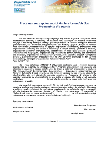 Praca na rzecz społeczności /In Service and Action Przewodnik dla ucznia Drogi Gimnazjalisto! Od lat młodzież naszej szkoły angażuje się mocno w prace i akcje na rzecz społeczności szkolnej i lokalnej. W każdym roku szkolnym to właśnie Uczniowie inicjują i realizują różnego rodzaju przedsięwzięcia. W latach ubiegłych zarówno gimnazjaliści jak i licealiści przygotowywali Dni Kultury Języka Obcego (w ramach nich wystawiali przedstawienia w języku angielskim, niemieckim, francuskim oraz organizowali konkursy dla dzieci i młodzieży z innych szkół), spektakl o Lwowie, organizowali koncerty charytatywne, uczestniczyli w akcji ‘góra grosza’, pomagali wałbrzyskiemu hospicjum, angażowali się w rozmaite formy pomocy dla schroniska dla zwierząt, organizowali kiermasze świąteczne, brali udział w akcjach ‘Sprzątanie Świata’, przygotowywali przedstawienia na Dni Otwarte promując w ten sposób swoją szkołę, pomagali w organizacji Konkursu ‘Disce Puer’ i ‘Disce Puer Junior’, itp. Od roku szkolnego 2013/2014 aktywność społeczna jest jeszcze bardziej promowana ze względu na Międzynarodowy Program Gimnazjalny jaki staramy się stopniowo wdrażać w naszej szkole. Jest to jeden z czterech programów w edukacji IBO (International Baccalaureate Organization – Organizacji Międzynarodowej Matury). Edukacja IB jest wyjątkowa nie tylko ze względu na jej wysokie standardy akademickie, ale też standardy rozwoju osobistego. Programy IB stanowią dla uczniów wyzwanie do doskonalenia się nie tylko w nauce, ale także w ich rozwoju osobistym i inspirują do uczenia się przez całe życie poprzez entuzjazm i empatię. My również pragniemy zachęcić Cię do jak najefektywniejszego rozwoju w aspekcie społecznym. Swoją postawą i zaangażowaniem pokaż, że obchodzi Cię nasze wspólne człowieczeństwo i że podzielasz przekonanie, że edukacja może przyczynić się do budowania lepszego świata. W Twoje ręce oddajemy ‘Przewodnik’ i ‘Dzienniczek prac na rzecz społeczności”, w którym będziesz mógł odnotować wykonywane zadania, a także dokonać refleksji. Życzymy powodzenia Koordynator Programu MYP: Beata Urbaniak Lider Service: Małgorzata Simm Maciej Jonek Strona 1 1. Co to jest „Praca na rzecz społeczności”? „Praca na rzecz społeczności” jest zaangażowaniem się w życie społeczne, którego jesteś uczestnikiem tj. w życie szkoły i w życie poza nią. Ma służyć uświadomieniu, że inni mają potrzeby, które warto dostrzegać, rozumieć je i w niektórych sytuacjach warto podjąć działania, by pomóc je im zaspokajać. W tym obszarze obowiązują dwie zasady: 1. oczekujesz zrozumienia, pomocy od innych, okaż im najpierw zrozumienie i pomoc; 2. wstyd za zło tzn. jeśli się do czegoś zobowiązałeś dotrzymaj słowa, jeśli tego nie wypełnisz – nie kręć, nie obwiniaj innych, lecz powiedz „tak, nie zrobiłem, to ja nie wywiązałem się z zadania”, a następnie napraw to. „Praca na rzecz społeczności” ma nauczyć Cię niesienia pomocy innym, empatii oraz ukształtować poczucie odpowiedzialności za grupę, w której funkcjonujesz. Kluczowe zagadnienia w tym obszarze? Jak żyć i budować relacje z innymi? Jakie jest moje miejsce i udział w życiu społeczności, w której żyję? W jaki sposób mogę pomóc innym? 2. Dlaczego „Praca na rzecz społeczności”? Podjęcie działań w tym obszarze jest wymagane przez IBO, by móc uzyskać certyfikat kształcenia w programie MYP. Zaangażowanie w „Pracę na rzecz społeczności” ma pomóc Ci rozwijać bardzo istotne cechy charakteru tj. komunikację, oddanie, otwartość na innych. W dzisiejszym świecie, w którym o sprawach trudnych najłatwiej rozmawiać ludziom przez telefon, Internet, kiedy to zdecydowanie częściej myślą o sobie i o swoich potrzebach, pobudzanie wychodzenia do ludzi, do spotkań „twarzą w twarz”, do podejmowania działań wymagających współpracy w istocie służy rozwojowi społecznemu jednostki i rozwojowi społeczności. Człowiek nieStrona rozwinie się w pełni, gdy jest pozbawiony 2 prawdziwych, głębokich więzi z innymi, kiedy nie potrafi ich budować. 3. Po co „Praca na rzecz społeczności” ? Podejmując się działań w tym obszarze chcemy, żebyś doskonalił w sobie: • świadomość swoich mocnych stron, • umiejętności organizacyjne, w tym planowanie, • współpracę z innymi, • umiejętności w zakresie komunikacji międzyludzkiej, • oraz inne specyficzne umiejętności, związane z charakterem działania, jakiego się podejmiesz. 4. Ile czasu musisz przeznaczyć na tę aktywność w semestrze? 10 godzin w semestrze. Twoje działanie odbywać się będzie poza godzinami lekcyjnymi. 5. Co możesz robić w ramach „Pracy na rzecz społeczności”? W ramach „Pracy na rzecz społeczności” możesz podjąć działania w obszarach: • Gimnazjalista szkole (np. włączyć się czynnie z własnym pomysłem działania w przygotowanie >Dnia języków obcych< w szkole, włączyć się w przygotowanie >Kiermaszu świątecznego< i ozdób choinkowych, włączyć się aktywnie w przygotowanie >Dnia na TAK<, włączyć się w przygotowanie >Dnia sportu< lub w ramach działań samorządu szkolnego przygotować ……, w przygotowanie >Dnia profilaktyki w szkole< itp.) Dzień otwarty szkoły - koordynator Bogusław Kuta, marzec /kwiecień. Góra grosza - koordynator Ryszard Barto. Pomoc w bibliotece – Koordynator Ryszard Barto , cały rok. Sprzątanie świata – koordynatorzy Maria Oberc Lazar i Alicja Kwiatkowska. Dzień języków obcych – koordynatorzyStrona Sylwia3 Piątkowska i Magdalena Ciempa. Pełna miska dla schroniska - koordynator Małgorzata Simm. Kiermasz świąteczny – koordynatorzy Małgorzata Simm i Monika Ziubrzycka, listopad/grudzień. Szkolna choinka (pomysł, projekt, wykonanie ozdób na szkolne choinki) – koordynatorzy Iwona Rudnicka, Marzena Laszkiewicz, 