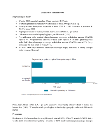 Urządzenia komputerowe Najważniejsze fakty: • W roku 2009 sprzedaż spadła o 5% do wartości R 29 mln. • Wartość sprzedaży notebooków w stosunku do roku 2008 podwoiła się. • Przeciętna cena komputera wynosiła w roku 2009 R 3 280 i wzrosła z poziomu R 3 249 w roku 2008. • Największy udział w rynku posiada Acer Africa i Dell S.A. (po 23%). • Liderem w urządzeniach peryferyjnych jest Microsoft (12%). • Przewidywana stała wartość skumulowanego rocznego wskaźnika wzrostu (CAGR) wynosi 5%. Prognozowana sprzedaż w roku 2014 wynosi R 15 mld a przewidywana stała ilość skumulowanego rocznego wskaźnika wzrostu (CAGR) wynosi 2% (przy sprzedaży 3,5 mln sztuk w roku 2014). • W roku 2009 ceny internetu szerokopasmowego uległy obniżeniu a limity dostępu podwyższone.(Seacom) Poza Acer Africa i Dell S.A. ( po 23% udziałów rynkowych) istotny udział w rynku ma Mecer S.A. (13%). W urządzeniach peryferyjnych dominującą pozycje zachowuje Microsoft (12%). Prognoza: Konkurencją dla Seacom będzie w najbliższych latach EASSy i WACS a także MWEB, który w roku 2010 przedstawił nową ofertę i otworzył w RPA możliwość nieograniczonego dostępu do szerokopasmowego internetu. Jakkolwiek oferta ta jest dostępna tylko dla linii ADSL, która nadal jest kosztowna i co sprawia, że internet pozostaje wciąż narzędziem dla zamożniejszych mieszkańców kraju. Żródło: Euromonitor International Kurs na dzień 25.11.2012 : 1 USD = 8,80 R Oprac.: WPHI Johannesburg