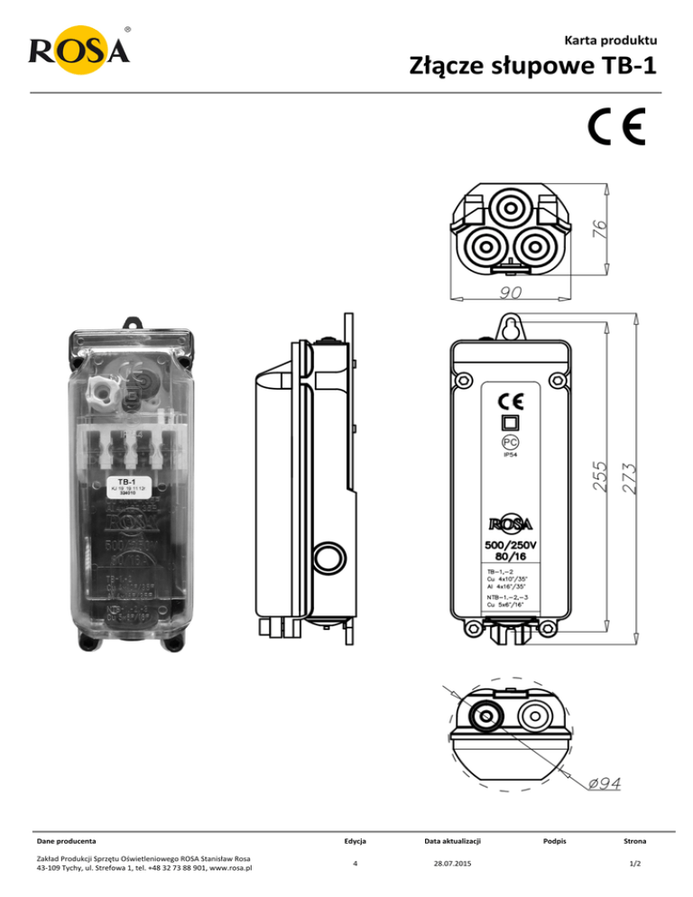 Karta produktu Złącze słupowe TB-1 Dane producenta Zakład Produkcji Sprzętu Oświetleniowego ROSA Stanisław Rosa 43-109 Tychy, ul. Strefowa 1, tel. +48 32 73 88 901, www.rosa.pl Edycja Data aktualizacji 4 28.07.2015 Podpis Strona 1/2 Karta produktu Złącze słupowe TB-1 Dane techniczne Typ złącza TB-1 Kod 324010 Ilość gniazd bezpiecznikowych 1 Klasa ochronności II Stopień ochrony IP54 Napięcie znamionowe izolacji [V] 500 Napięcie znamionowe udarowe wytrzymywane [kV] 6 Prąd znamionowy [A] 80 złącze czterotorowe, max. 3 kable przyłączeniowe o przekroju od 4x10 mm2 do 4x35 mm2 , przekrój przewodu oprawy max. 4 mm2 Zakres przekroju kabli i przewodów przyłączeniowych zintegrowana listwa zaciskowa—PBT (politereftalan butylenu—tworzywo o wysokich parametrach izolacyjnych i dużej wytrzymałości mechanicznej); pokrywa złącza oraz osłona zacisków i przewodów—przezroczysty poliwęglan; podstawa złącza—poliwęglan wzmocniony włóknem szklanym; otwory wyjść kablowych zabezpieczone uszczelkami Materiał Waga [kg] 0,71 Objętość jednostkowa [kg] 1,8 Dyrektywa niskonapięciowa LVD 2006/95/WE Norma PN-EN 61439-1:2011, PN-EN 61439-2:2011 Wkładka topikowa D01 Typ wkładki topikowej Kod Waga [kg] D01/E14 6A 322006 0,01 D01/E14 10A 322010 0,01 D01/E14 16A 322016 0,01 Dane producenta Zakład Produkcji Sprzętu Oświetleniowego ROSA Stanisław Rosa 43-109 Tychy, ul. Strefowa 1, tel. +48 32 73 88 901, www.rosa.pl Edycja Data aktualizacji 4 28.07.2015 Podpis Strona 2/2