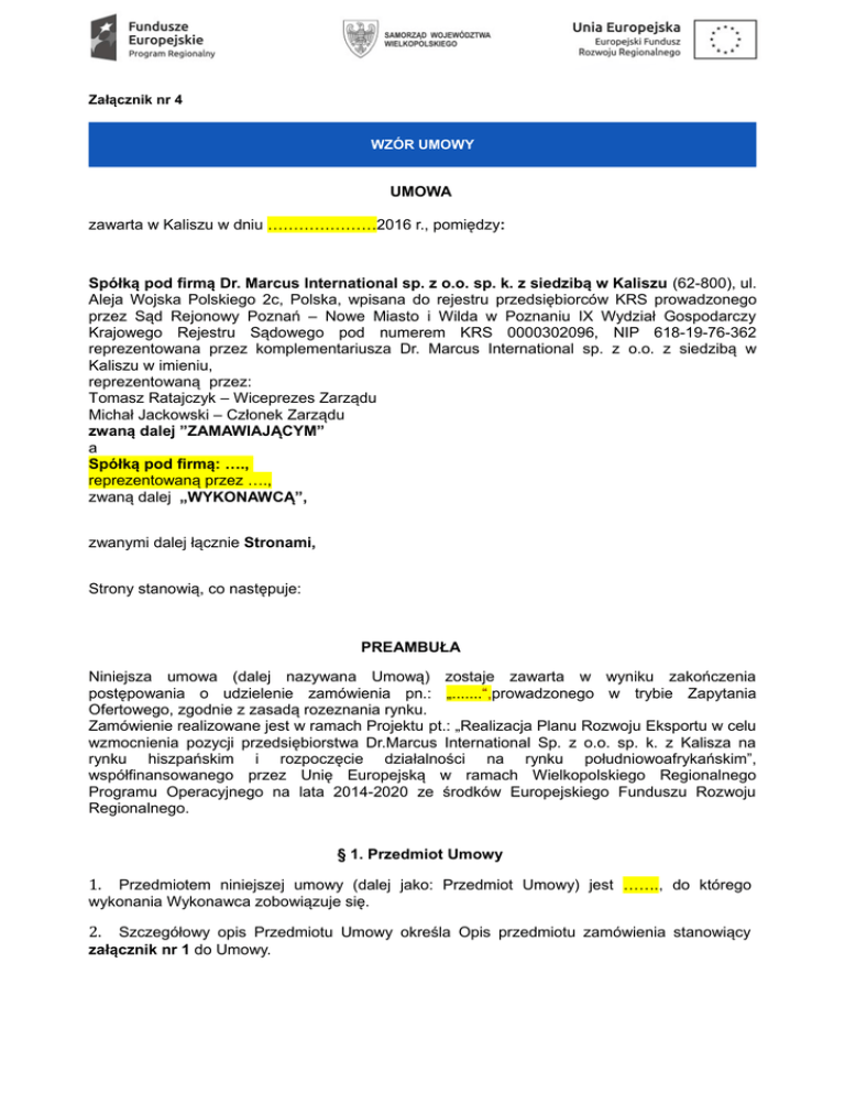 Załącznik nr 4 WZÓR UMOWY UMOWA zawarta w Kaliszu w dniu …………………2016 r., pomiędzy: Spółką pod firmą Dr. Marcus International sp. z o.o. sp. k. z siedzibą w Kaliszu (62-800), ul. Aleja Wojska Polskiego 2c, Polska, wpisana do rejestru przedsiębiorców KRS prowadzonego przez Sąd Rejonowy Poznań – Nowe Miasto i Wilda w Poznaniu IX Wydział Gospodarczy Krajowego Rejestru Sądowego pod numerem KRS 0000302096, NIP 618-19-76-362 reprezentowana przez komplementariusza Dr. Marcus International sp. z o.o. z siedzibą w Kaliszu w imieniu, reprezentowaną przez: Tomasz Ratajczyk – Wiceprezes Zarządu Michał Jackowski – Członek Zarządu zwaną dalej ”ZAMAWIAJĄCYM” a Spółką pod firmą: …., reprezentowaną przez …., zwaną dalej „WYKONAWCĄ”, zwanymi dalej łącznie Stronami, Strony stanowią, co następuje: PREAMBUŁA Niniejsza umowa (dalej nazywana Umową) zostaje zawarta w wyniku zakończenia postępowania o udzielenie zamówienia pn.: „.......“,prowadzonego w trybie Zapytania Ofertowego, zgodnie z zasadą rozeznania rynku. Zamówienie realizowane jest w ramach Projektu pt.: „Realizacja Planu Rozwoju Eksportu w celu wzmocnienia pozycji przedsiębiorstwa Dr.Marcus International Sp. z o.o. sp. k. z Kalisza na rynku hiszpańskim i rozpoczęcie działalności na rynku południowoafrykańskim”, współfinansowanego przez Unię Europejską w ramach Wielkopolskiego Regionalnego Programu Operacyjnego na lata 2014-2020 ze środków Europejskiego Funduszu Rozwoju Regionalnego. § 1. Przedmiot Umowy 1. Przedmiotem niniejszej umowy (dalej jako: Przedmiot Umowy) jest ……., do którego wykonania Wykonawca zobowiązuje się. 2. Szczegółowy opis Przedmiotu Umowy określa Opis przedmiotu zamówienia stanowiący załącznik nr 1 do Umowy. § 2. Termin realizacji 1. Wykonawca zobowiązany jest wykonać wszystkie czynności składające się na Przedmiot Umowy w terminie ……. 2. Termin, o którym mowa w ust. 1 powyżej, uważany będzie za dochowany przez Wykonawcę w przypadku, gdy przed jego upływem nastąpi protokolarny bezusterkowy odbiór końcowy prac będących Przedmiotem Umowy. 3. Prawidłowe wykonanie prac składających się na Przedmiot Umowy, w terminie, o którym mowa w ust. 1, zostanie potwierdzone Protokołem odbioru, podpisanym bez zastrzeżeń przez Strony Umowy. 4. Wykonawca może wystąpić pisemnie o zmianę terminu, o którym mowa w ust. 1 powyżej, a Zamawiający zaakceptuje taką zmianę wyłącznie w przypadku wystąpienia siły wyższej lub warunków uniemożliwiających wykonanie Przedmiotu Umowy zgodnie z obowiązującymi przepisami prawa, zasadami wiedzy technicznej, a w szczególności zgodnie z wymaganymi normami technologicznymi. 5. Wykonawca jest zobowiązany do niezwłocznego, pisemnego informowania Zamawiającego o wszystkich okolicznościach mogących mieć wpływ na prawidłową i terminową realizację Przedmiotu Umowy, nie później niż w terminie 4 dni po dniu zaistnienia danej okoliczności. § 3. Oświadczenia Stron 1. 2. 3. 4. 5. 6. Wykonawca zobowiązuje się wykonać Przedmiot Umowy z należytą starannością, zgodnie z obowiązującymi przepisami prawa, normami i zasadami wiedzy. Wykonawca zobowiązuje się, że Przedmiot Umowy zawierać będzie wszystkie elementy konieczne z punktu widzenia celu, któremu ma służyć. Wykonawca zobowiązuje się wykonywać niniejszą Umowę mając na uwadze dobro Zamawiającego z zachowaniem należytej staranności określonej w art. 355 § 2 Kodeksu cywilnego, z uwzględnieniem zawodowego i profesjonalnego charakteru prowadzonej przez Wykonawcę działalności. Wykonawca oświadcza, że posiada wiedzę, doświadczenie, wymagane uprawnienia oraz potencjał techniczny, ekonomiczny, organizacyjny, kadrowy, który jest niezbędny do prawidłowego wykonania Przedmiotu Umowy, zapewniając tym samym prawidłowe wykonanie Przedmiotu Umowy na rzecz Zamawiającego, jak i że nie ma konfliktu interesów między Zamawiającym a innym klientem Wykonawcy. Wykonawca zobowiązuje się do zapewnienia przestrzegania bezpieczeństwa i higieny pracy oraz ochrony zdrowia podczas realizacji Przedmiotu Umowy. Wykonawca zobowiązuje się zapewnić swojemu personelowi warunki pracy odpowiadające wymaganiom właściwych przepisów prawa oraz wyposażyć swój personel w narzędzia i maszyny niezbędne do realizacji Przedmiotu Umowy. Zamawiający zobowiązuje się do udzielania Wykonawcy wszelkich informacji niezbędnych do należytego przeprowadzenia w/w działań. § 4. Wynagrodzenie Za należyte i terminowe wykonanie wszystkich prac składających się na Przedmiot Umowy Wykonawca otrzyma wynagrodzenie w wysokości ……. (słownie: ……. 00/100) złotych netto, powiększone o należny podatek od towarów i usług w wysokości określonej obowiązującymi przepisami, zwane dalej Wynagrodzeniem Umownym. 2. Rozliczenie należności dla Wykonawcy nastąpi na podstawie faktury VAT, wystawionej przez Wykonawcę na podstawie Protokołu odbioru podpisanego przez Strony Umowy bez zastrzeżeń. 1. 3. 4. 5. 6. 7. 8. 9. Należność wynikająca z faktury VAT, o której mowa powyżej, płatna będzie w terminie ……… (słownie: ………) dni od daty wykonania Przedmiotu Umowy, na podstawie prawidłowo wystawionej faktury VAT, przelewem na rachunek bankowy Wykonawcy wskazany na fakturze VAT. Za chwilę zapłaty Wynagrodzenia Umownego Strony uznają datę obciążenia rachunku Zamawiającego. Faktura VAT wystawiona nieprawidłowo, przedwcześnie, bezpodstawnie lub bez Protokołu odbioru podpisanego przez Zamawiającego, nie rodzi obowiązku zapłaty. Zmiana obowiązującej stawki podatku od towarów i usług skutkować będzie odpowiednią zmianą wartości brutto Wynagrodzenia Umownego. Zamawiający oświadcza, że jest czynnym podatnikiem podatku VAT i posiada Numer Identyfikacji Podatkowej (NIP) ……. Wykonawca oświadcza, że jest czynnym podatnikiem podatku VAT i posiada Numer Identyfikacji P