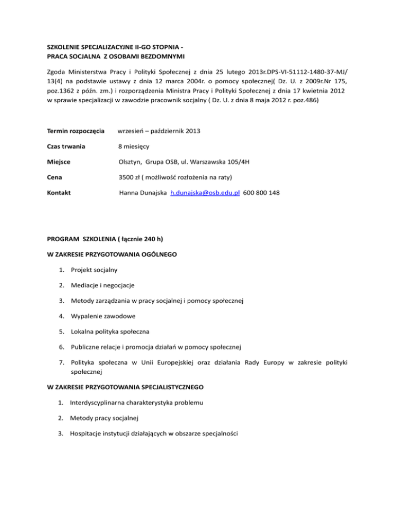 SZKOLENIE SPECJALIZACYJNE II-GO STOPNIA PRACA SOCJALNA Z OSOBAMI BEZDOMNYMI Zgoda Ministerstwa Pracy i Polityki Społecznej z dnia 25 lutego 2013r.DPS-VI-51112-1480-37-MJ/ 13(4) na podstawie ustawy z dnia 12 marca 2004r. o pomocy społecznej( Dz. U. z 2009r.Nr 175, poz.1362 z późn. zm.) i rozporządzenia Ministra Pracy i Polityki Społecznej z dnia 17 kwietnia 2012 w sprawie specjalizacji w zawodzie pracownik socjalny ( Dz. U. z dnia 8 maja 2012 r. poz.486) Termin rozpoczęcia wrzesień – październik 2013 Czas trwania 8 miesięcy Miejsce Olsztyn, Grupa OSB, ul. Warszawska 105/4H Cena 3500 zł ( możliwość rozłożenia na raty) Kontakt Hanna Dunajska [email protected] 600 800 148 PROGRAM SZKOLENIA ( łącznie 240 h) W ZAKRESIE PRZYGOTOWANIA OGÓLNEGO 1. Projekt socjalny 2. Mediacje i negocjacje 3. Metody zarządzania w pracy socjalnej i pomocy społecznej 4. Wypalenie zawodowe 5. Lokalna polityka społeczna 6. Publiczne relacje i promocja działań w pomocy społecznej 7. Polityka społeczna w Unii Europejskiej oraz działania Rady Europy w zakresie polityki społecznej W ZAKRESIE PRZYGOTOWANIA SPECJALISTYCZNEGO 1. Interdyscyplinarna charakterystyka problemu 2. Metody pracy socjalnej 3. Hospitacje instytucji działających w obszarze specjalności