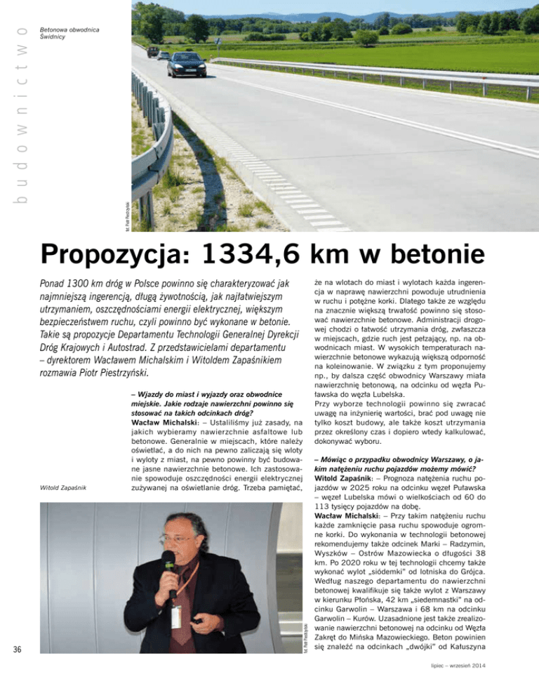fot. Piotr Piestrzyński b u d o w n i c t w o Betonowa obwodnica Świdnicy Propozycja: 1334,6 km w betonie Ponad 1300 km dróg w Polsce powinno się charakteryzować jak najmniejszą ingerencją, długą żywotnością, jak najłatwiejszym utrzymaniem, oszczędnościami energii elektrycznej, większym bezpieczeństwem ruchu, czyli powinno być wykonane w betonie. Takie są propozycje Departamentu Technologii Generalnej Dyrekcji Dróg Krajowych i Autostrad. Z przedstawicielami departamentu – dyrektorem Wacławem Michalskim i Witoldem Zapaśnikiem rozmawia Piotr Piestrzyński. 36 – Wjazdy do miast i wyjazdy oraz obwodnice miejskie. Jakie rodzaje nawierzchni powinno się stosować na takich odcinkach dróg? Wacław Michalski: – Ustaliliśmy już zasady, na jakich wybieramy nawierzchnie asfaltowe lub betonowe. Generalnie w miejscach, które należy oświetlać, a do nich na pewno zaliczają się wloty i wyloty z miast, na pewno powinny być budowane jasne nawierzchnie betonowe. Ich zastosowanie spowoduje oszczędności energii elektrycznej zużywanej na oświetlanie dróg. Trzeba pamiętać, fot. Piotr Piestrzyński Witold Zapaśnik że na wlotach do miast i wylotach każda ingerencja w naprawę nawierzchni powoduje utrudnienia w ruchu i potężne korki. Dlatego także ze względu na znacznie większą trwałość powinno się stosować nawierzchnie betonowe. Administracji drogowej chodzi o łatwość utrzymania dróg, zwłaszcza w miejscach, gdzie ruch jest pełzający, np. na obwodnicach miast. W wysokich temperaturach nawierzchnie betonowe wykazują większą odporność na koleinowanie. W związku z tym proponujemy np., by dalsza część obwodnicy Warszawy miała nawierzchnię betonową, na odcinku od węzła Puławska do węzła Lubelska. Przy wyborze technologii powinno się zwracać uwagę na inżynierię wartości, brać pod uwagę nie tylko koszt budowy, ale także koszt utrzymania przez określony czas i dopiero wtedy kalkulować, dokonywać wyboru. – Mówiąc o przypadku obwodnicy Warszawy, o jakim natężeniu ruchu pojazdów możemy mówić? Witold Zapaśnik: – Prognoza natężenia ruchu pojazdów w 2025 roku na odcinku węzeł Puławska – węzeł Lubelska mówi o wielkościach od 60 do 113 tysięcy pojazdów na dobę. Wacław Michalski: – Przy takim natężeniu ruchu każde zamknięcie pasa ruchu spowoduje ogromne korki. Do wykonania w technologii betonowej rekomendujemy także odcinek Marki – Radzymin, Wyszków – Ostrów Mazowiecka o długości 38 km. Po 2020 roku w tej technologii chcemy także wykonać wylot „siódemki” od lotniska do Grójca. Według naszego departamentu do nawierzchni betonowej kwalifikuje się także wylot z Warszawy w kierunku Płońska, 42 km „siedemnastki” na odcinku Garwolin – Warszawa i 68 km na odcinku Garwolin – Kurów. Uzasadnione jest także zrealizowanie nawierzchni betonowej na odcinku od Węzła Zakręt do Mińska Mazowieckiego. Beton powinien się znaleźć na odcinkach „dwójki” od Kałuszyna lipiec – wrzesień 2014 – Czyli wszystkie argumenty przemawiają za tym, by były to drogi o nawierzchni betonowej? Wacław Michalski: – Tak. Jeszcze Gdańsk – Elbląg i Kraków – Słomniki. Przesądzona jest już budowa nawierzchni betonowej na odcinku autostrady A1 Piotrków – Częstochowa – Pyrzowice. Na północy proponujemy drogę S6 – Słupsk – Koszalin – Goleniów – Wejherowo – o długości 277 km. W województwie kujawsko-pomorskim to połączenie Bydgoszczy z autostradą w Nowych Marzach oraz 53-kilometrowe połączenie Torunia z Bydgoszczą. W dalszej perspektywie proponujemy betonowy odcinek Bydgoszcz – Piła o długości 90 km. Wreszcie zachodnia obwodnica Łodzi, czyli odcinek Łódź – Pabianice – Zgierz. W sumie określiliśmy długość odcinków, na których powinno być jak najmniej ingerencji na 1334,6 km. Drogi te powinny się charakteryzować długą żywotnością, jak najłatwiejszym utrzymaniem, oszczędnościami energii, większym bezpieczeństwem ruchu, czyli powinny być wykonane w betonie. Nasz departament proponuje także rozjaśnianie nawierzchni bitumicznych na obiektach mostowych w ciągach dróg o nawierzchni betonowej. Teraz, jadąc drogą betonową, widzimy szachownicę: jasny ciąg nawierzchni betonowej, ciemna nawierzchnia bitumiczna na obiektach mostowych i znowu jasny ciąg nawierzchni betonowej. Zmiany barwy nawierzchni bitumicznej chcemy dokonać poprzez zastosowanie kruszyw rozjaśniających nawierzchnię. Nawierzchnia betonowa jest także uzasadniona na tych odcinkach dróg, na których jest duży udział ruchu samochodów ciężarowych. Trzeba pamiętać, że destrukcja dróg rozpoczyna się od pasów zewnętrznych – prawych, tych z ruchem pełzającym, gdzie występują duże obciążenia na oś. fot. Piotr Piestrzyński do Siedlec i od Siedlec do Terespola. Nie będzie to autostrada, ale droga ekspresowa. – Panowie, macie propozycje, które chcielibyście wprowadzić w Polsce. A jak z problemem wlotów czy wylotów z miast oraz obwodnic radzą sobie inne kraje? Wacław Michalski: – Każdy kraj ma na to swój sposób. Nawet w USA są stany, w których nawierzchnie betonowe stanowią 98% dróg, np. w Nebrasce, a w innych zaledwie kilka procent. Witold Zapaśnik: – W ubiegłym miesiącu gościła u nas delegacja z Łotwy. Przyjechali, by nauczyć się od nas wykonawstwa nawierzchni betonowych. Spytaliśmy, dlaczego, gdyż my jeszcze uczymy się tej technologii. Odpowiedzieli, że jesteśmy najbliższym sąsiadem, u którego budowa tych dróg jest zaawansowana. Zawieźliśmy ich na odcinek S8 Rzgów – Róża. Pokazaliśmy im także technologię whitetopping na odcinku Wolbórz – Polichno. Jeżeli chodzi o technologię betonową, to mamy już około 700 km dróg krajowych i autostrad. Dlaczego warto budować drogi o nawierzchniach betonowych? nawierzchnie betonowe: 1.większa trwałość (Wydłużony okres pomiędzy remontami) jest przec