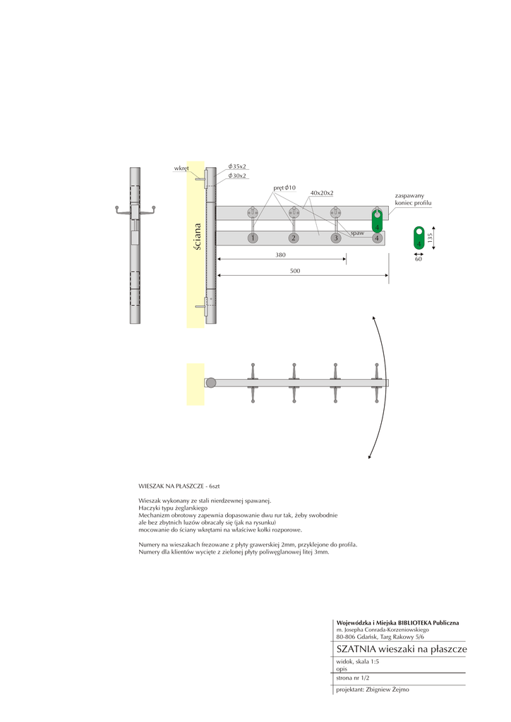 35x2 wkrêt 30x2 2 1 40x20x2 zaspawany koniec profilu 3 spaw 4 4 380 4 135 œciana prêt 10 60 500 WIESZAK NA P£ASZCZE - 6szt Wieszak wykonany ze stali nierdzewnej spawanej. Haczyki typu ¿eglarskiego Mechanizm obrotowy zapewnia dopasowanie dwu rur tak, ¿eby swobodnie ale bez zbytnich luzów obraca³y siê (jak na rysunku) mocowanie do œciany wkrêtami na w³aœciwe ko³ki rozporowe. Numery na wieszakach frezowane z p³yty grawerskiej 2mm, przyklejone do profila. Numery dla klientów wyciête z zielonej p³yty poliwêglanowej litej 3mm. Wojewódzka i Miejska BIBLIOTEKA Publiczna m. Josepha Conrada-Korzeniowskiego 80-806 Gdañsk, Targ Rakowy 5/6 SZATNIA wieszaki na p³aszcze widok, skala 1:5 opis strona nr 1/2 projektant: Zbigniew ¯ejmo 800mm 800mm 80mm Gablota wykonana z profili aluminiowych anodowanych. Wype³nienie drzwiczek ze szk³a bezpiecznego. Zamykana na klucz. Pojemnoœæ 50 kluczy. Monta¿ do œciany na ko³ki rozporowe i wkrêty Wojewódzka i Miejska BIBLIOTEKA Publiczna m. Josepha Conrada-Korzeniowskiego 80-806 Gdañsk, Targ Rakowy 5/6 SZATNIA gablota na klucze widok, skala 1:5 opis strona nr 2/2 projektant: Zbigniew ¯ejmo
