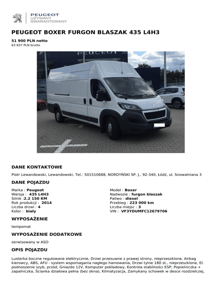 PEUGEOT BOXER FURGON BLASZAK 435 L4H3 51 900 PLN netto 63 837 PLN brutto DANE KONTAKTOWE Piotr Lewandowski, Lewandowski, Tel.: 501510688, NORDYŃSKI SP. J., 92-340, Łódź, ul. Snowalniana 3 DANE POJAZDU Marka : Peugeot Wersja : 435 L4H3 Silnik :2.2 150 KM Rok produkcji : 2014 Liczba drzwi : 4 Kolor : biały Model : Boxer Nadwozie : furgon blaszak Paliwo : diesel Przebieg : 223 000 km Liczba miejsc : 3 VIN : VF3YDUMFC12679706 WYPOSAŻENIE tempomat WYPOSAŻENIE DODATKOWE serwisowany w ASO OPIS POJAZDU Lusterka boczne regulowane elektrycznie, Drzwi przesuwne z prawej strony, nieprzeszklone, Airbag kierowcy, ABS, AFU - system wspomagania nagłego hamowania, Drzwi tylne 180 st., nieprzeszklone, El. podnoszenie szyb, przód, Gniazdo 12V, Komputer pokładowy, Kontrola stabilności ESP, Popielniczka + zapalniczka, Ścianka działowa pełna (bez okna), Klimatyzacja, Zamykany schowek w desce rozdzielczej, Zamek centralny, Wspomaganie układu kierowniczego, Szyby barwione, Siedzenie pasażera dwumiejscowe, Siedz. kier. z mech. regulacją wysokości, WIP Bluetooth, Tempomat, Wyłożenie podłogi, Zbiornik paliwa 125L, Światła do jazdy dziennej LED + światła obrysowe Pierwszy właściciel, Kupiony w ASO w Polsce, Pojazd regularnie serwisowany QR CODE DLA OGŁOSZENIA W SERWISIE UZYWANYGWARANTOWANY.PL Powered by TCPDF (www.tcpdf.org)