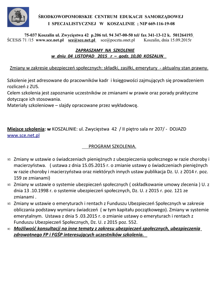 ŚRODKOWOPOMORSKIE CENTRUM EDUKACJI SAMORZĄDOWEJ I SPECJALISTYCZNEJ W KOSZALINIE ; NIP 669-116-19-08 75-037 Koszalin ul. Zwycięstwa 42 p.206 tel. 94 347-00-50 tel/ fax 341-13-12 k. 501264193 ŚCESiS 71 /15 www.sce.net.pl [email protected] [email protected] Koszalin, dnia 15.09.2015r ZAPRASZAMY NA SZKOLENIE w dniu 04 LISTOPAD 2015 r – godz. 10,00 KOSZALIN Zmiany w zakresie ubezpieczeń społecznych: składki, zasiłki, emerytury - aktualny stan prawny. Szkolenie jest adresowane do pracowników kadr i księgowości zajmujących się prowadzeniem rozliczeń z ZUS. Celem szkolenia jest zapoznanie uczestników ze zmianami w prawie oraz porady praktyczne dotyczące ich stosowania. Materiały szkoleniowe – slajdy opracowane przez wykładowcę. Miejsce szkolenia: w KOSZALINIE: ul. Zwycięstwa 42 / II piętro sala nr 207/ - DOJAZD www.sce.net.pl PROGRAM SZKOLENIA. • Zmiany w ustawie o świadczeniach pieniężnych z ubezpieczenia społecznego w razie choroby i macierzyństwa. ( ustawa z dnia 15.05.2015 r. o zmianie ustawy o świadczeniach pieniężnych w razie choroby i macierzyństwa oraz niektórych innych ustaw publikacja Dz. U. z 2014 r. poz. 159 ze zmianami) • Zmiany w ustawie o systemie ubezpieczeń społecznych ( oskładkowanie umowy zlecenia ) U. z dnia 13 .10.1998 r. o systemie ubezpieczeń społecznych, Dz. U. z 2015 r. poz. 121 ze zmianami . • Zmiany w ustawie o emeryturach i rentach z Funduszu Ubezpieczeń Społecznych w zakresie obliczania podstawy wymiaru świadczeń ( w tym kapitału początkowego). Zmiany w systemie emerytalnym. Ustawa z dnia 5 .03.2015 r. o zmianie ustawy o emeryturach i rentach z Funduszu Ubezpieczeń Społecznych, Dz. U. z 2015 poz. 552. • Możliwość konsultacji na inne tematy z zakresu ubezpieczeń społecznych, ubezpieczenia zdrowotnego FP i FGŚP interesujących uczestników szkolenia. Uczestnicy otrzymują zaświadczenie o ukończeniu szkolenia. Odpłatność : 300,00 zł od osoby - płatne przelewem 7 DNI od otrzymania rachunku . W cenie zapewniamy: serwis kawowy oraz materiały szkoleniowe. Zgłoszenie na szkolenie prosimy wypełnić i przesłać do Centrum listownie /adres w nagłówku pisma/ lub faxem /tel/fax 94-341-13-12. - płatne przelewem po otrzymaniu rachunku . Zgłaszając uczestnictwo faxem prosimy o potwierdzenie telefoniczne. W przypadku nie zebrania odpowiedniej ilości osób organizator zastrzega sobie prawo odwołania szkolenia lub zmiany terminu. DYREKTOR Andrzej Urbanek Z G Ł O S Z E N I E – „ UBEZPIECZENIA SPOŁECZNE ” - -w dniu 04.11.2015 r –g.10.00 KOSZALIN KARTA ZGŁOSZENIOWA- DANE DO WYSTAWIENIA FAKTURY /NAZWA,ADRES ,NIP/ ................................................................................................................................................. NIP ...................................................... TEL. ................................................ 1. ......................................................................................... .................................................. /imię i nazwisko/ /stanowisko/ 2. ............................................................................................................................................... • /wpisać pismem drukowanym / Należność w wysokości ............... złotych za szkolenie przekażemy gotówką/przelewem/ na konto: PKO BP SA 26 1020 2791 0000 7802 0233 7533. Przyjmujemy do wiadomości, że nie zgłoszenie rezygnacji ze szkolenia na 4 dni robocze przed terminem spowoduje obciążenie zgłaszającego kosztami szkolenia. Zgadzamy się na przetwarzanie danych osobowych zawartych w zgłoszeniu do czynnosci związanych z realizacją szkolenia. ........................................... /podpis i pieczątka /