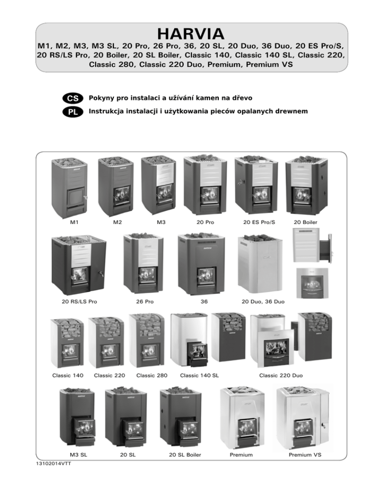 HARVIA M1, M2, M3, M3 SL, 20 Pro, 26 Pro, 36, 20 SL, 20 Duo, 36 Duo, 20 ES Pro/S, 20 RS/LS Pro, 20 Boiler, 20 SL Boiler, Classic 140, Classic 140 SL, Classic 220, Classic 280, Classic 220 Duo, Premium, Premium VS Pokyny pro instalaci a užívání kamen na dřevo Instrukcja instalacji i użytkowania pieców opalanych drewnem M1 M2 20 RS/LS Pro Classic 140 M3 SL 13102014VTT M3 26 Pro Classic 220 20 SL Classic 280 20 Pro 36 20 ES Pro/S 20 Duo, 36 Duo Classic 140 SL 20 SL Boiler 20 Boiler Classic 220 Duo Premium Premium VS Společnost Harvia vyrábí kvalitní kamna, kotle a komíny už po mnoho desítek let a využívá k tomu veškeré zkušenosti, které v průběhu této doby získala. Náš sortiment nabízí široký výběr, a to jak kamen do malých rodinných saun, tak i do velkých saun pro veřejnost. Blahopřejeme, vybrali jste si opravdu dobře! Firma Harvia Oy produkuje piece, kotły, kominy od dziesięcioleci. Tak długi okres sprawił, że posiada potężne doświadczenie w produkcji tego typu wyrobów. W ofercie firma posiada bardzo bogaty wachlarz wyrobów. Znajdziecie w niej piece zarówno do małych saun rodzinnych jak i dużych obiektów publicznych. Gratulujemy znakomitego wyboru! OBSAH SPIS TREŚCI 1. OBECNĚ.....................................................................5 1.1. Součásti kamen.............................................................. 5 1. OGÓLNIE...................................................................5 1.1. Części pieca.................................................................... 5 2. NÁVOD K POUŽITÍ......................................................6 2.1. Upozornění..................................................................... 6 2.2. Příprava kamen............................................................... 6 2.3. Palivo.............................................................................. 7 2.4. Saunové kameny............................................................ 7 2.5. Topení v kamnech........................................................... 8 2.6. Saunová voda................................................................. 9 2.7. Údržba............................................................................ 9 2.8. Odstraňování závad........................................................ 9 2. EKSPLOATACJA PiecA.................................................6 2.1. Ostrzeżenia..................................................................... 6 2.2. Przygotowanie pieca do użytkowania............................. 6 2.3. Materiał opałowy............................................................ 7 2.4. Kamienie do pieca do sauny........................................... 7 2.5. Ogrzewanie sauny piecem.............................................. 8 2.6. Woda w saunie................................................................ 9 2.7. Konserwacja.................................................................... 9 2.8. Rozwiązywanie problemów............................................. 9 3. NÁVOD K INSTALACI................................................. 11 3.1. Než začne,te................................................................. 11 3.1.1. Větrání potírny..................................................... 11 3.1.2. Ochrana podlahy................................................. 12 3.1.3. Bezpečné vzdálenosti.......................................... 12 3.2. Instalace kamen........................................................... 14 3.2.1. Nastavitelné nohy (Neobsahují modely M1/M2/M3/ M3 SL)........................................................................... 14 3.2.2. Připojení kamen k zděři ...................................... 14 3.2.3. Připojení kamen ke komínu Harvia...................... 16 3.3. Změna směru otvírání dvířek od kamen....................... 17 3.4. Příslušenství.................................................................. 18 3. INSTRUKCJA INSTALACJI............................................ 11 3.1. Czynności wstępne....................................................... 11 3.1.1. Wentylacja kabiny sauny..................................... 11 3.1.2. Ochrona podłogi.................................................. 12 3.1.3. Odległości bezpieczeństwa.................................. 12 3.2. Instalacja pieca............................................................. 14 3.2.1. Regulowane nóżki (wyłączając modele M1/M2/M3/ M3SL)............................................................................ 14 3.2.2. Podłączenie pieca do komina............................... 14 3.2.3. Podłączenie pieca do kanału dymowego Harvia.. 16 3.3. Zmiana kierunku otwierania drzwiczek......................... 17 3.4. Akcesoria...................................................................... 18 Tyto pokyny k instalaci se týkají kamen se značkou CE. Pokud vaše kamna označení CE na výrobním štítku nemají, otevřete si prosím pokyny pro instalaci zde: Jeżeli Twój piec nie posiada znaku CE na tabliczce znamionowej, proszę otwórz instrukcję instalacji tutaj: ▸▸ M1, M3, 20 Pro, 20 ES Pro/S, 20 Boiler 26 Pro, 36, 50 ▸▸ Classic 140, Classic 220, Classic 280 ▸▸ Classic 140 SL, Classic 220 Duo ▸▸ M3 SL, 20 SL, 20 SL Boiler, 50 SL, 20 Duo, 36 Duo ▸▸ Premium, Premium VS Informace o značení CE ▸▸ M1, M3, 20 Pro, 20 ES Pro/S, 20 Boiler 26 Pro, 36, 50 ▸▸ Classic 140, Classic 220, Classic 280 ▸▸ Classic 140 SL, Classic 220 Duo ▸▸ M3 SL, 20 SL, 20 SL Boiler, 50 SL, 20 Duo, 36 Duo ▸▸ Premium, Premium VS Znajdziesz tam informacje dotyczące oznakowania CE CS PL M1 20 Pro 20 ES Pro 20 Boiler WKM11 WK200 WK200ES WK200B M2 WKM2 M3 20 Duo Classic 140 20 ES Pro S 20 SL WKC140 20 SL Boiler Classic 140 SL WK200BSL WKC140SL WK200SLUX WK200ESST WK200SL WKM3 M3 SL Classic 220 Premium WKC220 WK200S Classic 220 Premium VS Duo WK200SS WKC220LUX WKM