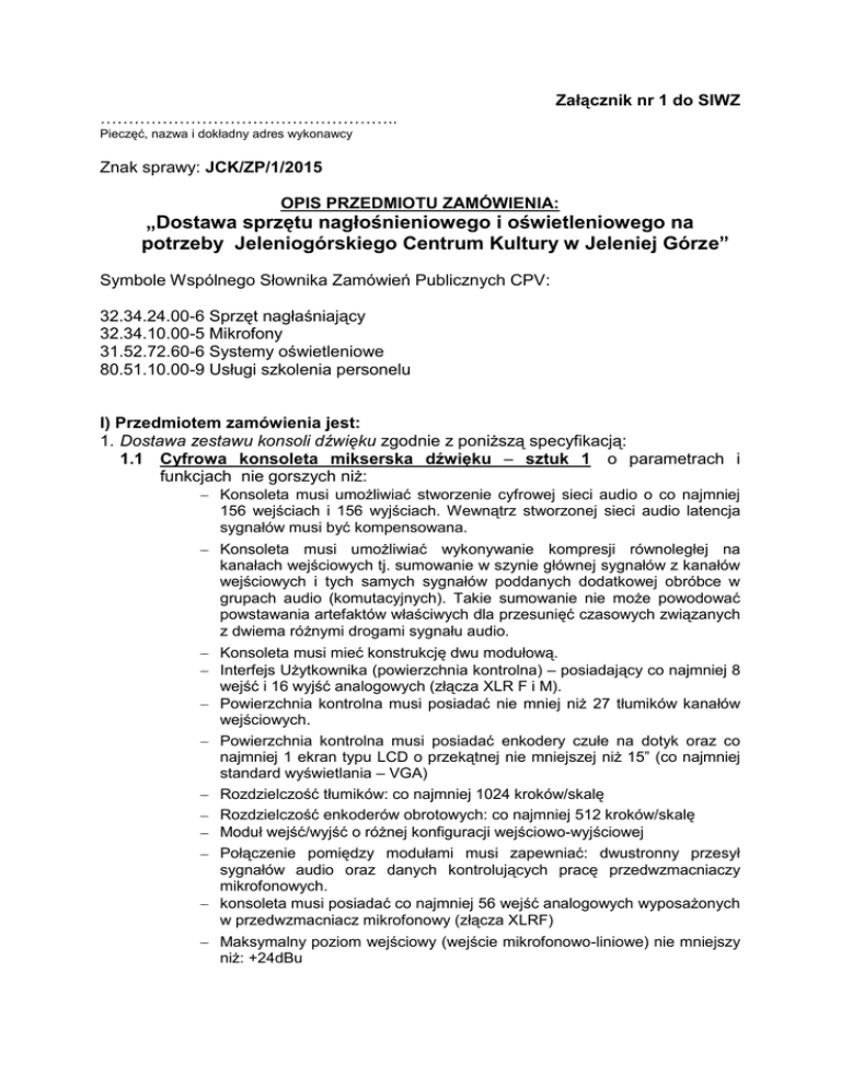 Załącznik nr 1 do SIWZ …………………………………………….. Pieczęć, nazwa i dokładny adres wykonawcy Znak sprawy: JCK/ZP/1/2015 OPIS PRZEDMIOTU ZAMÓWIENIA: „Dostawa sprzętu nagłośnieniowego i oświetleniowego na potrzeby Jeleniogórskiego Centrum Kultury w Jeleniej Górze” Symbole Wspólnego Słownika Zamówień Publicznych CPV: 32.34.24.00-6 Sprzęt nagłaśniający 32.34.10.00-5 Mikrofony 31.52.72.60-6 Systemy oświetleniowe 80.51.10.00-9 Usługi szkolenia personelu I) Przedmiotem zamówienia jest: 1. Dostawa zestawu konsoli dźwięku zgodnie z poniższą specyfikacją: 1.1 Cyfrowa konsoleta mikserska dźwięku – sztuk 1 o parametrach i funkcjach nie gorszych niż: Konsoleta musi umożliwiać stworzenie cyfrowej sieci audio o co najmniej 156 wejściach i 156 wyjściach. Wewnątrz stworzonej sieci audio latencja sygnałów musi być kompensowana. Konsoleta musi umożliwiać wykonywanie kompresji równoległej na kanałach wejściowych tj. sumowanie w szynie głównej sygnałów z kanałów wejściowych i tych samych sygnałów poddanych dodatkowej obróbce w grupach audio (komutacyjnych). Takie sumowanie nie może powodować powstawania artefaktów właściwych dla przesunięć czasowych związanych z dwiema różnymi drogami sygnału audio. Konsoleta musi mieć konstrukcję dwu modułową. Interfejs Użytkownika (powierzchnia kontrolna) – posiadający co najmniej 8 wejść i 16 wyjść analogowych (złącza XLR F i M). Powierzchnia kontrolna musi posiadać nie mniej niż 27 tłumików kanałów wejściowych. Powierzchnia kontrolna musi posiadać enkodery czułe na dotyk oraz co najmniej 1 ekran typu LCD o przekątnej nie mniejszej niż 15” (co najmniej standard wyświetlania – VGA) Rozdzielczość tłumików: co najmniej 1024 kroków/skalę Rozdzielczość enkoderów obrotowych: co najmniej 512 kroków/skalę Moduł wejść/wyjść o różnej konfiguracji wejściowo-wyjściowej Połączenie pomiędzy modułami musi zapewniać: dwustronny przesył sygnałów audio oraz danych kontrolujących pracę przedwzmacniaczy mikrofonowych. konsoleta musi posiadać co najmniej 56 wejść analogowych wyposażonych w przedwzmacniacz mikrofonowy (złącza XLRF) Maksymalny poziom wejściowy (wejście mikrofonowo-liniowe) nie mniejszy niż: +24dBu Wzmocnienie (przed przetwornikiem A/D): w zakresie nie węższym niż: od -2,5dB do +45dB (krok 2,5dB) Przetworniki A/D: pracujące z parametrami nie gorszymi niż 24bit/96kHz, 128 krotne nadpróbkowanie konsoleta musi posiadać co najmniej 32 wyjść analogowych (złącza XLRM) Maksymalny poziom wyjściowy nie mniejszy niż: +21dBu Przetworniki D/A: pracujące z parametrami nie gorszymi niż 24bit/96kHz, 128 krotne nadpróbkowanie konsoleta musi posiadać co najmniej 2 cyfrowe, stereofoniczne wejścia i 2 stereofoniczne wyjścia w formacie AES/EBU (AES3) DSP konsolety musi umożliwiać równoczesne miksowanie co najmniej 80 niezależnych kanałów wejściowych audio DSP konsolety musi umożliwiać równoczesne użycie co najmniej 27 szyn miksujących. DSP konsolety musi umożliwiać równoczesne użycie co najmniej 2 stereofonicznych szyn odsłuchowych (SOLO) DSP i oprogramowanie konsolety musi automatycznie wyrównywać latencję pomiędzy wszystkimi wejściami i wyjściami niezależnie od ich lokalizacji w cyfrowej sieci audio. Konsoleta musi posiadać nie mniej niż 192 grupy typu VCA, które umożliwiają kontrolę poziomów w kanałach wejściowych za pomocą pojedynczego kontrolera (suwaka) Konsoleta musi posiadać nie mniej niż 8 grup typu VCA, które umożliwiają kontrolę poziomów zarówno w kanałach wejściowych jak i wyjściowych za pomocą pojedynczego kontrolera (suwaka) Konsoleta musi posiadać co najmniej 6 grup wyciszających typu (MUTE) Konsoleta musi posiadać możliwość wykorzystania co najmniej 28 korektorów graficznych wyposażonych w: 31 pasm częstotliwościowych, 2 przestrajalne filtry typu notch Konsoleta musi posiadać nie mniej niż 56 kompresorów na kanałach wejściowych Konsoleta musi posiadać nie mniej niż 56 bramek szumów na kanałach wejściowych Konsoleta musi posiadać nie mniej niż 64 korektorów parametrycznych na kanałach wejściowych Konsoleta musi posiadać możliwość użycia nie mniej niż 6 wirtualnych procesorów sygnałowych Konsoleta musi posiadać możliwość synchronizacji z urządzeniami zewnętrznymi za pomocą co najmniej 4 sygnałów: MIDI (wejście i wyjście), WordClock (wejście i wyjście), Video (black burst) (wejście) oraz AES/EBU (AES3) (wejście i wyjście) Konsoleta musi posiadać wymiary nie większe niż: Szerokość: 120 cm; Głębokość: 80 cm; Waga: 50 kg Profesjonalna skrzynia transportowa na konsolę. 1.2 Moduł wejściowo/wyjściowy – sztuk 1 o parametrach i funkcjach nie gorszych niż: (48x wejść mikrofonowo-liniowych; 16x wyjść) 1.3 Bezprzewodowy systemy mikrofonów składający się z: 1.3.1 Mikrofon bezprzewodowy UHF (nadajnik z mikrofonem) – sztuk 3 o parametrach i funkcjach nie gorszych niż: Wyświetlanie informacji o grupie i kanale transmisji Regulowana kontrola wzmocnienia sygnału audio Kontroler wzmocnienia Zasięg efektywny: 100m Charakterystyka częstotliwościowa audio: 25 do 15000 Hz, ±2 dB Zakres regulacji wzmocnienia nadajnika: 25 dB Poziom sygnału wyjściowego audio odbiornika (odchylenie ±38 kHz, dźwięk 1 kHz) Złącze XLR (przy obciążeniu 600 omów): +3.9 dBV (line), –17 dBV (mic) Złącze 1/4 cala (przy obciążeniu 3000 omów): –2 dBV Czułość RF: 1.26 μV dla 12 dB SINAD (typowo) Tłumienie sygnału lustrzanego: 80 dB typowo Tłumienie sygnałów zakłócających: 75 dB typowo Ultimate Quieting (odchylenie referencyjne ±38 kHz) : >105 dB, Aważony Zniekształcenia systemu (odchylenie referencyjne ±38 kHz, modulacja 1 kHz): 0.3% całkowite zniekształcenia harmoniczne, typowo Zasilanie: bateria alkaliczna 9 V Żywotność baterii: do 9 godzin Zakres temperatury pracy: - 20° do 49° C Moc w
