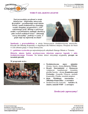 TORUŃ SZLAKIEM LEGEND Nasi przewodnicy przebrani w stroje historyczne – Kopernika, mieszczan, Krzyżaków – przedstawiają swoje miasto Toruń z epoki średniowiecza, aranżując scenki, anegdoty, przypowieści z „ich” codziennego życia. Mówiąc w pierwszej osobie, w przebraniach, traktując słuchaczy jako swoich osobistych Gości – dokonują rzeczy niezwykłej – podróży w czasie. A gotyk staje się naprawdę na dotyk! Spotkanie z przewodnikiem w stroju historycznym (średniowieczna mieszczka, krzyżak lub Mikołaj Kopernik) w dogodnym dla Państwa miejscu. Przejście do biura w celu ubrania grupy w stroje historyczne. 2 – godzinna wycieczka po najważniejszych zabytkach Starego Miasta w Toruniu. Historia miasta będzie przekazywana dzieciom poprzez legendy i mity średniowiecznego Torunia. Na koniec dzieci otrzymują oryginalny przepis na toruński piernik. W programie m.in.: Średniowieczne mury miejskie (bramy, baszty, słynna Krzywa Wieża) Rynek Staromiejski z Ratuszem i pięknymi kamienicami (toruńska perełka baroku - słynna Kamienica pod Gwiazdą), Gospoda Flisacza, pomnik Kopernika, Flisaka, toruński pręgierz Dom Wielkiego Astronoma – Mikołaja Kopernika – z zewnątrz Średniowieczne kościoły – katedra śś. Janów, kościół NMP – z zewnątrz Serdecznie zapraszamy!