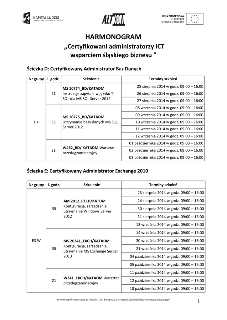 HARMONOGRAM „Certyfikowani administratorzy ICT wsparciem śląskiego biznesu ” Ścieżka D: Certyfikowany Administrator Baz Danych Nr grupy l. godz. Szkolenie MS 10774_BD/KATADM Instrukcje zapytań w języku TSQL dla MS SQL Server 2012 21 Terminy szkoleń 25 sierpnia 2014 w godz. 09:00 – 16:00 26 sierpnia 2014 w godz. 09:00 – 16:00 Instrukcje zapytań2014 w języku T-SQL dla–MS SQL Server 2012 27 sierpnia w godz. 09:00 16:00 08 września 2014 w godz. 09:00 – 16:00 D4 MS 10775_BD/KATADM Utrzymanie bazy danych MS SQL Server 2012 35 09 września 2014 w godz. 09:00 – 16:00 10 września 2014 w godz. 09:00 – 16:00 11 września 2014 w godz. 09:00 – 16:00 12 września 2014 w godz. 09:00 – 16:00 01 października 2014 w godz. 09:00 – 16:00 W462_BD/ KATADM Warsztat przedegzaminacyjny 21 02 października 2014 w godz. 09:00 – 16:00 03 października 2014 w godz. 09:00 – 16:00 Ścieżka E: Certyfikowany Administrator Exchange 2010 Nr grupy l. godz. Szkolenie Terminy szkoleń 23 sierpnia 2014 w godz. 09:00 – 16:00 35 AM 2012_EXCH/KATDM Konfiguracja, zarządzanie i utrzymanie Windows Server 2012 24 sierpnia 2014 w godz. 09:00 – 16:00 30 sierpnia 2014 w godz. 09:00 – 16:00 31 sierpnia 2014 w godz. 09:00 – 16:00 13 września 2014 w godz. 09:00 – 16:00 14 września 2014 w godz. 09:00 – 16:00 E3 W 35 MS 20341_EXCH/KATADM Konfiguracja, zarzadzanie i utrzymanie MS Exchange Server 2013 20 września 2014 w godz. 09:00 – 16:00 21 września 2014 w godz. 09:00 – 16:00 04 października 2014 w godz. 09:00 – 16:00 05 października 2014 w godz. 09:00 – 16:00 11 października 2014 w godz. 09:00 – 16:00 21 W341_EXCH/KATADM Warsztat przedegzaminacyjny 12 października 2014 w godz. 09:00 – 16:00 18 października 2014 w godz. 09:00 – 16:00 Projekt współfinansowany ze środków Unii Europejskiej w ramach Europejskiego Funduszu Społecznego 1 Ścieżka F: Certyfikowany projektant aplikacji internetowych Nr grupy Szkolenie l. godz. Terminy szkoleń 22 września 2014 w godz. 09:00 – 16:00 35 CMS+XHTML+CSS/KATADM najlepsza droga do profesjonalnego serwisu WWW 23 września 2014 w godz. 09:00 – 16:00 24 września 2014 w godz. 09:00 – 16:00 25 września 2014 w godz. 09:00 – 16:00 26 września 2014 w godz. 09:00 – 16:00 F2 21 21 RD_WEB/KATADM Responsive design z Adobe Dreamweaver 08 października 2014 w godz. 09:00 – 16:00 PSD/KATADM Adobe Photoshop - obróbka cyfrowa zdjęć i publikowanie w intrenecie 20 października 2014 w godz. 09:00 – 16:00 09 października 2014 w godz. 09:00 – 16:00 10 października 2014 w godz. 09:00 – 16:00 21 października 2014 w godz. 09:00 – 16:00 22 października 2014 w godz. 09:00 – 16:00 Ścieżka A: Certyfikowany Administrator RedHat Linux Rekrutacja zakończona. Ścieżka B: Certyfikowany specjalista Technologii Active Directory Rekrutacja zakończona. Ścieżka C: Certyfikowany specjalista Technologii Sieciowych Rekrutacja zakończona. Projekt współfinansowany ze środków Unii Europejskiej w ramach Europejskiego Funduszu Społecznego 2