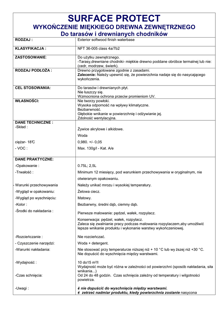 SURFACE PROTECT WYKOŃCZENIE MIĘKKIEGO DREWNA ZEWNĘTRZNEGO Do tarasów i drewnianych chodników RODZAJ : Exterior softwood finish waterbase KLASYFIKACJA : NFT 36-005 class 4a/7b2 ZASTOSOWANIE: Do użytku zewnętrznego. -Tarasy,drewniane chodniki- miękkie drewno poddane obróbce termalnej lub nie: (cedr, modrzew, świerk). Drewno przygotowane zgodnie z zasadami. Zalecenie: Należy upewnić się, że powierzchnia nadaje się do nasycającego wykończenia. RODZAJ PODŁOŻA : CEL STOSOWANIA: WŁASNOŚCI: DANE TECHNICZNE : -Skład : Do tarasów i drewnianych płyt. Nie łuszczy się. Wzmocniona ochrona przeciw promieniom UV. Nie tworzy powłoki. Wysoka odporność na wpływy klimatyczne. Bezbarwność. Głębokie wnikanie w powierzchnię i odżywianie jej. Zdolność wentylacyjna. Żywice akrylowe i alkidowe. Woda ciężar- 18°C 0,980. +/- 0,05 - VOC : Max. 130g/l - Kat. A/e DANE PRAKTYCZNE: -Opakowanie : 0.75L; 2,5L -Trwałość : Minimum 12 miesięcy, pod warunkiem przechowywania w oryginalnym, nie otwieranym opakowaniu. - Warunki przechowywania Należy unikać mrozu i wysokiej temperatury. -Wygląd w opakowaniu: Żelowa ciecz. -Wygląd po wyschnięciu: Matowy. -Kolor : Bezbarwny, średni dąb, ciemny dąb. -Środki do nakładania : Pierwsze malowanie: pędzel, wałek, rozpylacz. Konserwacja: pędzel, wałek, rozpylacz. Zaleca się zwalnianie pracy podczas malowania rozpylaczem,aby umożliwić lepsze wnikanie produktu i wykonanie warstwy wykończeniowej. -Rozcieńczanie : Nie rozcieńczać. - Czyszczenie narzędzi: Woda + detergent. -Warunki nakładania: Nie stosować przy temperaturze niższej niż + 10 ° C lub wy ższej niż +30 ° C. Nie dopuścić do wyschnięcia między warstwami. -Wydajność : 10 do15 m²/l Wydajność może być różna w zależności od powierzchni (sposób nakładania, siła wnikania...) Od 24 do 48 godzin. Czas schnięcia zależny od temperatury i wilgotności powietrza. -Czas schnięcia: -Uwagi : nie dopuścić do wyschnięcia między warstwami. zetrzeć nadmiar produktu, kiedy powierzchnia zostanie nasycona -Bezpieczeństwo : Patrz: karta bezpieczeństwa i informacje na opakowaniu. Zgodne z obowiązującymi przepisami. PRZYGOTOWANIE PODŁOŻA: - Przygotowanie powierzchni Stare, zszarzałe, barwione drewno czyścić środkiem: Wood Cleaner. Drewno wykończone, lakierowane lub barwione :czyścić lub zmatowić środkiem Wood Cleaner. Drewno naoliwione: stosować Wood oil cleaner, a następnie Wood Cleaner. • Należy upewnić się, że stolarka jest czysta i sucha. • Tluste i łuszczące się warstwy muszą być dokładnie usunięte. • Nie nakładać żadnego bezbarwnego wykończenia dopóki powierzchnia nie zostanie należycie przygotowana ( matowienie, odtłuszczenie, usunięcie kurzu). • Nie nakładać w temperaturze niższej niż +10°C, w sło ńcu lub podczas deszczowej pogody. - Uwagi - Nakładanie - Konserwacja 1. Gotowy do użytku. Nie rozcieńczać. 2. Na świeże drewno: nałożyć 3 warstwy Protect Chalets. Na drewno wczesniej poddane zabiegom: nałożyć 2 warstwy.. - Nie szlifować pomiędzy warstwami. - Zetrzeć nadmiar produktu, kiedy powierzchnia zostanie nasycona. • Jeśli powierzchnia jest zabrudzona, należy ją wyczyścić środkiem Wood Cleaner i pozostawić do wyschnięcia (3 dni przy suchej pogodzie). Może być stosowany za pomocą pędzla, wałka lub rozpylacza. Zwykle wystarczy jedna warstwa. Nie szlifować, nie czyścić. Na powierzchni bardzo porowatej może być konieczna powtórna warstwa. Nasz dział techniczny jest do Państwa dyspozycji. Zadzwoń do: Belgii: 010 42 00 90 Francji: 01 60 86 48 70 (na rynku francuskim) Albo zajrzyj na naszą stronę www.linitop.com . LINITOP jest znakiem firmowym: Wersja z 12/03/10