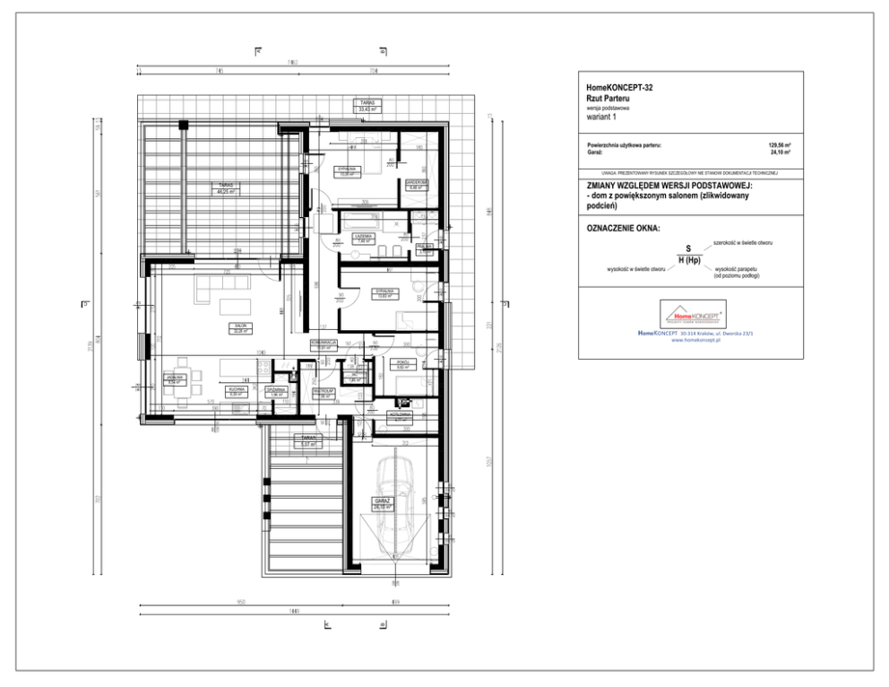 A B HomeKONCEPT-32 Rzut Parteru TARAS 33,43 m² wersja podstawowa wariant 1 Powierzchnia użytkowa parteru: Garaż: SYPIALNIA 15,05 m² 129,56 m² 24,10 m² UWAGA: PREZENTOWANY RYSUNEK SZCZEGÓŁOWY NIE STANOWI DOKUMENTACJI TECHNICZNEJ GARDEROBA 6,48 m² TARAS 46,25 m² ZMIANY WZGLĘDEM WERSJI PODSTAWOWEJ: - dom z powiększonym salonem (zlikwidowany podcień) OZNACZENIE OKNA: ŁAZIENKA 7,49 m² PRALNIA 3,15 m² S H (Hp) wysokość w świetle otworu szerokość w świetle otworu wysokość parapetu (od poziomu podłogi) SYPIALNIA 13,83 m² C C SALON 32,26 m² Home KONCEPT 30-314 Kraków, ul. Dworska 23/1 www.homekoncept.pl KOMUNIKACJA 11,81 m² POKÓJ 8,82 m² WC 1,45 m² JADALNIA 8,54 m² WIATROŁAP 7,56 m² KOTŁOWNIA 4,77 m² TARAS 5,07 m² GARAŻ 24,10 m² B SPIŻARNIA 1,96 m² A KUCHNIA 6,39 m²