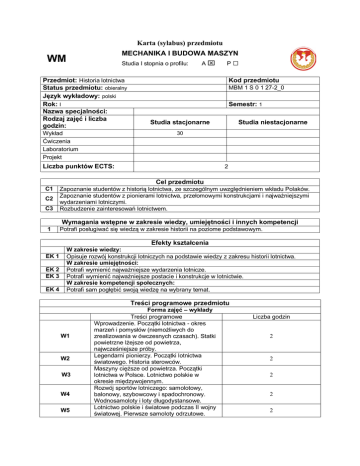 Karta (sylabus) przedmiotu MECHANIKA I BUDOWA MASZYN Studia I stopnia o profilu: A P□ WM Przedmiot: Historia lotnictwa Status przedmiotu: obieralny Język wykładowy: polski Rok: I Nazwa specjalności: Rodzaj zajęć i liczba godzin: Wykład Ćwiczenia Laboratorium Projekt Kod przedmiotu MBM 1 S 0 1 27-2_0 Semestr: 1 Studia stacjonarne Studia niestacjonarne 30 Liczba punktów ECTS: 2 Cel przedmiotu C1 C2 C3 Zapoznanie studentów z historią lotnictwa, ze szczególnym uwzględnieniem wkładu Polaków. Zapoznanie studentów z pionierami lotnictwa, przełomowymi konstrukcjami i najważniejszymi wydarzeniami lotniczymi. Rozbudzenie zainteresowań lotnictwem. Wymagania wstępne w zakresie wiedzy, umiejętności i innych kompetencji 1 Potrafi posługiwać się wiedzą w zakresie historii na poziome podstawowym. Efekty kształcenia EK 1 EK 2 EK 3 EK 4 W zakresie wiedzy: Opisuje rozwój konstrukcji lotniczych na podstawie wiedzy z zakresu historii lotnictwa. W zakresie umiejętności: Potrafi wymienić najważniejsze wydarzenia lotnicze. Potrafi wymienić najważniejsze postacie i konstrukcje w lotnictwie. W zakresie kompetencji społecznych: Potrafi sam pogłębić swoją wiedzę na wybrany temat. Treści programowe przedmiotu W1 W2 W3 W4 W5 Forma zajęć – wykłady Treści programowe Wprowadzenie. Początki lotnictwa - okres marzeń i pomysłów (niemożliwych do zrealizowania w ówczesnych czasach). Statki powietrzne lżejsze od powietrza, najwcześniejsze próby. Legendarni pionierzy. Początki lotnictwa światowego. Historia sterowców. Maszyny cięższe od powietrza. Początki lotnictwa w Polsce. Lotnictwo polskie w okresie międzywojennym. Rozwój sportów lotniczego: samolotowy, balonowy, szybowcowy i spadochronowy. Wodnosamoloty i loty długodystansowe. Lotnictwo polskie i światowe podczas II wojny światowej. Pierwsze samoloty odrzutowe. Liczba godzin 2 2 2 2 2 W6 W7 W8 W9 W10 W11 W12 W13 W14 W15 Rozwój lotnictwa w okresie powojennym w Polsce i na świecie. Sławni polscy konstruktorzy i polskie maszyny lotnicze. Wkład polskich naukowców, konstruktorów i pilotów w światowy rozwój lotnictwa samolotowego i szybowcowego. Historia polskich śmigłowców. Śmigłowce produkowane w PZL Świdnik. Śmigłowce produkowane na świecie. Największe katastrofy i wypadki lotnicze w Polsce i na świecie. Aktualny stan przemysłu lotniczego w Polsce i na świecie. Lotnictwo ogólne. Samoloty myśliwskie. Udział lotnictwa w wojnach. Samoloty ponaddźwiękowe. Historia lotów kosmicznych. Promy kosmiczne. Lotnictwo pasażerskie. Słynne samoloty pasażerskie. Trendy w światowym przemyśle lotniczym: nowoczesne technologie wytwarzania, badania i potencjał badawczy. Wytwórcy lotniczy. Kolokwium zaliczeniowe Suma godzin: 2 2 2 2 2 2 2 2 2 2 30 Narzędzia dydaktyczne 1 Wykład informacyjny z wykorzystaniem środków audiowizualnych. Sposoby oceny F1 P1 Ocena formująca Uzyskanie oceny z kolokwium zaliczeniowego. Ocena podsumowująca Student musi uzyskać ocenę pozytywną z kolokwium na wykładzie. Obciążenie pracą studenta Forma aktywności Średnia liczba godzin na zrealizowanie aktywności Godziny kontaktowe z wykładowcą, realizowane w formie zajęć dydaktycznych – łączna liczba godzin w semestrze Godziny kontaktowe z wykładowcą, realizowane w formie konsultacji w odniesieniu – łączna liczba godzin w semestrze Przygotowanie się do laboratorium – łączna liczba godzin w semestrze Przygotowanie się do zajęć, indywidualna praca studenta – łączna liczba godzin w semestrze Suma Sumaryczna liczba punktów ECTS dla przedmiotu 30 5 0 15 50 2 Literatura podstawowa i uzupełniająca 1 2 Riccardo Nicocoli. Historia lotnictwa. Carta Blanca, 2007. Simons David, Withington Thomas. Historia Lotnictwa. Od Pierwszych Dwupłatowców po Podbój Kosmosu. Wydawnictwo Parragon, 2007. 3 4 Opracowanie zbiorowe. Historia lotnictwa w Polsce . Carta Blanca, 2011. Janusz Wojciechowski. Mięśnioloty. Wydawnictwo Skrzydlatej Polski, 1979. Opracowanie zbiorowe. Najlepsze samoloty świata – relacje pilotów. Wydawnictwo Olesiejuk, 2010. David Simon. Historia Lotnictwa , Wydawnictwo Withington, 1997. Jerzy Konieczny. Kronika lotnictwa polskiego 1241-1945, WKŁ, W-wa1984. Jerzy Konieczny. Kronika lotnictwa polskiego 1945-1981, WKŁ, W-wa1984. 5 6 7 8 Macierz efektów kształcenia Efekt kształcenia EK 1 Odniesienie danego efektu kształcenia do efektów zdefiniowanych dla całego programu (PEK) MBM1A_W24 + MBM1A_K06 + Cele przedmiotu C1, C2, C3 EK 2 MBM1A_U01 + C1, C2 EK 3 MBM1A_U01 + C1, C2 EK 4 MBM1A_U05 + C3 Na ocenę 2 (ndst) Treści programowe Narzędzia dydaktyczne Sposób oceny 1 F1, P1 1 F1, P1 1 F1, P1 1 F1, P1 W1-W15 W3, W5, W6W11, W14 W2, W7 W12- W14 Formy oceny – szczegóły Na ocenę 3 (dst) Na ocenę 4 (db) Wymienia Wymienia najważniejsze najważniejsze konstrukcje konstrukcje lotniczych i potrafi je lotniczych. ogólnie scharakteryzować. Zna wydarzenia z Zna podstawowe historii lotnictwa i wydarzenia z historii potrafi omówić kilka lotnictwa. z nich. EK1 Nie potrafi nic powiedzieć na temat rozwoju konstrukcji lotniczych. EK 2 Nie potrafi nic powiedzieć na temat najważniejszych wydarzeń lotniczych. EK 3 Nie potrafi nic powiedzieć o żadnej postaci lotniczej ani żadnej konstrukcji lotniczej. Potrafi wymienić kilka znanych postaci z historii lotnictwa Potrafi wymienić wiele znanych postaci z historii lotnictwa. EK 4 Nie potrafi sam pogłębić swojej wiedzy na temat lotnictwa. Potrafi sam pogłębić swoją wiedzę na temat lotnictwa w określonym zakresie. Potrafi sam pogłębić swoją wiedzę na temat lotnictwa w rozszerzonym zakresie. Autor programu: Adres e-mail: Jednostka organizacyjna: Osoba, osoby prowadzące: Na ocenę 5 (bdb) Wymienia i analizuje rozwój konstrukcji lotniczych na przełomie wieków. Zna wydarzenia z historii lotnictwa i potrafi omówić wiele z nich. Potrafi wymienić wiele znanych postaci z historii lotnictwa oraz zna kilka znanych konstr