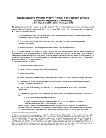Rozporządzenie Ministra Pracy i Polityki Społecznej w sprawie zakładów aktywności zawodowej z dnia 14 grudnia 2007 r. (Dz.U. Nr 242, poz. 1776) Na podstawie art. 29 ust. 4 ustawy z dnia 27 sierpnia 1997 r. o rehabilitacji zawodowej i społecznej oraz 1 zatrudnianiu osób niepełnosprawnych (Dz.U. Nr 123, poz. 776, z późn. zm. ) zarządza się, co następuje: § 1. Rozporządzenie określa: 1) szczegółowy sposób, tryb i warunki tworzenia, finansowania i działania zakładów aktywności zawodowej, zwanych dalej „zakładami”; 2) czas pracy i rehabilitacji osób zaliczonych do znacznego lub umiarkowanego stopnia niepełnosprawności; 3) sposób tworzenia i wykorzystywania zakładowego funduszu aktywności. § 2. 1. Gmina, powiat oraz fundacja, stowarzyszenie lub inna organizacja społeczna, której statutowym zadaniem jest rehabilitacja zawodowa i społeczna osób niepełnosprawnych, zwane dalej „organizatorem”, składają we właściwej jednostce organizacyjnej samorządu województwa wniosek o dofinansowanie ze środków Państwowego Funduszu Rehabilitacji Osób Niepełnosprawnych, zwanego dalej „Funduszem”, kosztów utworzenia i działania zakładu. 2. Wniosek powinien zawierać: 1) nazwę i siedzibę organizatora; 2) status prawny i podstawę działania organizatora; 3) statut organizatora; 4) adres i dokument potwierdzający tytuł prawny do obiektu lub lokalu przeznaczonego na zakład; 5) proponowaną liczbę niepełnosprawnych pracowników zakładu wraz z określeniem stopnia i rodzaju ich niepełnosprawności; 6) plan i rodzaj działalności gospodarczej oraz zakres planowanej rehabilitacji zawodowej i społecznej; 7) proponowaną wysokość podstawowego wynagrodzenia osób niepełnosprawnych zaliczonych do: a) znacznego stopnia niepełnosprawności, b) umiarkowanego stopnia niepełnosprawności, u których stwierdzono autyzm, upośledzenie umysłowe lub chorobę psychiczną - zwanych dalej „osobami niepełnosprawnymi zaliczonymi do znacznego lub umiarkowanego stopnia niepełnosprawności”, wyrażoną jako wskaźnik procentowy minimalnego wynagrodzenia za pracę określonego w przepisach o minimalnym wynagrodzeniu za pracę, zwanego dalej 1 Zmiany wymienionej ustawy zostały ogłoszone w Dz. U. z 1997 r. Nr 160, poz. 1082, z 1998 r. Nr 99, poz. 628, Nr 106, poz. 668, Nr 137, poz. 887, Nr 156, poz. 1019 i Nr 162, poz. 1118 i 1126, z 1999 r. Nr 49, poz. 486, Nr 90, poz. 1001, Nr 95, poz. 1101 i Nr 111, poz. 1280, z 2000 r. Nr 48, poz. 550 i Nr 119, poz. 1249, z 2001 r. Nr 39, poz. 459, Nr 100, poz. 1080, Nr 125, poz. 1368, Nr 129, poz. 1444 i Nr 154, poz. 1792 i 1800, z 2002 r. Nr 169, poz. 1387, Nr 200, poz. 1679 i 1683 i Nr 241, poz. 2074, z 2003 r. Nr 7, poz. 79, Nr 90, poz. 844, Nr 223, poz. 2217 i Nr 228, poz. 2262, z 2004 r. Nr 96, poz. 959, Nr 99, poz. 1001 i Nr 240, poz. 2407, z 2005 r. Nr 44, poz. 422, Nr 132, poz. 1110, Nr 163, poz. 1362, Nr 164, poz. 1366 i Nr 167, poz. 1398, z 2006 r. Nr 63, poz. 440, Nr 94, poz. 651 i Nr 170, poz. 1217 oraz z 2007 r. Nr 23, poz. 144, Nr 115, poz. 791 i Nr 181, poz. 1288. „minimalnym wynagrodzeniem”; 8) proponowaną obsadę etatową zakładu, z wyszczególnieniem liczby stanowisk i wymaganych kwalifikacji pracowników zatrudnionych w działalności obsługowo-rehabilitacyjnej; 9) preliminarz kosztów utworzenia zakładu, z uwzględnieniem podziału na poszczególne rodzaje kosztów, o których mowa w § 7, z kalkulacją lub innym uzasadnieniem przyjętych kosztów; 10) preliminarz kosztów działalności obsługowo-rehabilitacyjnej zakładu, z podziałem na poszczególne rodzaje kosztów, o których mowa w § 8, z kalkulacją lub innym uzasadnieniem przyjętych kosztów; 11) plan pomieszczeń zakładu oraz projekt dostosowania obiektów i lokali do potrzeb prowadzonej produkcji w zakładzie z uwzględnieniem dostosowania do potrzeb i możliwości pracowników wynikających z ich niepełnosprawności; 12) projekt regulaminu zakładu oraz regulaminu zakładowego funduszu aktywności. 3. W przypadku stwierdzenia braków w złożonym przez organizatora wniosku, właściwa jednostka organizacyjna samorządu województwa wzywa do ich uzupełnienia w terminie 14 dni od daty doręczenia. Nieuzupełnienie tych braków powoduje pozostawienie wniosku bez rozpatrzenia. 4. Właściwa jednostka organizacyjna samorządu województwa przedkłada wniosek właściwemu staroście, który w ciągu 14 dni wydaje opinię dotyczącą zasadności utworzenia zakładu. 5. Po uzyskaniu pozytywnej opinii starosty właściwa jednostka organizacyjna samorządu województwa rozpatruje wniosek pod względem prawidłowości planowanych kosztów utworzenia i działania zakładu, z uwzględnieniem w szczególności: 1) wysokości środków Funduszu w danym roku; 2) liczby osób niepełnosprawnych zaliczonych do znacznego lub umiarkowanego stopnia niepełnosprawności; 3) wkładu organizatora w utworzenie zakładu. § 3. 1. W terminie 30 dni od dnia otrzymania opinii starosty właściwa jednostka organizacyjna samorządu województwa powiadamia organizatora o sposobie rozpatrzenia wniosku, a następnie w przypadku pozytywnego jego rozpatrzenia - w terminie 30 dni od dnia powiadomienia organizatora - prowadzi z organizatorem negocjacje w przedmiocie warunków umowy i wysokości dofinansowania ze środków Funduszu. 2. Po osiągnięciu porozumienia i zakończeniu negocjacji strony zawierają umowę o dofinansowanie ze środków Funduszu kosztów utworzenia i działania zakładu, zwaną dalej „umową”, określającą w szczególności: 1) wysokość, termin oraz sposób przekazania środków Funduszu przeznaczonych na utworzenie zakładu, z podziałem na poszczególne rodzaje kosztów; 2) wysokość, termin oraz sposób przekazywania środków Funduszu przeznaczonych na działalność obsługowo-rehabilitacyjną zakładu do końca danego roku kalendarzowego, z podziałem na poszczególne rodzaje kosztów; 3) warunki renegocjacji umowy; 4) termi