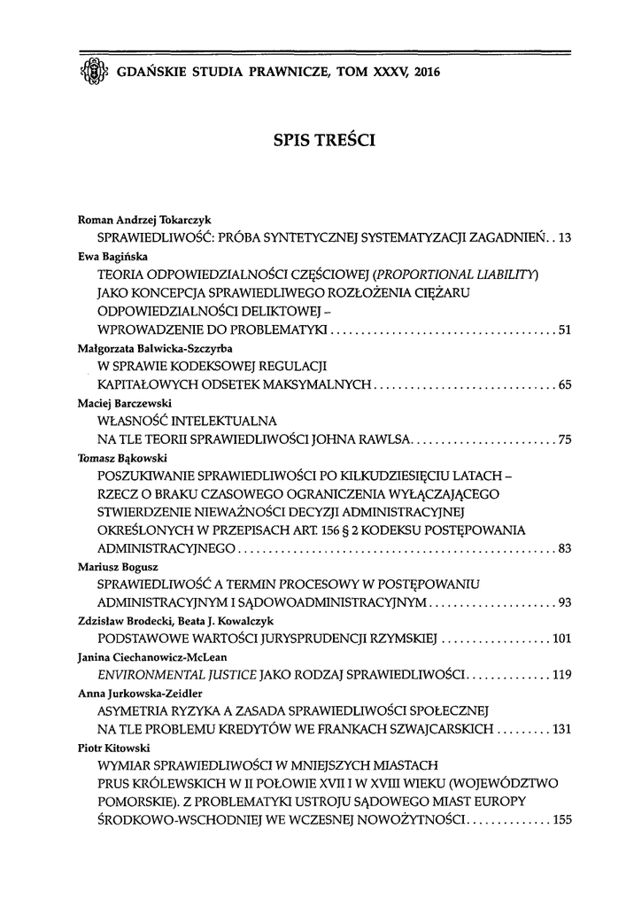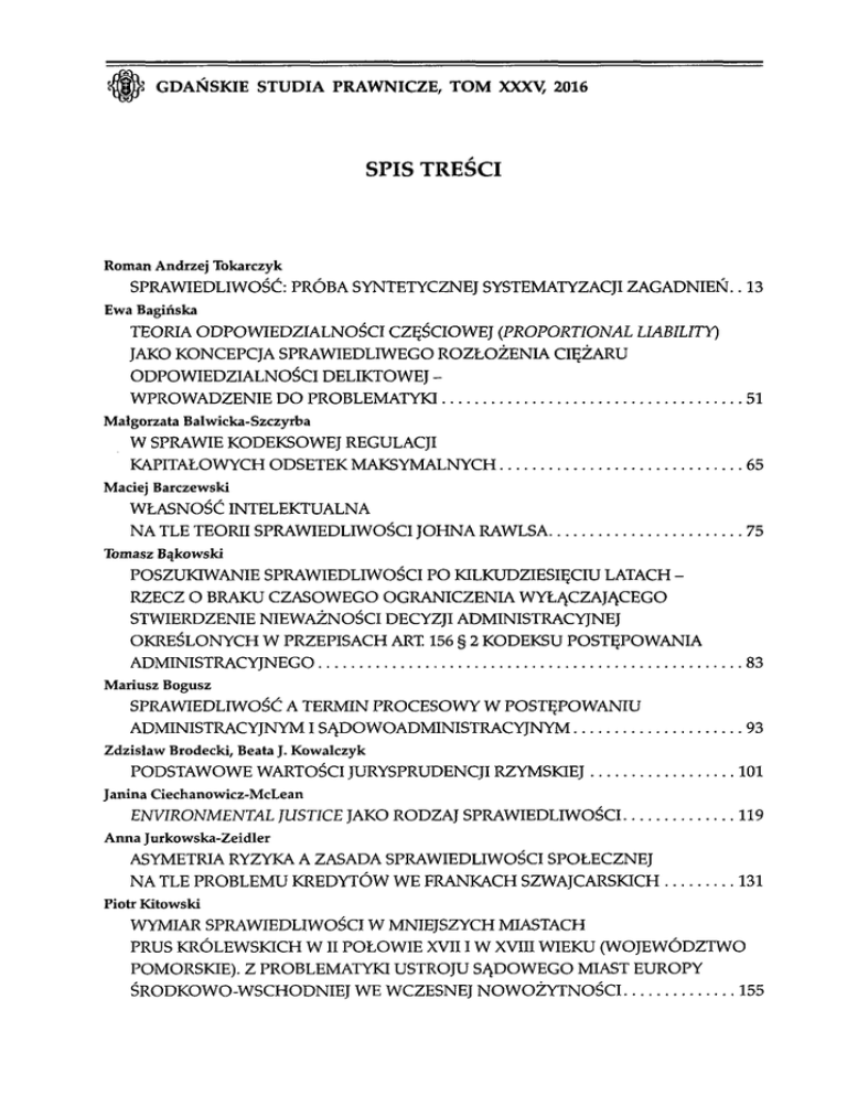 Ш GDAŃSKIE STUDIA PRAWNICZE, TOM XXXV, 2016 SPIS TREŚCI Roman Andrzej Tokarczyk SPRAWIEDLIWOŚĆ: PRÓBA SYNTETYCZNEJ SYSTEMATYZACJI ZAGADNIEŃ.. 13 Ewa Bagińska TEORIA ODPOWIEDZIALNOŚCI CZĘŚCIOWEJ (PROPORTIONAL LIABILITY) JAKO KONCEPCJA SPRAWIEDLIWEGO ROZŁOŻENIA CIĘŻARU ODPOWIEDZIALNOŚCI DELIKTOWEJ WPROWADZENIE DO PROBLEMATYKI 51 Małgorzata Balwicka-Szczyrba W SPRAWIE KODEKSOWEJ REGULACJI KAPITAŁOWYCH ODSETEK MAKSYMALNYCH 65 Maciej Barczewski WŁASNOŚĆ INTELEKTUALNA NA TLE TEORII SPRAWIEDLIWOŚCI JOHNA RAWLSA 75 Tomasz Bąkowski POSZUKIWANIE SPRAWIEDLIWOŚCI PO KILKUDZIESIĘCIU LATACH RZECZ O BRAKU CZASOWEGO OGRANICZENIA WYŁĄCZAJĄCEGO STWIERDZENIE NIEWAŻNOŚCI DECYZJI ADMINISTRACYJNEJ OKREŚLONYCH W PRZEPISACH ART. 156 § 2 KODEKSU POSTĘPOWANIA ADMINISTRACYJNEGO 83 Mariusz Bogusz SPRAWIEDLIWOŚĆ A TERMIN PROCESOWY W POSTĘPOWANIU ADMINISTRACYJNYM ISĄDOWOADMINISTRACYJNYM 93 Zdzisław Brodecki, Beata J. Kowalczyk PODSTAWOWE WARTOŚCI JURYSPRUDENCJI RZYMSKIEJ 101 Janina Ciechanowicz-McLean ENVIRONMENTAL JUSTICE JAKO RODZAJ SPRAWIEDLIWOŚCI 119 Anna Jurkowska-Zeidler ASYMETRIA RYZYKA A ZASADA SPRAWIEDLIWOŚCI SPOŁECZNEJ NA TLE PROBLEMU KREDYTÓW WE FRANKACH SZWAJCARSKICH 131 Piotr Kitowski WYMIAR SPRAWIEDLIWOŚCI W MNIEJSZYCH MIASTACH PRUS KRÓLEWSKICH W I I POŁOWIE XVII I W XVIII WIEKU (WOJEWÓDZTWO POMORSKIE). Z PROBLEMATYKI USTROJU SĄDOWEGO MIAST EUROPY ŚRODKOWO-WSCHODNIEJ WE WCZESNEJ NOWOŻYTNOŚCI 155 Spis treści 6 Tomasz Tadeusz Koncewicz SĄDOWA SPRAWIEDLIWOŚĆ PROCEDURALNA W PRAWIE EUROPEJSKIM* 173 Joanna Kruczalak-Jankowska CZY STOSOWANIE OBCEGO PRAWA PRZEZ SĄD POLSKI MOŻE BYĆ NIESPRAWIEDLIWE? ROZWAŻANIA Z ZAKRESU PRAWA PRYWATNEGO MIĘDZYNARODOWEGO I MIĘDZYNARODOWEJ PROCEDURY CYWILNEJ NA TLE POSTANOWIENIA SĄDÓW REJONOWEGO I OKRĘGOWEGO W KIELCACH Z 2015 ROKU (II CA 1533, U CZ1784) 255 Katarzyna Lasak DOSTĘPNOŚĆ USŁUG BANKOWYCH DLA OSÓB NIEDOWIDZĄCYCH I NIEWIDOMYCH. UWAGI NA TLE OPINII KOMITETU DO SPRAW PRAW OSÓB NIEPEŁNOSPRAWNYCH W SPRAWIE SZILVIA NYUSTI I PÉTER TAKÂCS PRZECIWKO WĘGROM 265 Anna Machnikowska PRAWO DO SĄDU A SZYBKOŚĆ POSTĘPOWANIA CYWILNEGO 281 Sylwia Majkowska-Szulc PROMOCJA SPRAWIEDLIWEGO HANDLU NA SZCZEBLU UNII EUROPEJSKIEJ 295 Dorota Maśniak ROZWAŻANIA NA TEMAT SPRAWIEDLIWEJ KOMPENSACJI SZKÓD KOMUNIKACYJNYCH 307 Justyna Nawrot MIĘDZY SCYLLĄ A CHARYBDĄ. SYTUACJA STATKU PAŃSTWA UNII EUROPEJSKIEJ 323 Oktawian Nawrot KONWERGENCJA NBIC JAKO WYZWANIE DLA SYSTEMÓW OCHRONY PRAW CZŁOWIEKA 339 Maciej Nyka SPRAWIEDLIWOŚĆ MIĘDZYPOKOLENIOWO W MIĘDZYNARODOWYM PRAWIE ŚRODOWISKA 355 Andrzej Powałowski SPRAWIEDLIWOŚĆ SPOŁECZNA A DZIAŁALNOŚĆ GOSPODARCZA 373 Anna Rytel-Warzocha „DYSKRYMINACJA POZYTYWNA" JAKO PRZEJAW URZECZYWISTNIANIA ZASADY SPRAWIEDLIWOŚCI SPOŁECZNEJ 385 Paweł Sut UWAGI O SPRAWIEDLIWOŚCI SPOŁECZNEJ JAKO REALIZOWALNYM PRAWNIE CELU PAŃSTWA DEMOKRATYCZNEGO 399 Spis treści 7 Andrzej Szmyt WYBÓR DROGI WYMIARU SPRAWIEDLIWOŚCI (W SPRAWIE ODPOWIEDZIALNOŚCI PREZESA NAJWYŻSZEJ IZBY KONTROLI) 413 Grzegorz Świst SPRAWIEDLIWOŚĆ W NAUCZANIU JANA PAWŁA II 429 Jarosław Warylewski KLONDIKE CZY ZŁOTO GŁUPCÓW WYMIARU SPRAWIEDLIWOŚCI KARNEJ? 445 Tomasz Widłak POJĘCIE „MIĘDZYNARODOWEGO WYMIARU SPRAWIEDLIWOŚCI" NA KANWIE HANSA KELSENA PROJEKTU SĄDU ŚWIATOWEGO 465 Marcin Michał Wiszowaty SPRAWIEDLIWOŚĆ ŚLEPA CZY WRAŻLIWA NA KOLORY? AKCJA AFIRMATYWNA A ZASADA RÓWNOŚCI W NAJNOWSZYM ORZECZNICTWIE SĄDU NAJWYŻSZEGO STANÓW ZJEDNOCZONYCH DOTYCZĄCYM PREFERENCJI RASOWYCH PRZY UBIEGANIU SIĘ O PRZYJĘCIE NA STUDIA 481 Adam Wiśniewski PRAWO MIĘDZYNARODOWE A SPRAWIEDLIWOŚĆ 501 Maciej Wojciechowski SPRAWIEDLIWOŚĆ I EMOCJE W SĄDOWYM STOSOWANIU PRAWA 519 Jerzy Zajadło Tomasz Tadeusz Koncewicz SPRAWIEDLIWOŚĆ KONSTYTUCYJNA CZY POLITYCZNE TARGOWISKO: KOGO I JAK WYBIERAĆ DO SĄDU KONSTYTUCYJNEGO? 533 Paulina Zajadło-Węglarz KONCEPCJA ODPOWIEDZIALNOŚCI ZA OCHRONĘ JAKO PRZEJAW SPRAWIEDLIWOŚCI MIĘDZYNARODOWEJ 547 Wojciech Zalewski SPRAWIEDLIWOŚĆ „SPRAWIEDLIWOŚCI NAPRAWCZEJ" 565 Kamil Zeidler ARGUMENT ZE SPRAWIEDLIWOŚCI W DYSKURSIE PUBLICZNYM 577 Martyna Zimmermann-Pepol, Karol Gregorczuk WYMIARY SPRAWIEDLIWOŚCI NA GRUNCIE FILOZOFII PRAWA. PROBLEMATYKA SPRAWIEDLIWOŚCI WCZORAJ-DZIŚ-JUTRO 597 INFORMACJA O WYDZIALE PRAWA I ADMINISTRACJI UNIWERSYTETU GDAŃSKIEGO (1.1.2015-31.12.2015) - oprać. Andrzej Szmyt . . . . 619 Ш GDAŃSKIE STUDIA PRAWNICZE, TOM XXXV, 2016 TABLE OF CONTENTS Roman Andrzej Tokarczyk JUSTICE: A SYNTHETIC ATTEMPT TO SYSTEMIZE THE ISSUE 50 Ewa Bagińska THEORY OF PROPORTIONAL LIABILITY AS A CONCEPT OF THE FAIR SHARING OF TORT LIABILITY - AN INTRODUCTION TO THE ISSUE 64 Małgorzata Balwicka-Szczyrba ON THE REGULATION OF MAXIMUM AMOUNT OF INTEREST IN THE CIVIL CODE 72 Maciej Barczewski INTELLECTUAL PROPERTY AGAINST THE BACKGROUND OF JOHN RAWLS'S THEORY OF JUSTICE 82 Tomasz Bąkowski LOOKING FOR JUSTICE AFTER DECADES. ON THE LACK OF A TIME LIMIT EXCLUDING THE POSSIBILITY TO ANNUL AN ADMINISTRATIVE DECISION REFERRED TO IN ART. 156 § 2 OF THE CODE OF ADMINISTRATIVE PROCEDURE 92 Mariusz Bogusz JUSTICE AND A PROCEDURAL TERM IN ADMINISTRATIVE AND ADMINISTRATIVE COURTS PROCEEDINGS 100 Zdzisław Brodecki, Beata J. Kowalczyk CORE VALUES OF THE ROMAN JURISPRUDENCE 117 Janina Ciechanowicz-McLean ENVIRONMENTAL JUSTICE AS A KIND OF JUSTICE 129 Anna Jurkowska-Zeidler ASYMMETRY OF RISK AND THE PRINCIPLE OF SOCIAL JUSTICE AGAINST THE BACKGROUND OF THE PROBLEM OF LOANS IN SWISS FRANCS 152 Piotr Kitowski JUDICATURE IN THE SMALL TOWNS OF ROYAL PRUSSIA IN THE SECOND HALF OF XVII CENTURY AND IN XVIII CENTURY (POMERIAN VOIVODESHIP). FROM THE RESEARCH ON URBAN LEGAL SYSTEM IN EARLY MODERN EAST AND CENTRAL EUROPE 171 Tomasz Tadeusz Koncewicz JUDICIAL PROCEDURAL JUSTICE IN EUROPEAN LAW 254 10 Table of contents Joanna Kruczalak-Jankowska MAY THE APPLICATION OF FOREIGN LAW BY A POLISH COURT BE UNFAIR? SOME REMARKS ON PRIVATE INTERNATIONAL LAW AND INTERNATIONAL CIVIL PROCEDURE AGAINST TH
