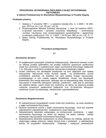 PROCEDURA UZYSKIWANIA ZWOLNIEŃ Z ZAJĘĆ WYCHOWANIA FIZYCZNEGO w Szkole Podstawowej im Stanisława Wyspiańskiego w Porębie Żegoty Podstawa prawna: 1. Ustawa z 7 września 1991 r. o systemie oświaty (Dz. U. z 2004 r. Nr 256, poz. 2572 ze zm.): art. 39 ust.1 pkt 5a 2. Rozporządzenie Ministra Edukacji Narodowej z dnia 30 kwietnia 2007r. w sprawie warunków i sposobu oceniania, klasyfikacji i promowania uczniów i słuchaczy oraz przeprowadzania sprawdzianów i egzaminów w szkołach publicznych ( Dz. U. z 2007 r. Nr 83 poz. 562 ze zm.): §7, 8, 17 3. Statut Szkoły Podstawowej im. Stanisława Wyspiańskiego w Porębie Żegoty. Procedura postępowania: &1 Zwolnienia doraźne 1. W wyjątkowych sytuacjach (chwilowa niedyspozycja, zdarzenie losowe) uczeń na własną prośbę (pełnoletni) lub prośbę rodziców (prawnych opiekunów) może być zwolniony z pojedynczych zajęć wychowania fizycznego (załącznik 1,2). Decyzję o zwolnieniu podejmuje nauczyciel prowadzący zajęcia. 2. Uczeń zwolniony ma obowiązek przebywać na tych zajęciach pod opieką nauczyciela. Nauczyciel może wyrazić zgodę na przebywanie ucznia w bibliotece szkolnej, na świetlicy lub pod opieką innego nauczyciela, prowadzącego w tym czasie zajęcia dodatkowe. Uczeń ma obowiązek potwierdzić tam swoją obecność, wpisując się na odpowiednią listę. Wówczas nauczyciel w dzienniku lekcyjnym wpisuje „zwolniony”. Jeśli jest to pierwsza lub ostatnia lekcja, uczeń może być zwolniony do domu na pisemną prośbę rodziców (prawnych opiekunów) (załącznik 3,4). W dzienniku lekcyjnym zwolniony uczeń ma adnotację „nieobecność usprawiedliwiona”. &2 Zwolnienia długoterminowe 1. W uzasadnionych przypadkach uczeń może być zwolniony na czas określony z zajęć wychowania fizycznego . 2. Dłuższe zwolnienie ucznia z zajęć wychowania fizycznego musi być poparte odpowiednim zaświadczeniem wystawionym przez lekarza. 3. Zaświadczenie lekarskie wskazujące na konieczność zwolnienia z zajęć wychowania fizycznego na okres nie dłuższy niż jeden miesiąc należy przekazać nauczycielowi wychowania fizycznego. 4. Zaświadczenie lekarskie wystawione na okres dłuższy niż miesiąc, jednak nie obejmujący całego półrocza, należy złożyć wraz z podaniem w sekretariacie szkoły. W przypadku dostarczenia kolejnego / kolejnych zaświadczeń dyrektor szkoły wydaje decyzję o zwolnieniu ucznia z zajęć wychowania fizycznego na podstawie wszystkich zaświadczeń. 5. Zwolnienie może dotyczyć pierwszego, drugiego półrocza lub całego roku szkolnego w zależności od wskazań lekarza zawartych w zaświadczeniu o ograniczonych możliwościach uczestniczenia ucznia w zajęciach. 6. O zwolnienie ucznia z zajęć wychowania fizycznego występują rodzice ucznia (opiekunowie prawni). Rodzice składają podanie (załącznik nr 5,6) do dyrektora szkoły (w sekretariacie), do którego załączają zaświadczenie lekarskie. 7. Podanie należy przedłożyć dyrektorowi niezwłocznie po uzyskaniu zaświadczenia od lekarza, jednak nie później niż: w przypadku zwolnienia dotyczącego I półrocza lub całego roku szkolnego - do 30 września danego roku szkolnego, w przypadku zwolnienia dotyczącego II półrocza - do 28 lutego danego roku szkolnego. W przypadku zdarzeń losowych i zaświadczeń lekarskich wystawionych w ciągu roku szkolnego rodzice (prawni opiekunowie) lub samodzielnie uczeń składają podania poza ustalonymi wyżej terminami, jednak niezwłocznie po uzyskaniu zaświadczenia lekarskiego. 8. Zaświadczenie lekarskie zwalniające ucznia z ćwiczeń z wsteczną datą będzie respektowane od daty wystawienia zaświadczenia. 9. Zwolnienie niedostarczone w terminie będzie ważne od daty jego złożenia w sekretariacie. 10. Dyrektor szkoły wydaje decyzje o zwolnieniu ucznia z zajęć w terminie do 7 dni roboczych od daty wpływu podania (załącznik 7). Rodzice ucznia (opiekunowie prawni) odbierają decyzję dyrektora w sekretariacie szkoły. 11. W przypadku decyzji odmownej rodzice ucznia (opiekunowie prawni) mogą się odwołać za pośrednictwem dyrektora do Małopolskiego Kuratora Oświaty. 12. O zwolnieniu ucznia z zajęć poinformowany zostaje nauczyciel prowadzący zajęcia oraz wychowawca ucznia. Fakt przyjęcia informacji do wiadomości potwierdzają podpisem złożonym na decyzji. 13. Jeżeli uczeń uzyskuje zwolnienie w trakcie roku szkolnego, a jego nieobecności na lekcjach nie przekroczyły połowy wymaganego czasu i są podstawy do wystawienia oceny, to wówczas uczeń podlega klasyfikacji z przedmiotu. 14. W przypadku zwolnienia ucznia z zajęć wychowania fizycznego przez całe półrocze w dokumentacji przebiegu nauczania, zamiast oceny klasyfikacyjnej wpisuje się „zwolniony”. 15. Uczeń zwolniony z zajęć wychowania fizycznego ma obowiązek przebywać na tych zajęciach pod opieką nauczyciela. Nauczyciel może wyrazić zgodę na przebywanie ucznia w bibliotece szkolnej, na świetlicy lub pod opieką innego nauczyciela, prowadzącego w tym czasie zajęcia dodatkowe. Uczeń ma obowiązek potwierdzić tam swoją obecność, wpisując się na odpowiednią listę. Wówczas nauczyciel w dzienniku lekcyjnym wpisuje „zwolniony”. 16. W szczególnych przypadkach, gdy lekcje te są pierwszymi lub ostatnimi zajęciami w danym dniu, uczeń może być z nich zwolniony na podstawie pisemnego oświadczenia rodziców (opiekunów prawnych) (załącznik 7,8) złożonego w sekretariacie szkoły i po uzyskaniu zgody dyrektora szkoły. O tym fakcie informowani są nauczyciel wychowania fizycznego oraz wychowawca klasy. 17. Uczeń zwalniany z zajęć do domu ma zaznaczoną w dzienniku lekcyjnym „nieobecność usprawiedliwioną”. Zwolnienia z części ćwiczeń &3 1. Zawarte w zaświadczeniu lekarskim ewentualne ograniczenia, skutkujące zwolnieniem z wykonywania grupy ćwiczeń, nie są podstawą do zwolnienia ucznia z zajęć wychowania fizycznego. Takie zaświadczenie skład