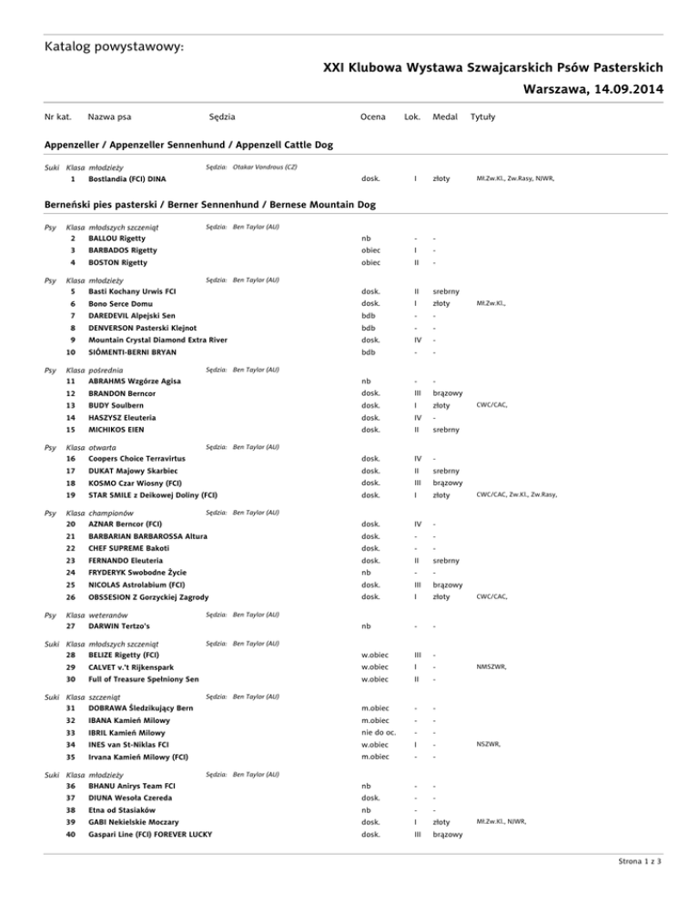 Katalog powystawowy: XXI Klubowa Wystawa Szwajcarskich Psów Pasterskich Warszawa, 14.09.2014 Nr kat. Sędzia Nazwa psa Ocena Lok. Medal Tytuły Appenzeller / Appenzeller Sennenhund / Appenzell Cattle Dog Suki Klasa młodzieży 1 Bostlandia (FCI) DINA Sędzia: Otakar Vondrous (CZ) dosk. I złoty - Mł.Zw.Kl., Zw.Rasy, NJWR, Berneński pies pasterski / Berner Sennenhund / Bernese Mountain Dog Psy Psy Klasa młodszych szczeniąt 2 BALLOU Rigetty nb - 3 BARBADOS Rigetty obiec I - 4 BOSTON Rigetty obiec II - Klasa młodzieży 5 Basti Kochany Urwis FCI Psy Psy dosk. II srebrny Bono Serce Domu dosk. I złoty 7 DAREDEVIL Alpejski Sen bdb - - 8 DENVERSON Pasterski Klejnot bdb - - 9 Mountain Crystal Diamond Extra River dosk. IV - SIÓMENTI-BERNI BRYAN bdb - - Klasa pośrednia 11 ABRAHMS Wzgórze Agisa nb - - BRANDON Berncor dosk. III brązowy 13 BUDY Soulbern dosk. I złoty 14 HASZYSZ Eleuteria dosk. IV - 15 MICHIKOS EIEN dosk. II srebrny - Klasa otwarta 16 Coopers Choice Terravirtus dosk. IV DUKAT Majowy Skarbiec dosk. II srebrny 18 KOSMO Czar Wiosny (FCI) dosk. III brązowy 19 STAR SMILE z Deikowej Doliny (FCI) dosk. I złoty dosk. IV - dosk. - - 22 CHEF SUPREME Bakoti dosk. - 23 FERNANDO Eleuteria dosk. II srebrny 24 FRYDERYK Swobodne Życie nb - - 25 NICOLAS Astrolabium (FCI) dosk. III brązowy 26 OBSSESION Z Gorzyckiej Zagrody dosk. I złoty nb - - Suki Klasa młodszych szczeniąt 28 BELIZE Rigetty (FCI) Sędzia: Ben Taylor (AU) w.obiec III - CALVET v.'t Rijkenspark w.obiec I - 30 Full of Treasure Spełniony Sen w.obiec II - 32 m.obiec - - m.obiec - - 33 IBRIL Kamień Milowy nie do oc. - - 34 INES van St-Niklas FCI w.obiec I - 35 Irvana Kamień Milowy (FCI) m.obiec - - 37 NMSZWR, Sędzia: Ben Taylor (AU) IBANA Kamień Milowy Suki Klasa młodzieży 36 BHANU Anirys Team FCI CWC/CAC, Sędzia: Ben Taylor (AU) 29 Suki Klasa szczeniąt 31 DOBRAWA Śledzikujący Bern CWC/CAC, Zw.Kl., Zw.Rasy, Sędzia: Ben Taylor (AU) BARBARIAN BARBAROSSA Altura Klasa weteranów 27 DARWIN Tertzo's CWC/CAC, Sędzia: Ben Taylor (AU) 17 Klasa championów 20 AZNAR Berncor (FCI) Mł.Zw.Kl., Sędzia: Ben Taylor (AU) 12 21 Psy Sędzia: Ben Taylor (AU) 6 10 Psy Sędzia: Ben Taylor (AU) NSZWR, Sędzia: Ben Taylor (AU) DIUNA Wesoła Czereda nb - - dosk. - - 38 Etna od Stasiaków nb - - 39 GABI Nekielskie Moczary dosk. I złoty 40 Gaspari Line (FCI) FOREVER LUCKY dosk. III brązowy Mł.Zw.Kl., NJWR, Strona 1 z 3 Nr kat. Sędzia Nazwa psa Ocena Lok. Medal 41 GITANA Nekielskie Moczary dosk. - 42 HANKA CICHA NADZIEJA dosk. II srebrny 43 HAVANA BERSETT dosk. - - - 44 MAFIA pod Szmaragdową Leszczyną dosk. IV - 45 PAMIRA FOERVER u Źródeł Wisły dosk. - - 46 TEQUILA Pogońska Perła bdb - - 47 Toskania Astrolabium FCI dosk. - - Suki Klasa pośrednia 48 ARWENA Wzgórze Agisa Sędzia: Ben Taylor (AU) dosk. - - 49 BAMBI Soulbern (FCI) dosk. I złoty 50 GRIZELL Swobodne Życie (FCI) dosk. IV - 51 NIGHT ILLUSION van St-Niklas dosk. II srebrny 52 VALENTINE'S AMAZING MIRACLE Magia Berna bdb - - 53 WIRGINIA z Gorzyckiej Zagrody dosk. III brązowy dosk. II srebrny dosk. III brązowy Suki Klasa otwarta 54 ARIADNA Osada Fabryczna 55 56 DEA Canis Magnus dosk. - - 57 GLORIA znad Grinfelda dosk. IV - 58 GORI STRÓŻ ZAGRODY dosk. I złoty 59 IBIZA Rokada dosk. - - 60 Jokasta z Deikowej Doliny bdb - - 61 LUCY RAJSKA RAPSODIA dosk. - - 62 MAERE Galijska Osada dosk. - - 64 dosk. - - dosk. - brązowy 65 DODA Bersett dosk. III 66 GRACJA van St-Niklas dosk. II srebrny 67 GUGA CICHA NADZIEJA dosk. IV - 68 HARMONIA Berneńskie Ranczo nb - - 69 LUSI Berneńskie Szczęście dosk. I złoty 70 Walkiria Consensus dosk. - - dosk. I złoty dosk. IV - 72 CWC/CAC, Sędzia: Ben Taylor (AU) Bright Alpejska Kraina Szczęścia Suki Klasa weteranów 71 Aninbernus ELEONORA CWC/CAC, Sędzia: Ben Taylor (AU) Beastie Bianka Majowy Skarbiec Suki Klasa championów 63 ANABELLA Wesoła Czereda Tytuły CWC/CAC, Zw.Kl., BOS, Sędzia: Ben Taylor (AU) Aura Z Łowickiego Księstwa 73 BASMA des Hautes Vernades dosk. III brązowy 74 DIUNA Cicha Nadzieja dosk. II srebrny NWWR, Duży szwajcarski pies pasterski / Grosser Schweizer Sennenhund / Great Swiss Mountain Dog Psy Psy Klasa szczeniąt 75 ADORR Jaćwingowy Gród obiec III - 76 ARAGON FLAMMADORA w.obiec II - 77 Morris Złota Nimfa (FCI) w.obiec I - Klasa młodzieży 78 BAHAR Refugium Polonica 79 Psy 83 Psy dosk. II srebrny dosk. I złoty dosk. II srebrny dosk. I złoty CWC/CAC, Sędzia: Otakar Vondrous (CZ) BONZO Czandoria dosk. II srebrny dosk. IV - 84 Meafiton Cargo Atumtinas dosk. III brązowy 85 WOBLER Caveat Actor dosk. I złoty - Klasa championów 86 Agnarr Mł.Zw.Kl., NJWR, Sędzia: Otakar Vondrous (CZ) KRONOS Skarb Marysieńki Klasa otwarta 82 AMON vom Bahnhofstrassle NSZWR, Sędzia: Otakar Vondrous (CZ) MANITOU Pup'n'Roll (FCI) Klasa pośrednia 80 BORT Refugium Polonica (FCI) 81 Psy Sędzia: Otakar Vondrous (CZ) CWC/CAC, Sędzia: Otakar Vondrous (CZ) dosk. - 87 Astor Festina Lente dosk. II srebrny 88 FREDDY Złota Nimfa dosk. IV - 89 Korona Rossii NOBEL dosk. I złoty 90 ROAD TO HELVETIA FRANE dosk. III brązowy CWC/CAC, Zw.Kl., BOS, Strona 2 z 3 Nr kat. Nazwa psa Sędzia Suki Klasa szczeniąt 91 Anda Jaćwingowy Gród Sędzia: Otakar Vondrous (CZ) Suki Klasa młodzieży 92 Isabel Lucky Swiss Sędzia: Otakar Vondrous (CZ) Ocena Lok. obiec I Medal Tytuły - Mł.Zw.Kl., dosk. I złoty 93 SAWA Caveat Actor (FCI ) dosk. III brązowy 94 SHIRA CAVEAT ACTOR dosk. II srebrny dosk. I złoty CWC/CAC, dosk. I złoty CWC/CAC, dosk. I złoty CWC/CAC, Zw.Kl., Zw.Rasy, dosk. I złoty NWWR, w.obiec II - w.obiec I - NSZWR, dosk. I złoty Mł.Zw.Kl., Zw.Rasy, NJWR, dosk. I złoty CWC/CAC, Zw.Kl., dosk. I złoty CWC/CAC, Zw.Kl., BOS, dosk. I złoty CWC/CAC, Sędzia: Otakar Vondrous (CZ) Suki Klasa pośrednia 95 Berenika Refugium Polonica (FCI) Suki Klasa otwarta 96 JOKASTA Żorska Prima FCI Sędzia: Otakar Vondrous (CZ) Sędzia: Otakar Vondrous (CZ) Suki Klasa championów 97 Festina Lente Tsarskaya Osoba Suki Klasa weteranów 98 Hester