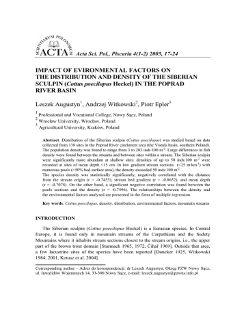 Acta Sci. Pol., Piscaria 4(1-2) 2005, 17-24 IMPACT OF EVIRONMENTAL FACTORS ON THE DISTRIBUTION AND DENSITY OF THE SIBERIAN SCULPIN (Cottus poecilopus Heckel) IN THE POPRAD RIVER BASIN Leszek Augustyn1, Andrzej Witkowski2, Piotr Epler3 1 Professional and Vocational College, Nowy Sącz, Poland Wrocáaw University, Wrocáaw, Poland 3 Agricultural University, Kraków, Poland 2 Abstract. Distribution of the Siberian sculpin (Cottus poecilopus) was studied based on data collected from 138 sites in the Poprad River catchment area (the Vistula basin, southern Poland). The population density was found to range from 3 to 203 inds·100 m-2. Large differences in fish density were found between the streams and between sites within a stream. The Siberian sculpin were significantly more abundant at shallow sites: densities of up to 50 inds·100 m-2 were recorded at sites of mean depth <15 cm. In low gradient stream sections (<25 m·km-1) with numerous pools (>50% bed surface area), the density exceeded 50 inds·100 m-2. The species density was statistically significantly, negatively correlated with the distance from the stream origin (r = -0.7453), stream bed gradient (r = -0.8652), and mean depth (r = -0.7078). On the other hand, a significant negative correlation was found between the pools sections and the density (r = -0.7496). The relationships between the density and the environmental factors analysed are presented in the form of multiple regression. Key words: Cottus poecilopus, density, distribution, environmental factors, mountain streams INTRODUCTION The Siberian sculpin (Cottus poecilopus Heckel) is a Eurasian species. In Central Europe, it is found only in mountain streams of the Carpathians and the Sudety Mountains where it inhabits stream sections closest to the stream origins, i.e., the upper part of the brown trout domain [Starmach 1965, 1972, ýihaĜ 1969]. Outside that area, a few lacustrine sites of the species have been reported [Duncker 1925, Witkowski 1984, 2001, Kotusz et al. 2004]. Corresponding author – Adres do korespondencji: dr Leszek Augustyn, OkrĊg PZW Nowy Sącz, ul. Inwalidów Wojennnych 14, 33-300 Nowy Sącz, e-mail: [email protected] 18 L. Augustyn, A. Witkowski, P. Epler Besides taxonomy [Starmach 1972, Witkowski 1979] and genetics [PaĞko and MaĞlak 2003], research on C. poecilopus focusws on its interactions with the brown trout [Olsen and Vøllestad 2001, 2003, Hesthagen and Heggenes 2003, Holmen et al. 2003, Hesthagen et al. 2004 a,b]. The Siberian sculpin is a demersal species: during the day, the fish stay hidden under boulders and fallen trees [Witkowski 2005], which – in connection with their cryptic coloration [Zalewski 1986] and specific resistance to electric field [Barrett and Grossman 1988] – renders them hard to catch by electrofishing. This is the reason why papers on distribution of C. poecilopus along a stream profile as well as on density, biomass, and habitat preferences in streams and lakes are scant [Holmen et al. 2003, Kotusz et al. 2004]. The present study was aimed at identifying the environmental factors controlling the highest densities of C. poecilopus in streams of the Poprad River basin (southern Poland). MATERIAL AND METHODS The present study on the Siberian sculpin was conducted within the framework of the monitoring of the River Poprad basin fish fauna [Augustyn 2004]. A total of 138 sites, each 100-m long, were surveyed in 17 streams. The sites were located in 5 firstorder streams (Baraniecki, Izwor, Rohacz, Wapiennik, and Maáa àomnica), in 6 secondorder streams (Máodowski, Maáa Wierchomla, CzerteĪ, Potasznia, Kokuszka, and Szczawniczek), and in 6 third- and fourth-order ones (Maáa Roztoka, Wielka Roztoka, Rzeczanowski, Przysietnicki, Szczawnik, and àomniczanka) (Table 1; Fig. 1). The streams drain of the Radziejowa (1.262 m asl) and Jaworzyna Krynicka (1.114 m asl) mountain ranges in the Beskid Sądecki area. The major ranges are accompanied by lower hills (650-800 m asl) resembling a high piedmont area; they slope down, step-wise, towards the Poprad valley. Beds of the streams surveyed incise the flysch of the Magura nappe made up by thickbedded sandstones intersected by shale bands. The small (2-3 km2), totally (100%) forested, drainage areas of the streams suffer no flood surges. Therefore the beds feature boulders and fallen trees forming numerous (3-6·m-2) refuges utilised by the fish. At all the sites, C. poecilopus occurred sympatrically with the brown trout (Salmo trutta m. fario) [Augustyn et al. 1996, Augustyn 1999]. The Siberian sculpin were electrofished with an IUP-12 device, two harvesting operations being conducted at each site. The fish density was calculated using the CarleStrub method [Cowx 1983]. The following variables were determined at each site: distance from the stream origin (km); gradient (m·km-1); altitude (m asl); pool index, i.e., pool surface expressed as a percentage of the total stream surface (%); mean width and depth (cm); and the Siberian sculpin density (inds 100 m2) (Table 1). Acta Sci. Pol. Impact of evironmental factors… 19 Table 1. Site characteristics in individual streams Tabela 1. Charakterystyka stanowisk w poszczególnych potokach Number Nr Stream name Nazwy potoków Distance from origins OdlegáoĞü od Ĩródeá km m · km-1 m % m cm 001-100 011-200 21-26 27-36 37-46 47-56 57-61 62-71 72-78 79-88 89-91 092-101 102-104 105-114 115-124 125-128 129-138 Szczawniczek Szczawnik Baraniecki Maáa Wierchomla Potasznia Izwor Wapiennik àomniczanka CzerteĪ Maáa àomnica Rohacz Kokuszka Máodowski Maáa Roztoka Wielka Roztoka Rzeczanowski Przysietnicki 1.9-2.9 5.8-6.8 1.5-2.5 3.1-4.1 5.9-4.9 1.7-2.7 2.4-2.9 3.0-4.0 2.1-2.8 2.6-3.6 2.9-2.6 0.8-1.8 3.0-3.3 3.9-4.9 4.9-5.9 3.5-6.6 2.7-3.7 065-110 045-850 090-145 35-45 05-30 070-155 075-110 115-175 090-110 50-70 095-100 115-135 75-95 25-75 65-95 060-115 45-80 750-685 670-625 640-550 590-555 535-515 630-560 550-480 725-610 690-600 570