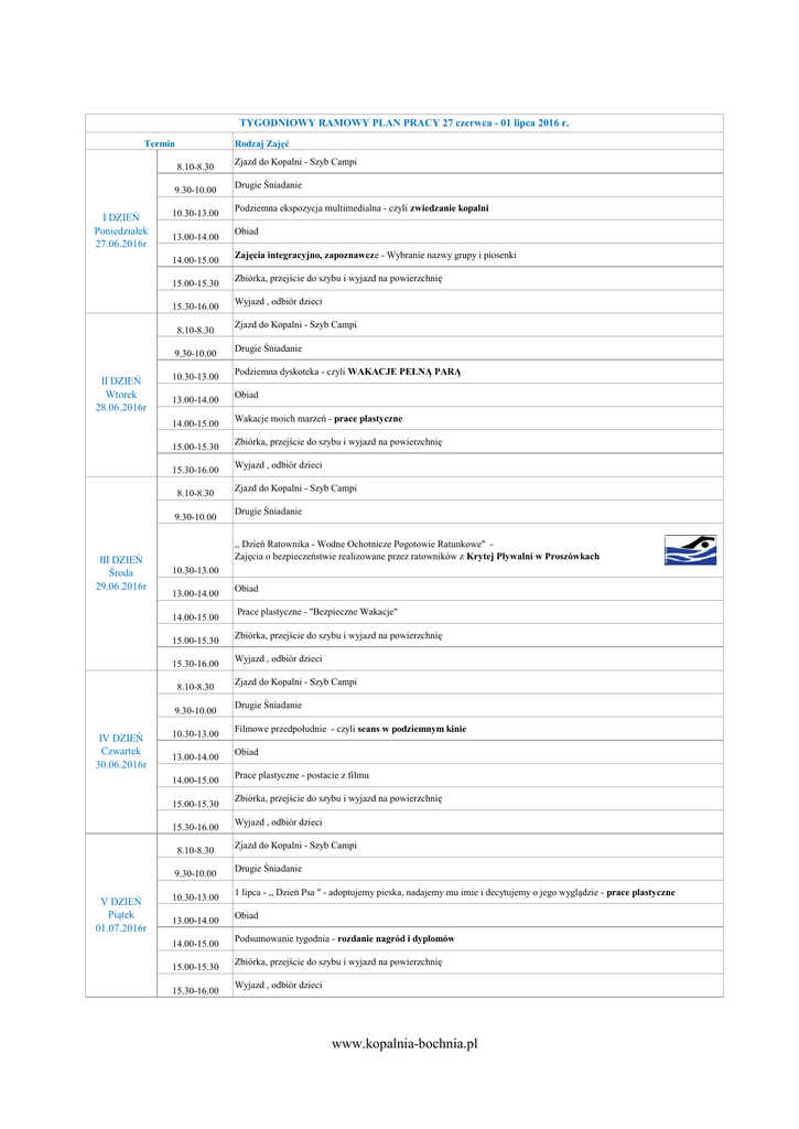 TYGODNIOWY RAMOWY PLAN PRACY 27 czerwca - 01 lipca 2016 r. Rodzaj Zajęć Termin 8.10-8.30 9.30-10.00 I DZIEŃ Poniedziałek 27.06.2016r 10.30-13.00 13.00-14.00 14.00-15.00 15.00-15.30 15.30-16.00 8.10-8.30 9.30-10.00 II DZIEŃ Wtorek 28.06.2016r 10.30-13.00 13.00-14.00 14.00-15.00 15.00-15.30 15.30-16.00 8.10-8.30 9.30-10.00 III DZIEŃ Środa 29.06.2016r Podziemna ekspozycja multimedialna - czyli zwiedzanie kopalni Obiad Zajęcia integracyjno, zapoznawcze - Wybranie nazwy grupy i piosenki Zbiórka, przejście do szybu i wyjazd na powierzchnię Wyjazd , odbiór dzieci Zjazd do Kopalni - Szyb Campi Drugie Śniadanie Podziemna dyskoteka - czyli WAKACJE PEŁNĄ PARĄ Obiad Wakacje moich marzeń - prace plastyczne Zbiórka, przejście do szybu i wyjazd na powierzchnię Wyjazd , odbiór dzieci Zjazd do Kopalni - Szyb Campi Drugie Śniadanie 10.30-13.00 13.00-14.00 15.00-15.30 15.30-16.00 8.10-8.30 9.30-10.00 10.30-13.00 13.00-14.00 14.00-15.00 15.00-15.30 15.30-16.00 8.10-8.30 9.30-10.00 V DZIEŃ Piątek 01.07.2016r Drugie Śniadanie ,, Dzień Ratownika - Wodne Ochotnicze Pogotowie Ratunkowe" Zajęcia o bezpieczeństwie realizowane przez ratowników z Krytej Pływalni w Proszówkach 14.00-15.00 IV DZIEŃ Czwartek 30.06.2016r Zjazd do Kopalni - Szyb Campi 10.30-13.00 13.00-14.00 14.00-15.00 15.00-15.30 15.30-16.00 Obiad Prace plastyczne - "Bezpieczne Wakacje" Zbiórka, przejście do szybu i wyjazd na powierzchnię Wyjazd , odbiór dzieci Zjazd do Kopalni - Szyb Campi Drugie Śniadanie Filmowe przedpołudnie - czyli seans w podziemnym kinie Obiad Prace plastyczne - postacie z filmu Zbiórka, przejście do szybu i wyjazd na powierzchnię Wyjazd , odbiór dzieci Zjazd do Kopalni - Szyb Campi Drugie Śniadanie 1 lipca - ,, Dzień Psa " - adoptujemy pieska, nadajemy mu imie i decytujemy o jego wyglądzie - prace plastyczne Obiad Podsumowanie tygodnia - rozdanie nagród i dyplomów Zbiórka, przejście do szybu i wyjazd na powierzchnię Wyjazd , odbiór dzieci www.kopalnia-bochnia.pl TYGODNIOWY RAMOWY PLAN PRACY 04 lipiec - 08 lipca 2016 r. Rodzaj Zajęć Termin 8.10-8.30 9.30-10.00 I DZIEŃ Poniedziałek 04.07.2016r 10.30-13.00 13.00-14.00 14.00-15.00 15.00-15.30 15.30-16.00 II DZIEŃ Wtorek 05.07.2016r Obiad W zdrowym ciele zdrowy duch - zabawy ruchowe i ćwiczenia gimnastyczne Zbiórka, przejście do szybu i wyjazd na powierzchnię Wyjazd, odbiór dzieci 9.30-10.00 Drugie Śniadanie 10.00-13.00 Olimpiada sportowa 13.00-14.00 15.30-16.00 8.10-8.30 9.30-10.00 10.30-13.00 13.00-14.00 14.00-15.00 15.00-15.30 15.30-16.00 8.10-8.30 9.30-10.00 10.30-13.00 13.00-14.00 14.00-15.00 15.00-15.30 15.30-16.00 8.10-8.30 9.30-10.00 V DZIEŃ Piątek 08.07.2016r Podziemna Ekspozycja Multimedialna – czyli zwiedzanie kopalni Zjazd do Kopalni - Szyb Campi 15.00-15.30 IV DZIEŃ Czwartek 07.07.2016r Drugie Śniadanie 8.10-8.30 14.00-15.00 III DZIEŃ Środa 06.07.2016r Zjazd do Kopalni - Szyb Campi 10.30-13.00 13.00-14.00 14.00-15.00 15.00-15.30 15.30-16.00 Obiad Pływamy pomiędzy solnymi górami – czyli Podziemna Przeprawa Łodzią Zbiórka, przejście do szybu i wyjazd na powierzchnię Wyjazd , odbiór dzieci Zjazd do Kopalni - Szyb Campi Drugie Śniadanie Filmowe przedpołudnie – czyli seans w podziemnym kinie Obiad Zajęcia ruchowe Zbiórka, przejście do szybu i wyjazd na powierzchnię Wyjazd , odbiór dzieci Zjazd do Kopalni - Szyb Campi Drugie Śniadanie Podziemna Dyskoteka Obiad Swobodna zabawa wg zainteresowań dzieci (plac zabaw) Zbiórka, przejście do szybu i wyjazd na powierzchnię Wyjazd , odbiór dzieci Zjazd do Kopalni - Szyb Campi Drugie Śniadanie Tworzymy wielki ocean - prace plastyczne Obiad Podsumowanie tygodnia - rozdanie nagród i dyplomów Zbiórka, przejście do szybu i wyjazd na powierzchnię Wyjazd , odbiór dzieci www.kopalnia-bochnia.pl TYGODNIOWY RAMOWY PLAN PRACY 11 lipiec - 15 lipca 2016 r. Rodzaj Zajęć Termin 8.10-8.30 9.30-10.00 I DZIEŃ Poniedziałek 11.07.2016r 10.30-13.00 13.00-14.00 14.00-15.00 15.00-15.30 15.30-16.00 II DZIEŃ Wtorek 12.07.2016r Obiad Burza mózgów - czyli wakacyjne rady Zbiórka, przejście do szybu i wyjazd na powierzchnię Wyjazd , odbiór dzieci 9.30-10.00 Drugie Śniadanie 10.00-13.00 Opowiedz mi bajkę - tworzymy własną historyjkę 13.00-14.00 15.30-16.00 8.10-8.30 9.30-10.00 10.30-13.00 13.00-14.00 14.00-15.00 15.00-15.30 15.30-16.00 8.10-8.30 9.30-10.00 10.30-13.00 13.00-14.00 14.00-15.00 15.00-15.30 15.30-16.00 8.10-8.30 9.30-10.00 V DZIEŃ Piątek 15.07.2016r Podziemna ekspozycja multimedialna - czyli zwiedzanie kopalni Zjazd do Kopalni - Szyb Campi 15.00-15.30 IV DZIEŃ Czwartek 14.07.2016r Drugie Śniadanie 8.10-8.30 14.00-15.00 III DZIEŃ Środa 13.07.2016r Zjazd do Kopalni - Szyb Campi 10.30-13.00 13.00-14.00 14.00-15.00 15.00-15.30 15.30-16.00 Obiad Podziemna przeprawa łodzią Zbiórka, przejście do szybu i wyjazd na powierzchnię Wyjazd , odbiór dzieci Zjazd do Kopalni - Szyb Campi Drugie Śniadanie Podziemna dyskoteka Obiad Zajęcia plastyczne Zbiórka, przejście do szybu i wyjazd na powierzchnię Wyjazd , odbiór dzieci Zjazd do Kopalni - Szyb Campi Drugie Śniadanie Filmowe przedpołudnie – czyli seans w podziemnym kinie Obiad Zajęcia twórcze Zbiórka, przejście do szybu i wyjazd na powierzchnię Wyjazd , odbiór dzieci Zjazd do Kopalni - Szyb Campi Drugie Śniadanie Zajęcia manualne - „Śmieszny Balon” Obiad Podsumowanie tygodnia - rozdanie nagród i dyplomów Zbiórka, przejście do szybu i wyjazd na powierzchnię Wyjazd , odbiór dzieci www.kopalnia-bochnia.pl TYGODNIOWY RAMOWY PLAN PRACY 18 lipca - 22 lipca 2016 r. Rodzaj Zajęć Termin 8.10-8.30 9.30-10.00 I DZIEŃ Poniedziałek 18.07.2016r 10.30-13.00 13.00-14.00 14.00-15.00 15.00-15.30 15.30-16.00 II DZIEŃ Wtorek 19.07.2016r Drugie Śniadanie Podziemna ekspozycja multimedialna - czyli zwiedzanie kopalni Obiad Zajęcia integracyjne - Wybranie nazwy grupy i piosenki Zbiórka, przejście do szybu i wyjazd na powierzchnię Wyjazd , odbiór dzieci 8.10-8.30 Zjazd do K