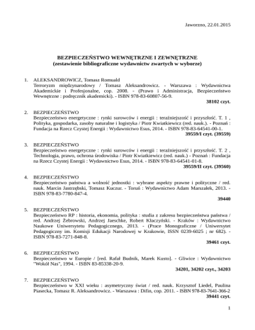 Jaworzno, 22.01.2015 BEZPIECZEŃSTWO WEWNĘTRZNE I ZEWNĘTRZNE (zestawienie bibliograficzne wydawnictw zwartych w wyborze) 1. ALEKSANDROWICZ, Tomasz Romuald Terroryzm międzynarodowy / Tomasz Aleksandrowicz. - Warszawa : Wydawnictwa Akademickie i Profesjonalne, cop. 2008. - (Prawo i Administracja, Bezpieczeństwo Wewnętrzne : podręcznik akademicki). - ISBN 978-83-60807-56-9. 38102 czyt. 2. BEZPIECZEŃSTWO Bezpieczeństwo energetyczne : rynki surowców i energii : teraźniejszość i przyszłość. T. 1 , Polityka, gospodarka, zasoby naturalne i logistyka / Piotr Kwiatkiewicz (red. nauk.). - Poznań : Fundacja na Rzecz Czystej Energii : Wydawnictwo Esus, 2014. - ISBN 978-83-64541-00-1. 39559/I czyt. (39559) 3. BEZPIECZEŃSTWO Bezpieczeństwo energetyczne : rynki surowców i energii : teraźniejszość i przyszłość. T. 2 , Technologia, prawo, ochrona środowiska / Piotr Kwiatkiewicz (red. nauk.) - Poznań : Fundacja na Rzecz Czystej Energii : Wydawnictwo Esus, 2014. - ISBN 978-83-64541-01-8. 39559/II czyt. (39560) 4. BEZPIECZEŃSTWO Bezpieczeństwo państwa a wolność jednostki : wybrane aspekty prawne i polityczne / red. nauk. Marcin Jastrzębski, Tomasz Kuczur. - Toruń : Wydawnictwo Adam Marszałek, 2013. ISBN 978-83-7780-847-4. 39440 5. BEZPIECZEŃSTWO Bezpieczeństwo RP : historia, ekonomia, polityka : studia z zakresu bezpieczeństwa państwa / red. Andrzej Żebrowski, Andrzej Jaeschke, Robert Kłaczyński. - Kraków : Wydawnictwo Naukowe Uniwersytetu Pedagogicznego, 2013. - (Prace Monograficzne / Uniwersytet Pedagogiczny im. Komisji Edukacji Narodowej w Krakowie, ISSN 0239-6025 ; nr 682). ISBN 978-83-7271-848-8. 39461 czyt. 6. BEZPIECZEŃSTWO Bezpieczeństwo w Europie / [red. Rafał Budnik, Marek Kusto]. - Gliwice : Wydawnictwo "Wokół Nas", 1994. - ISBN 83-85338-20-9. 34201, 34202 czyt., 34203 7. BEZPIECZEŃSTWO Bezpieczeństwo w XXI wieku : asymetryczny świat / red. nauk. Krzysztof Liedel, Paulina Piasecka, Tomasz R. Aleksandrowicz. - Warszawa : Difin, cop. 2011. - ISBN 978-83-7641-366-2 39441 czyt. 1 8. BEZPIECZEŃSTWO Bezpieczeństwo wewnętrzne państwa : wybrane zagadnienia / red. nauk. Stanisław Sulowski, Michał Brzeziński. - Warszawa : Dom Wydawniczy Elipsa, 2009. - ISBN 978-83-7151-846-1. 39442 czyt. 9. CIUPIŃSKI, Andrzej Wspólna Polityka Bezpieczeństwa i Obrony Unii Europejskiej : geneza, rozwój, funkcjonowanie / Andrzej Ciupiński. - Warszawa : Difin, 2013. - ISBN 978-83-7641-881-0. 39469 czyt. 10. CZAPUTOWICZ, Jacek Teorie stosunków międzynarodowych : krytyka i systematyzacja / Jacek Czaputowicz. Warszawa : Wydawnictwo Naukowe PWN, 2007. - ISBN 978-83-01-14911-6. 37874 czyt. 11. CZIOMER, Erhard Zarys współczesnych stosunków międzynarodowych / Erhard Cziomer, Lubomir W. Zyblikiewicz. - Wyd. 2 rozsz. i uaktual. – Warszawa-Kraków : Wydawnictwo Naukowe PWN, 2005. - ISBN 83-01-14541-2. 36811 czyt. 12. CZIOMER, Erhard Zarys współczesnych stosunków międzynarodowych / Erhard Cziomer, Lubomir W. Zyblikiewicz. - Warszawa : Wydaw. Naukowe PWN. Oddział, 2000. - ISBN 83-01-13230-2. 35721 13. FUKUYAMA, Francis Budowanie państwa : władza i ład międzynarodowy w XXI wieku / Francis Fukuyama ; przekł. Jacek Serwański. - Poznań : Dom Wydawniczy Rebis, 2005. - ISBN 83-7301-595-7. 36795 14. KACZMAREK, Julian NATO – Europa – Polska / Julian Kaczmarek, Adam Skowroński. – Wrocław : Atla2, 1997. – ISBN 83-86882-75-1. 35069 czyt. 15. MAŁY Mały słownik stosunków międzynarodowych / pod red. Grażyny Michałowskiej. – Wyd. 3. – Warszawa : Wydawnictwa Szkole i Pedagogiczne, 1999. – ISBN 83-0207281-8. 35120 czyt. 16. MISIUK, Andrzej Administracja porządku i bezpieczeństwa publicznego : zagadnienia prawno-ustrojowe / Andrzej Misiuk. - Warszawa : Wydawnictwa Akademickie i Profesjonalne, cop. 2008. - (Prawo i Administracja, Bezpieczeństwo Wewnętrzne : podręcznik akademicki). - ISBN 978-83-60501-88-7 38086 czyt 17. MISIUK, Andrzej Historia policji w Polsce : od X wieku do współczesności / Andrzej Misiuk. - Warszawa : Wydawnictwa Akademickie i Profesjonalne, cop. 2008. - (Prawo i Administracja, Bezpieczeństwo Wewnętrzne : podręcznik akademicki). - ISBN 978-83-60807-02-6 38089 czyt 2 18. NOWAK, Eugeniusz Zarys teorii bezpieczeństwa narodowego / Eugeniusz Nowak, Maciej Nowak. - Warszawa : Difin, 2011. - (Zarządzanie Bezpieczeństwem). - ISBN 978-83-7641-485-0. 39472 czyt. 19. OBSZAR Obszar wolności, bezpieczeństwa i sprawiedliwości Unii Europejskiej : geneza, stan i perspektywy rozwoju / pod red. Filipa Jasińskiego i Katarzyny Smoter. - Warszawa : Urząd Komitetu Integracji Europejskiej, 2005. - ISBN 83-89972-52-2. 36908 20. POLITYCZNE Polityczne metody zwalczania terroryzmu / pod red. Krzysztofa Liedla, Joanny MarszałekKawy, Szymona Wudarskiego. - Toruń : Dom Wydawniczy Duet, cop. 2006. - Materiały z konferencji, która odbyła się 14 stycznia 2005 r. w Toruniu. - ISBN 83-89706-64-4. ISBN 978-83-89706-64-5. 37166 czyt. 21. SIENKIEWICZ-MAŁYJUREK, Katarzyna Zarządzanie kryzysowe w administracji publicznej : zarządzanie bezpieczeństwem / Katarzyna Sienkiewicz-Małyjurek, Franciszek R. Krynojewski. - Warszawa : Difin, cop. 2010. ISBN 978-83-7641-318-1. 38694 czyt. 22. SŁOMCZYŃSKA, Irma Europejska polityka bezpieczeństwa i obrony : uwarunkowania, struktury, funkcjonowanie / Irma Słomczyńska. - Lublin : Wydawnictwo Uniwersytetu Marii Curie-Skłodowskiej, 2007. ISBN 978-83-227-2716-4. 37670 czyt. 23. WSTĘP Wstęp do teorii polityki zagranicznej państwa / red. nauk. Ryszard Zięba. - Toruń : Wydawnictwo Adam Marszałek, cop. 2005. - ISBN 83-7441-129-5. 37121 24. WYBRANE Wybrane zagadnienia edukacji obronnej : skrypt dla studentów kierunku Pedagogika / pod red. Aleksandra Wojtczaka. – Mysłowice : Wydawnictwo GWSP, 2004. – ISBN 83-89032-45-7. 38818 czyt. 25. ZIĘBA, Ryszard Wspólna polityka zagraniczna i bezpieczeństwa Unii Europejskiej / Ryszard Zięba. Warszawa : Wydawnictwa Akademickie i Profesjonalne, cop. 2007. - (S