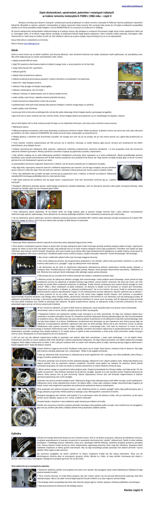 www.wild-sovietboxer.pl Zapis doświadczeń, spostrzeżeń, patentów i rozwiązań nabytych w trakcie remontu motocykla K-750M z 1966 roku – część II Niniejsza instrukcja jest zbiorem rozwiązań i praktycznych porad przydatnych w trakcie remontu motocykla K-750M jak również podobnych radzieckich bokserów. Wszystkie tu opisane „patenty" zastosowałem w trakcie restauracji mojej maszyny. Nie uzurpuję sobie prawa do nich gdyż w większości przypadków wiedzę na ich temat posiadłem dzięki Kolegom z Forum REDMOTORZ.EU za co jeszcze raz serdecznie im dziękuję. W ramach wdzięczności postanowiłem udokumentować je w jednym miejscu aby dostępne w archiwum forumowym mogły służyć innym zapaleńcom takim jak ja. Zastrzegam sobie, że w tekście mogą zdarzyć się błędy, za wytknięcie których będę jedynie wdzięczny i które możliwie szybko poprawię. Zastrzegam sobie również (bo to i takie czasy, że trzeba,) że jeśli np. ktoś młotkiem uderzy się w palca czytając moją instrukcję to ja za to nie odpowiadam. Życzę miłej lektury i powodzenia w remoncie, Marcin Dziopa [email protected] Silnik Silnik w ramie trzyma się na dwóch szpilkach, pod skrzynią (dłuższa) i pod cylindrami (krótsza) oraz dzięki uchwytowi cewki zapłonowej, tuż pod główką ramy. Aby silnik mógł spocząć na naszym warsztatowym stole, należy: • odpiąć przewód WN od cewki; • zdjąć filtr powietrza skontrowany dwiema śrubkami (uwaga może, a raczej powinien w nim być olej); • wyjąć odmy łączące filtr z gaźnikami; • odkręcić gaźniki; • odpiąć linkę od opóźniacza zapłonu; • odkręcić prądnicę przymocowaną opaskami i jednym dociskiem (o przewodach nie wspomnę); • wybić klin i zdjąć dźwignię startera; • odkręcić linkę sprzęgła od dźwigni wysprzęglika; • odkręcić uchwyt górny „ten od cewki",; • odkręcić uchwyty rur wydechowych, jest ich dwa po każdej stronie; • wybić szpilkę z pod skrzyni, odpadną również podnóżki kierowcy; • skręcić kierownicę maksymalnie w lewo lub w prawo; • podlewarować silnik pod miską olejową albo poprosić kolegów o zelżenie (mogą złapać za cylindry); • wybić szpilkę z pod cylindrów; • przesunąć silnik w kierunku przedniego koła, tak aby kły wałka zdawczego skrzyni biegów wyszły z gumowego sprzęgiełka; • gdy silnik stoi na stole, możemy zlać olej z kartelu silnika i skrzyni biegów (dobrze jest popatrzeć czy nic metalowego nie wypada z olejem). Jak już silnik będzie stał na stole możemy przejść do tego co nas najbardziej interesuje, czyli oceny stanu serducha naszej maszyny. • Wykręcamy świece. • Odkręcamy głowice (oczywiście, jeśli mamy dolaniaka), przykręconą ośmioma śrubami. Może się okazać, że głowica trzyma się mocno bez śrub, więc uderzamy ją młotkiem, ale tylko i wyłącznie GUMOWYM. Nie trzeba oznaczać lewej i prawej gdyż są niesymetryczne. • Między głowicą a cylindrem jest aluminiowa uszczelka. Do niczego ona nam się już nie przyda, ale po niej można poznać czy i gdzie były przedmuchy na zewnątrz. • Teraz również, możemy zaobserwować jak tłok porusza się w cylindrze, obracając za wałek zdawczy (gdy jeszcze skrzynia jest przykręcona) lub kołem zamachowym, przy odpiętej skrzyni. • Kolejną czynnością jest odkręcenie dekli zaworów i odkręcenie cylindrów, przykręconych sześcioma nakrętkami. I w tym przypadku może być koniecznie uderzenie młotkiem gumowym. Miedzy cylindrami a kartelem znajduje się papierowa uszczelka, niepotrzebna. • Gdy cylindry znajdują się na stole dokonujemy wszelkich niezbędnych pomiarów, które opisywane są w wielu publikacjach. Wynik prawidłowego pomiaru klasyfikuje nasze cylindry pod konkretny szlif. W tłoki możemy zaopatrzyć się w polskiej firmie Almot, ale i tego tematu nie będę rozwijał, gdyż na forum na temat pierścieni do nich dodawanych napisano już wiele. Ja zastosowałem pierścienie oryginalne dostarczone z tłokami i jak do tej pory wszystko jest w najlepszym porządku. • Aby zdjąć tłoki, wyjmujemy zawleczki sworznia i delikatnie wypychamy sam sworzeń. Jest do tego narzędzie, ale przy odrobinie sprytu można to zrobić bez tego. Poza tym jeśli sam sworzeń i panewka w której pracuje jest mocno zużyta to pójdzie szybko. • Teraz, aby swobodnie wyj ąć wałek rozrządu musimy wyj ąć popychacze wraz z tulejami, w których są osadzone. Odkręcamy nakrętkę M10 dociskającą podkładkę, która to znów dociska tuleje. • Całe tuleje powinny bez problemu dać się wyjąć razem z popychaczami. Stan tych elementów oceniamy wg np. „Ciężkich motocykli.. • Następnie odkręcamy pokrywę aparatu zapłonowego przykręconą nakrętką kołpakową. Jeśli nie planujemy wymiany całej szpilki mocującej pokrywę, radzę pilnować tej nakrętki, gdyż ma ona nietypowy gwint M8xl. • Teraz odkręcamy aparat zapłonowy. W tej kwestii wiele nie mogę napisać, gdyż w planach mojego remontu było z góry założone zainstalowanie elektronicznego aparatu zapłonowego. Samo dokręcenie nie stanowi większego problemu. Palec rozdzielacza przykręcony jest małą śrubką. • Jak już odejmiemy aparat zapłonowy, starannie odłożymy przepusty gumowe przewodów WN, możemy zdjąć pokrywę rozrządu przykręconą 10 śrubami M6. Zwrócicie uwagę, że cztery z tych śrub są w okolicy koła rozrządu są deko dłuższe niż pozostałe. • Zdejmując dekiel zdejmiemy również zaworek (to słoneczko) odmy odpowietrzającej kartel silnika. • Teraz płaskim śrubokrętem poprzez otwory w dużym kole rozrządu wykręcamy dwie śrubki trzymające gniazdo przedniej podpory wałka rozrządu i wyjmujemy ciągnąc do siebie za durze koło cały wałek rozrządu. Gdy wałeczek jest już na stole możemy wstępnie ocenić jego przydatność. Potrzebny nam będzie do tego mikrometr, aby zmierzyć rozmiar krzywek. Oczywiście